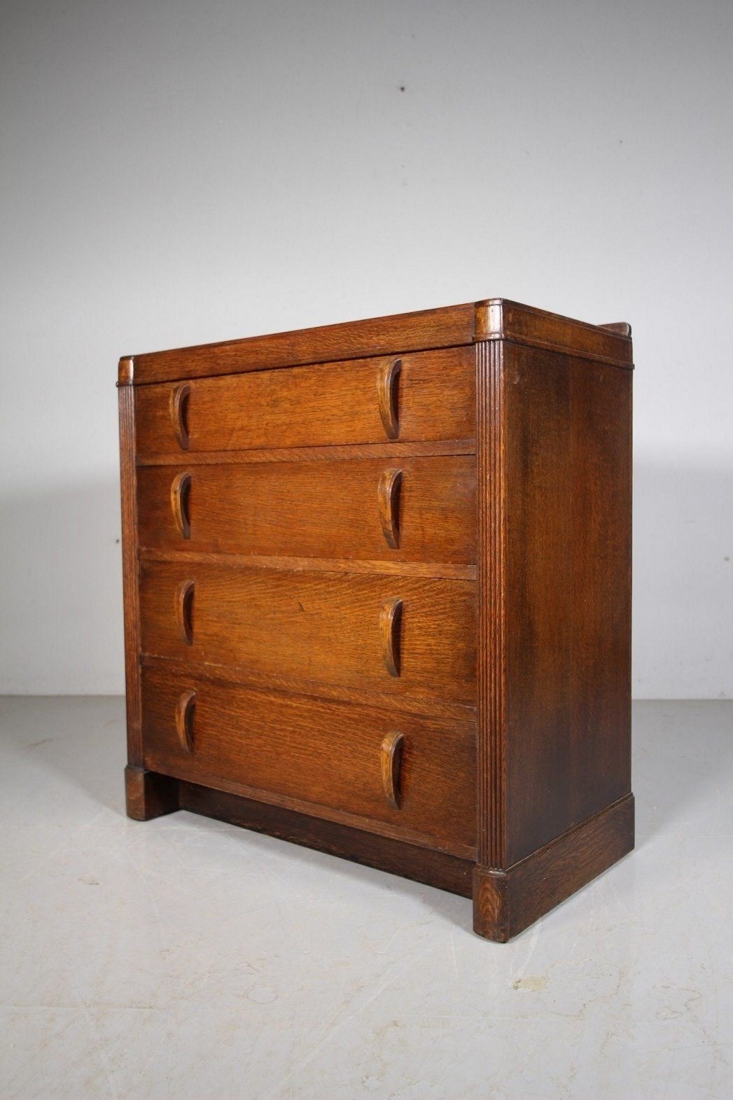 This is the rarer four drawer model of the Heals oak Odeon chest of drawers that dates from the thirties. This is a very original example in excellent clean condition. All four long drawers run smoothly and have the original oak handles. To each side of the drawers are reeded Odeon columns and this Heals chest stands on an inset plinth. In the original rich finish.