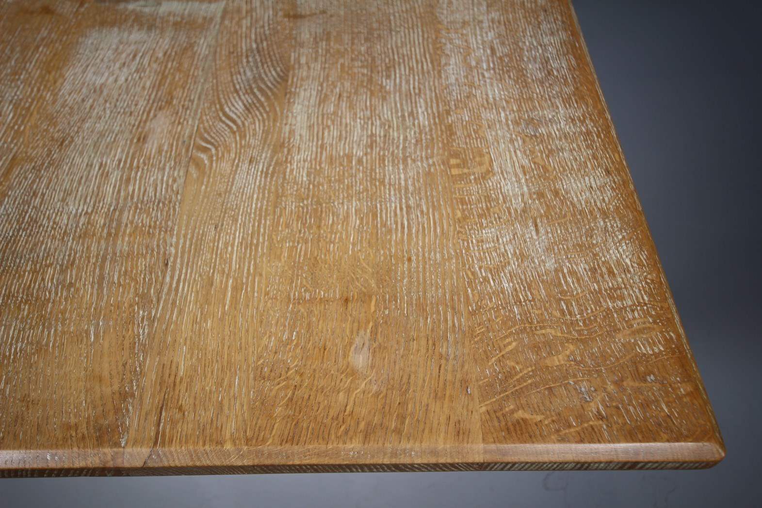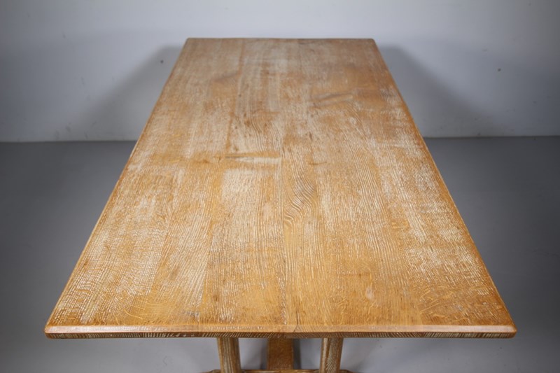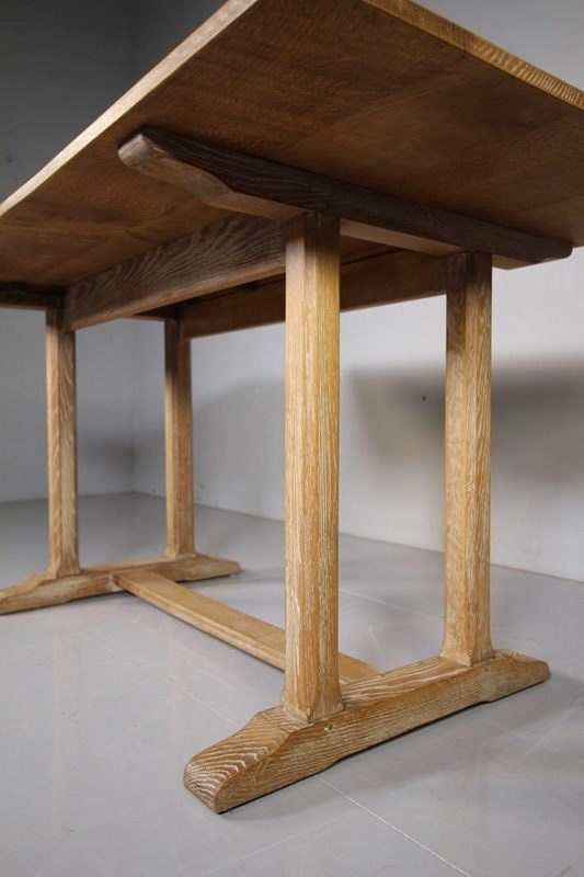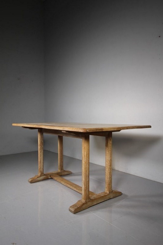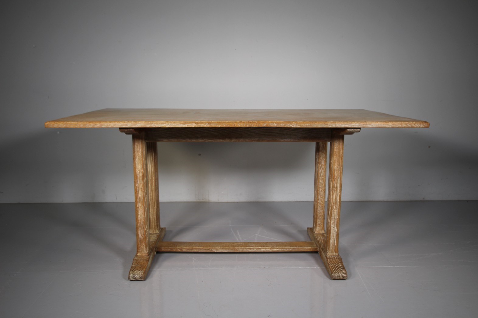 A high quality, solid oak refectory dining table by Heals of London around 1930. This is a superb example in fabulous, original condition and still in the original finish. The large oblong oak dining table top is upon a four square legged table base that have chamfered edges, they finish on sledge feet which are joined by a central flat stretcher. perfect dining table for up to six people, but would also make a great desk too.