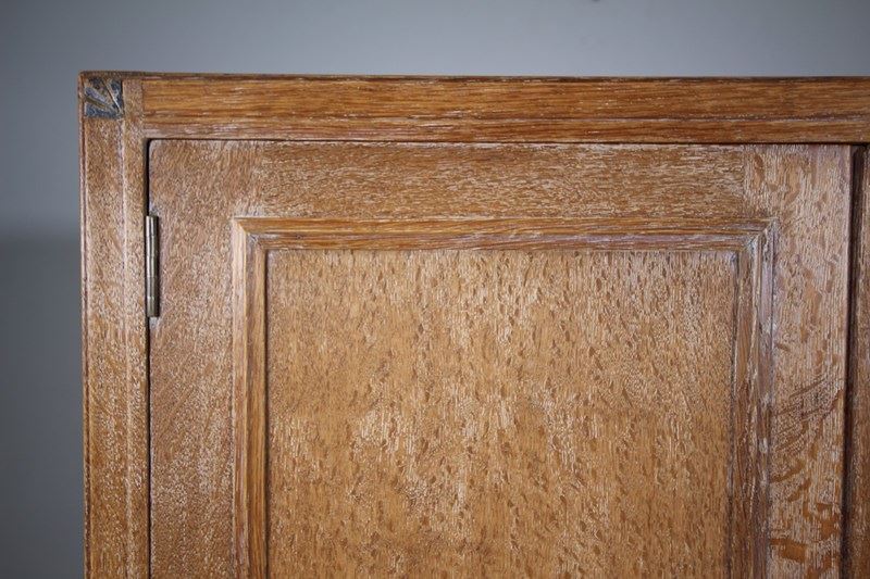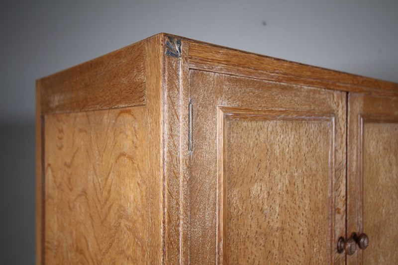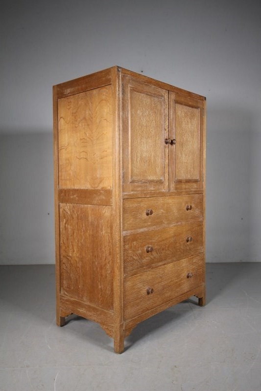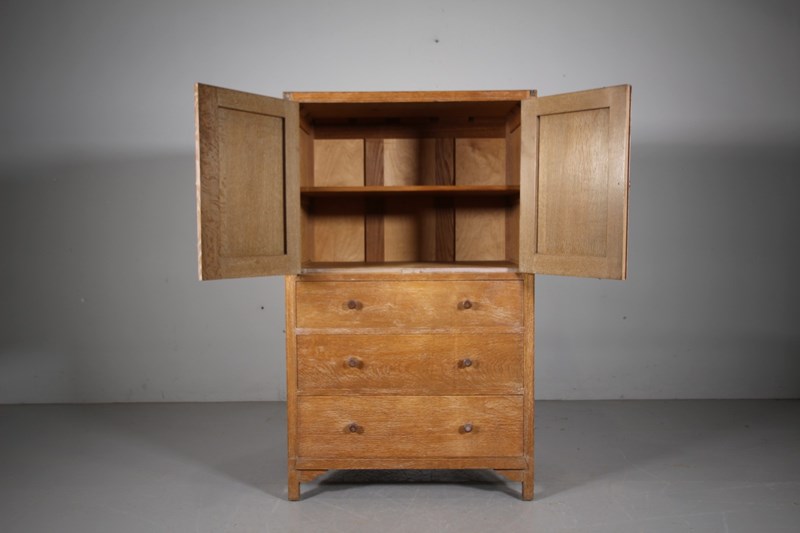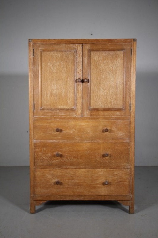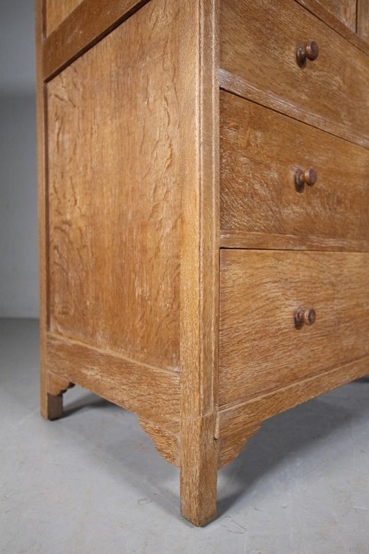 A good quality Heals of London oak tallboy that has two panelled cupboard doors over three long drawers that graduate in size with all having the original oak knob handles. A very clean and original example and being a good original colour. Inside the top cupboard is a single wooden storage shelf and the tallboy stands on square legs. Dates to 1930.