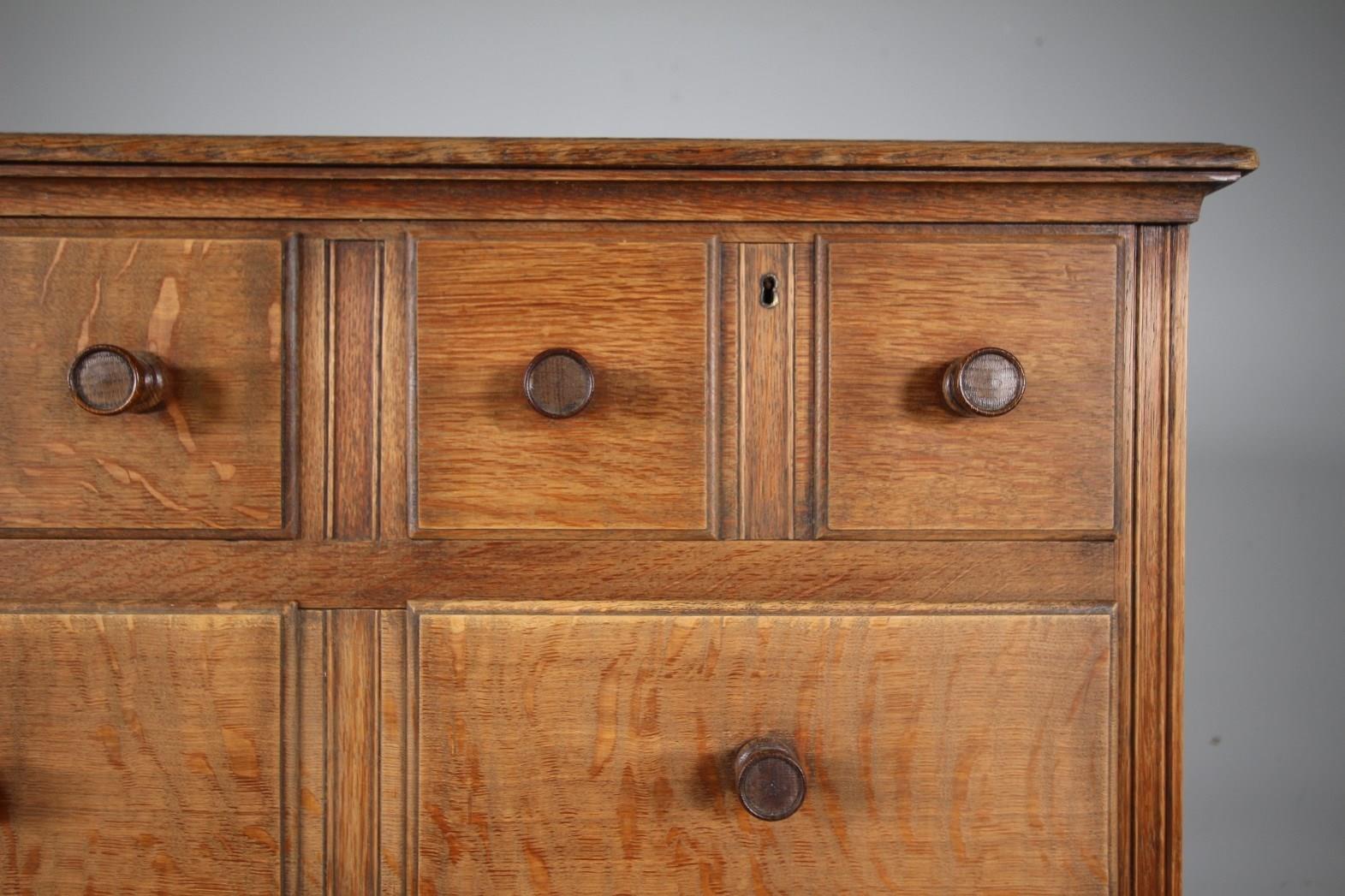 A lovely Edwardian antique oak chest of drawers by Heals of London around 1910, an early Ambrose Heal design, the early large copper Heals oval makers label is on the back. Very well made in solid oak and having two short drawers over three long and graduating drawers that all have moulded fronts with original turned oak knob handles. The chest top is nicely moulded and the chest stands on a stretchered base with squat bun feet. In excellent condition throughout. A rarer model.