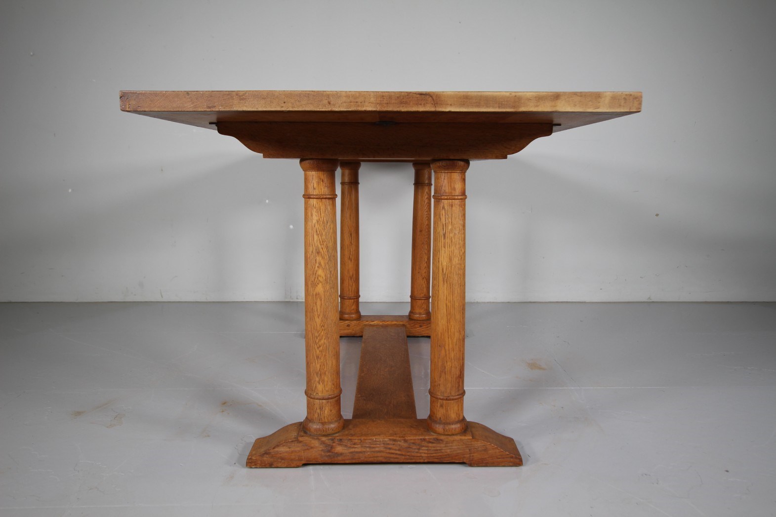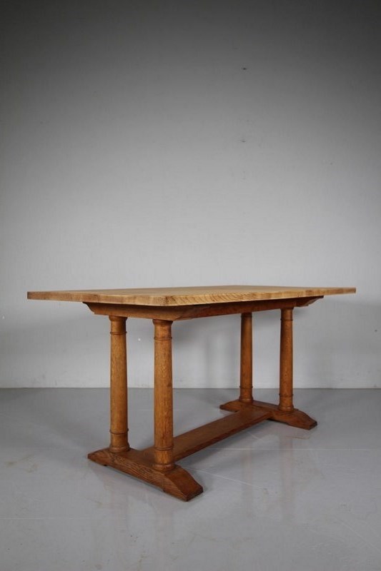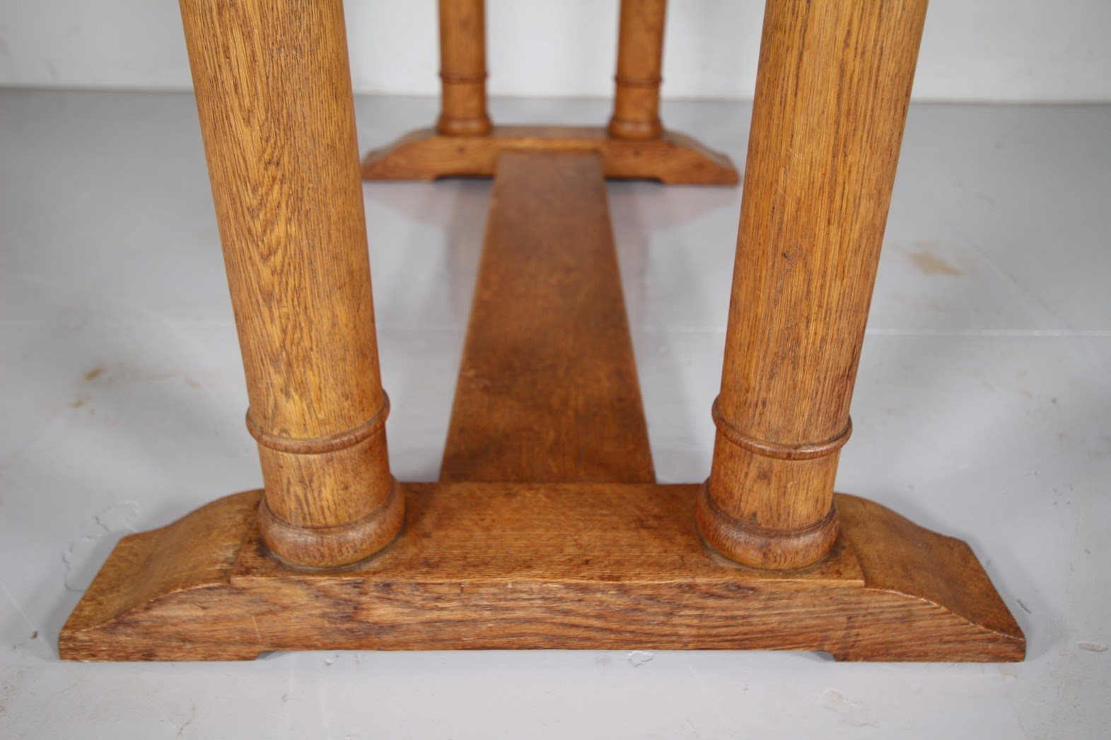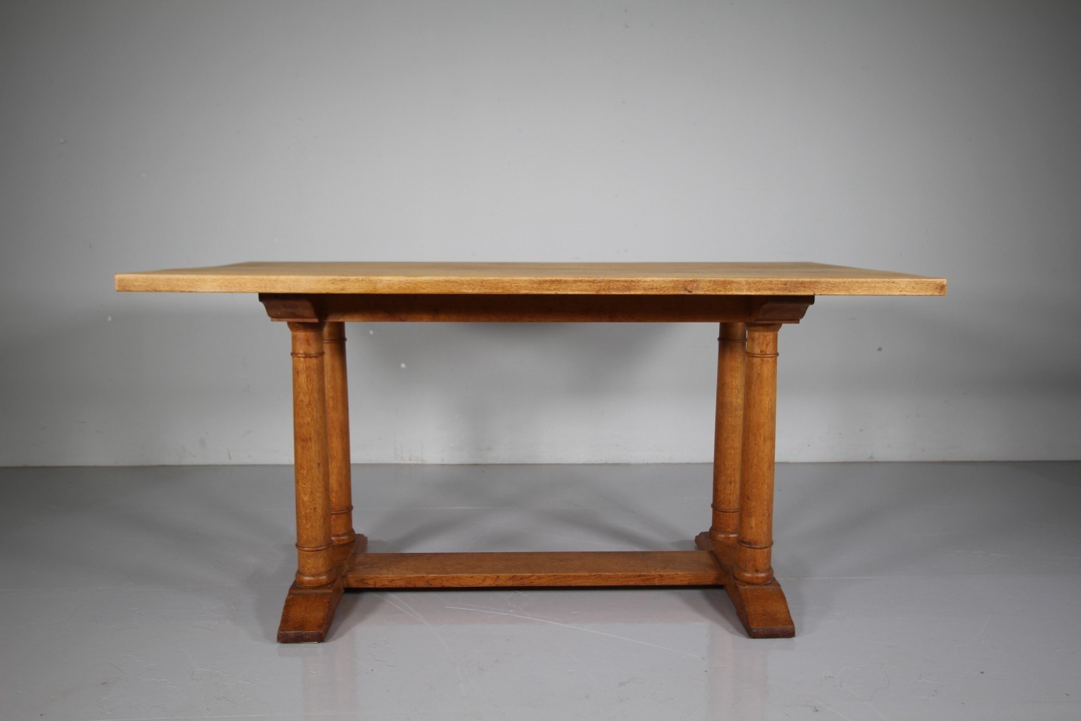 A super quality, solid oak large dining table by Heals of London around 1920, part of their Tilden range of furniture. This Heals antique dining table has a thick oak table top upon four, gun barrel turned oak legs that finish on sledge feet that are joined by a central flat stretcher. The Heals table base has large supporting corbels that are mirrored on the feet. In excellent clean condition and with the large Heals makers label inset. Would make a great desk too.