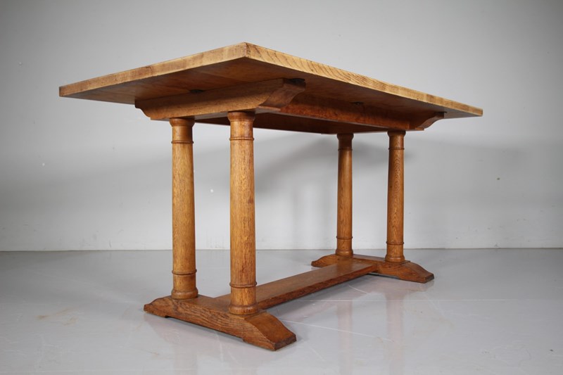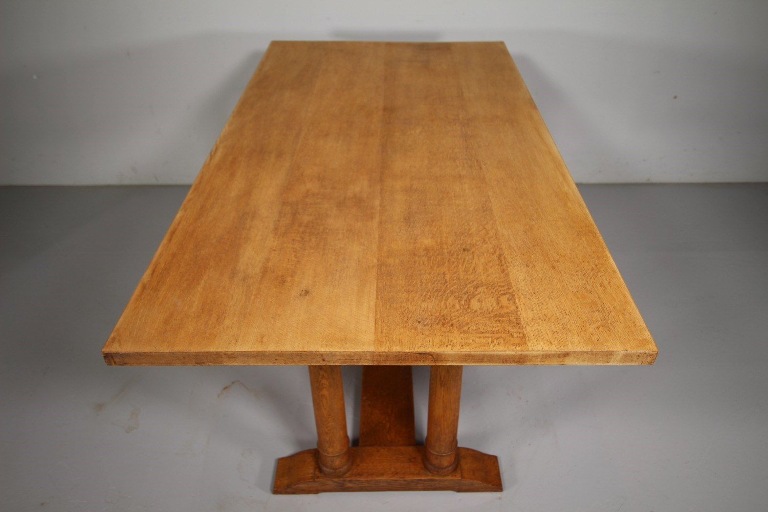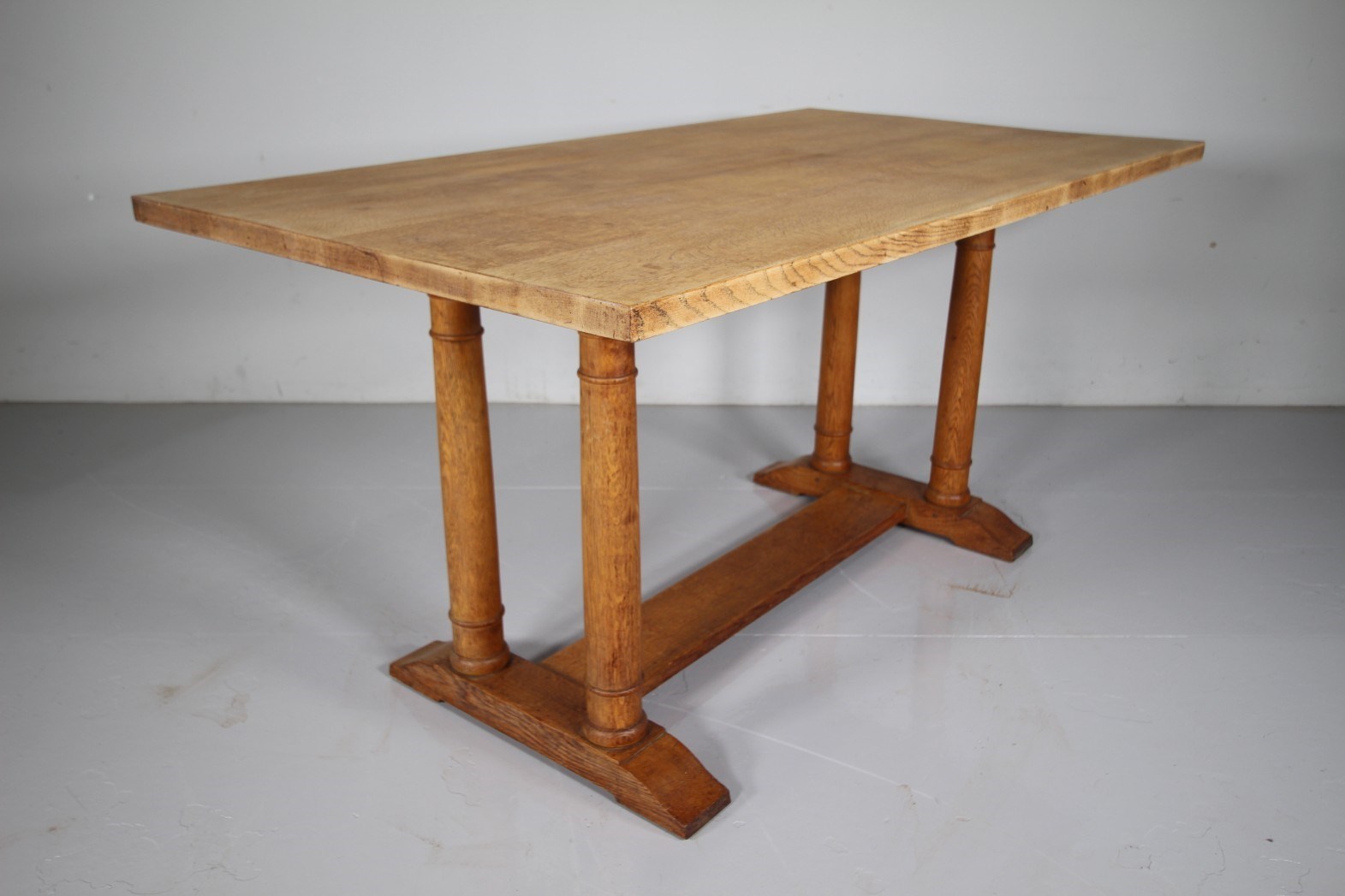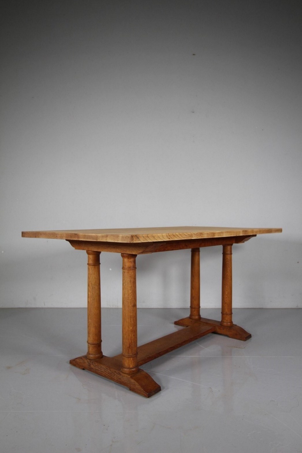 A super quality, solid oak large dining table by Heals of London around 1920, part of their Tilden range of furniture. This Heals antique dining table has a thick oak table top upon four, gun barrel turned oak legs that finish on sledge feet that are joined by a central flat stretcher. The Heals table base has large supporting corbels that are mirrored on the feet. In excellent clean condition and with the large Heals makers label inset. Would make a great desk too.