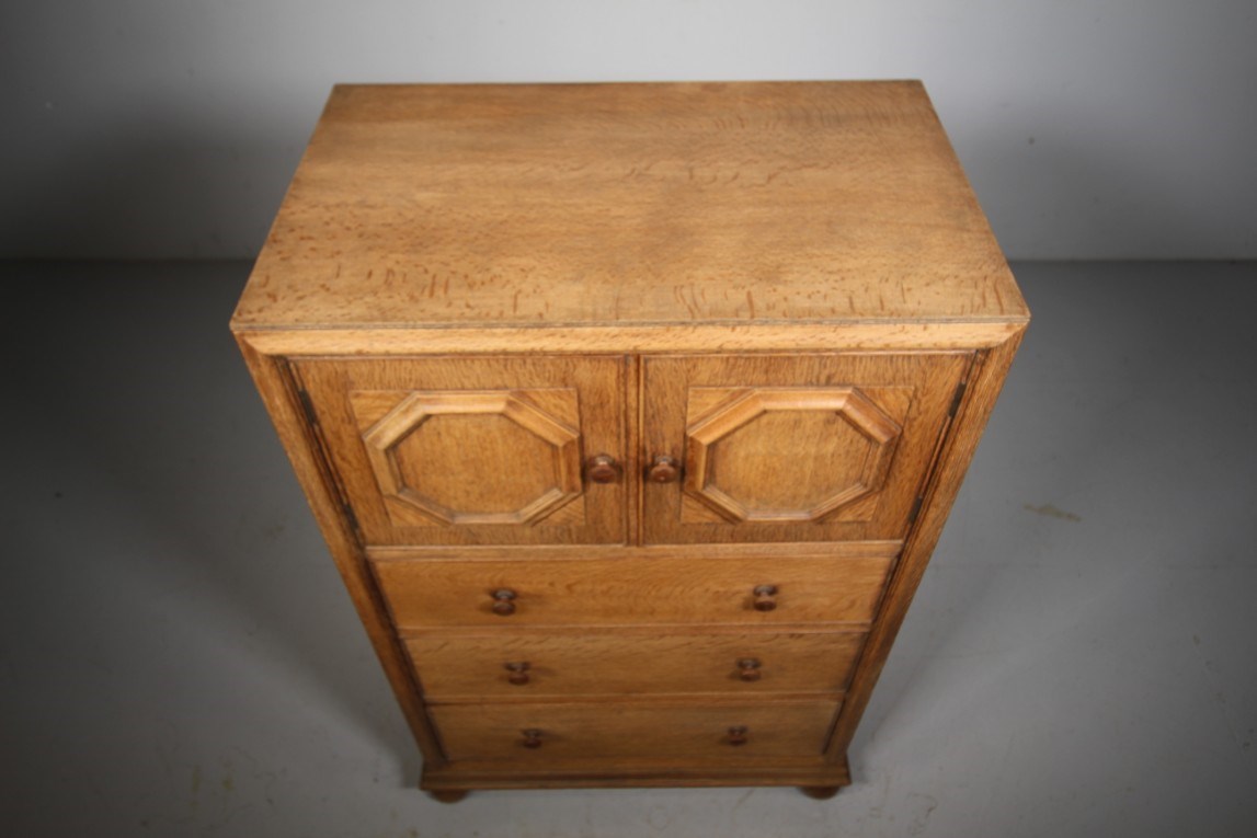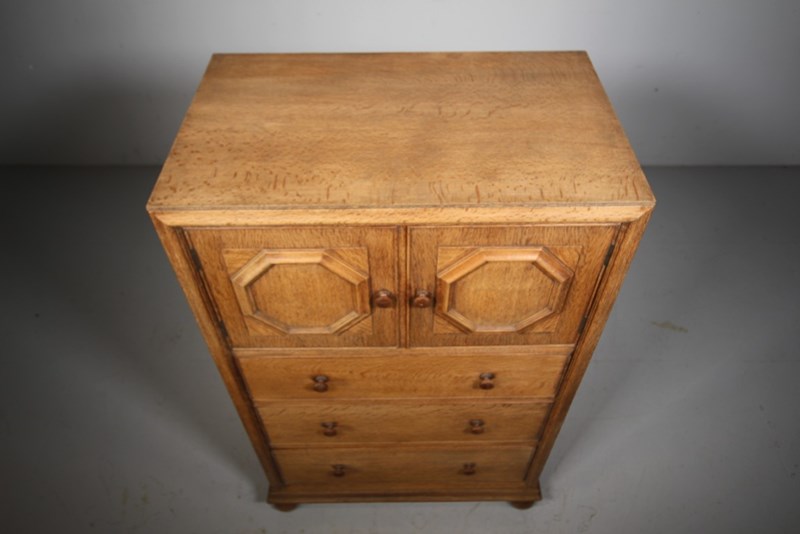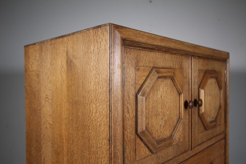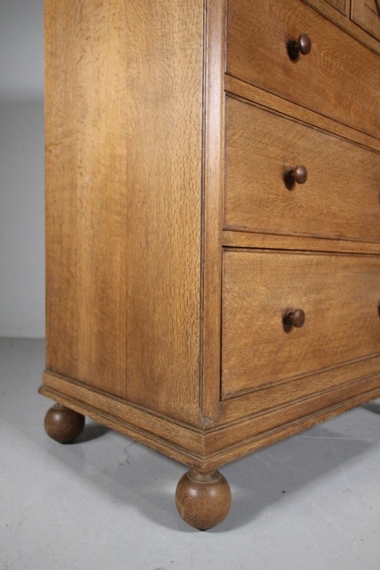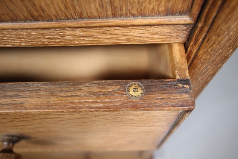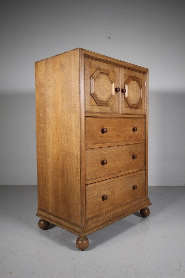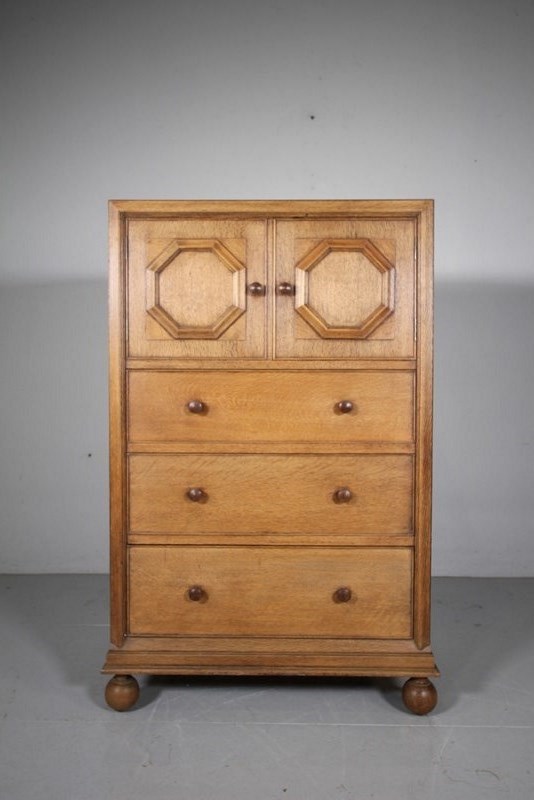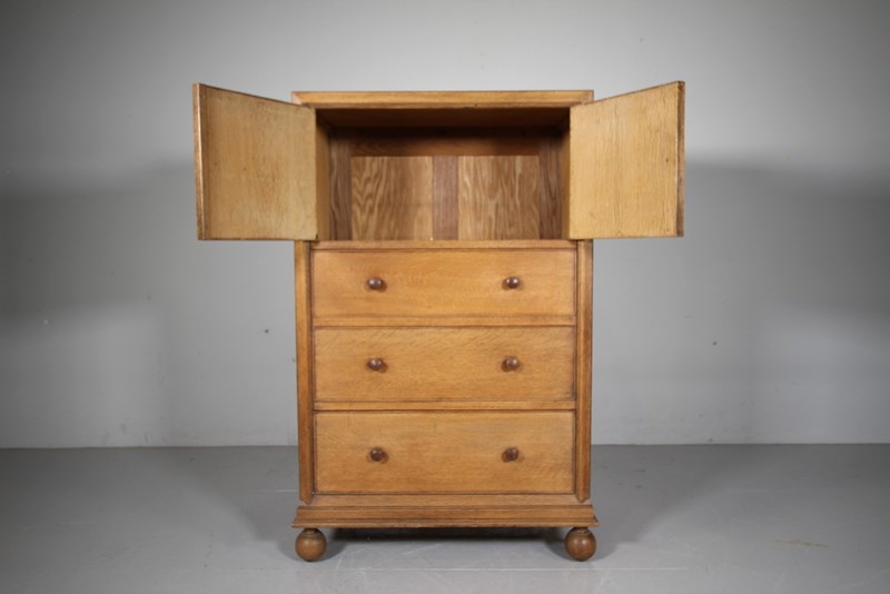 Heals Edwardian Antique Buttery Hutch Range Tall Boy Cupboard A superb quality solid oak Edwardian antique tall boy cupboard by Heals of London around 1915-20. Part of their Buttery Hutch range of furniture which was one of there most expensive, best quality ranges to produce. A lovely design having two cupboard doors to the top with raised, octagonal panels and with three graduating drawers beneath. All the drawers run very well, are cedar wood lined and have the original oak handles, to the top drawer the early Heals makers label is inset. Stands on lovely ball feet and around the edge of the tall boy is a decorative mould. This Heals antique tall boy is in fabulous, original condition and is a very good colour, a fine example. DimensionsHeight: 122cm (48.41")Width: 80cm (31.75")Depth: 50cm (19.84")