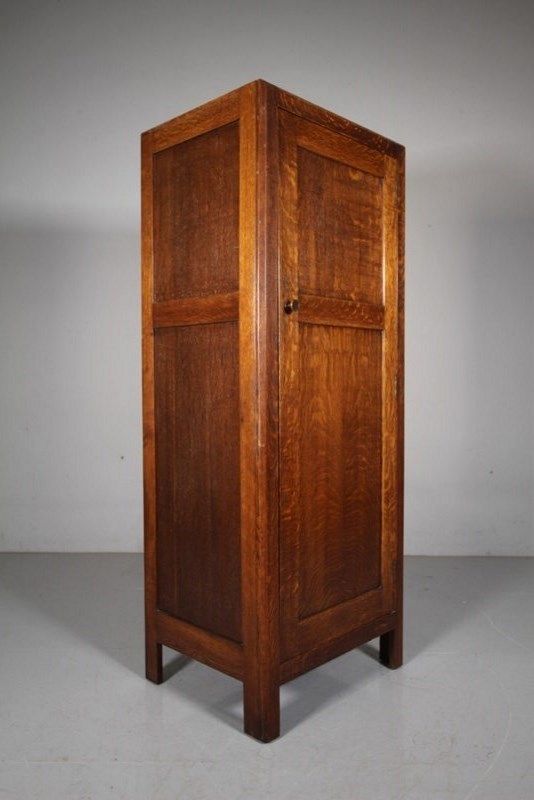A good quality Edwardian antique single door oak wardrobe by Heals of London around 1915-20. In excellent, clean condition and all a very good original colour. Features a single panelled robe door with the original oak knob handle and the Heals makers label is inset inside, along with the original hanging rail. This Heals antique oak wardrobe stands on square legs, has a flat top, so items can be stored up on top. A lovely example.