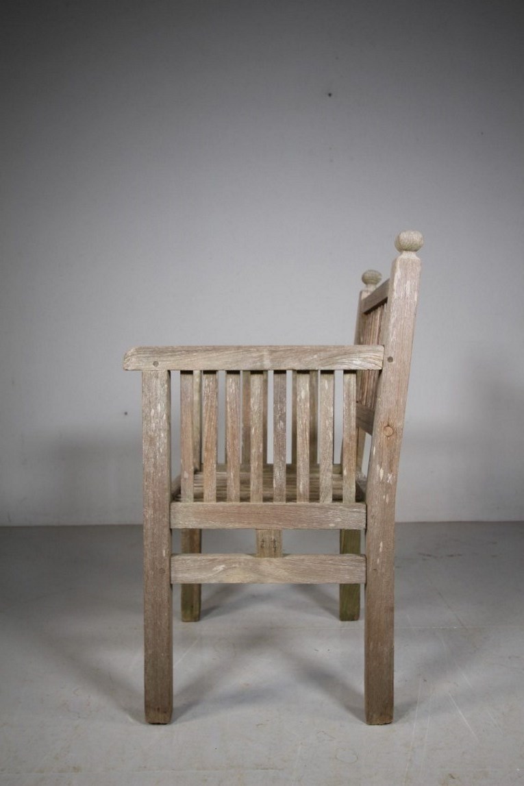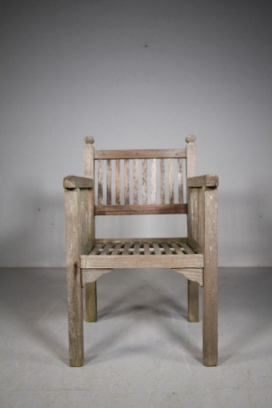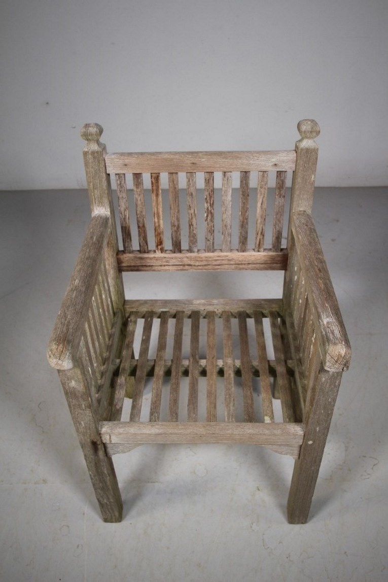 A fabulous Heals of London antique garden armchair, made in solid teak with a slatted seat, sides and back rest. The best Heals garden seat model having the decorative finials to the back rail, in the original Heals catalogue this model is known as The Duke model. Becoming quite a rare survivor, dating to around 1910, this Heals teak antique garden chair is in very good, solid and complete condition.