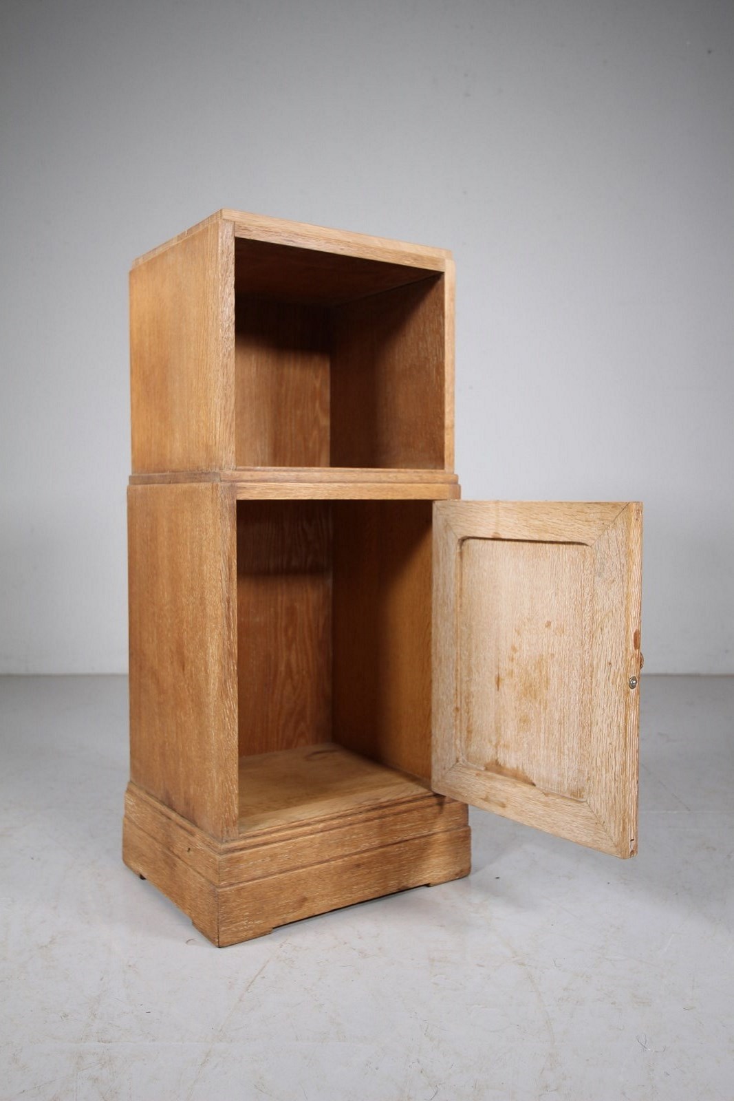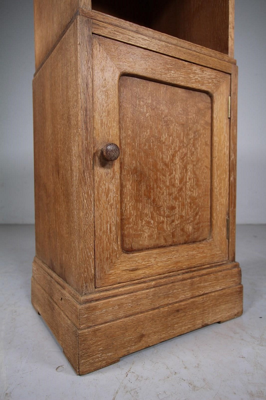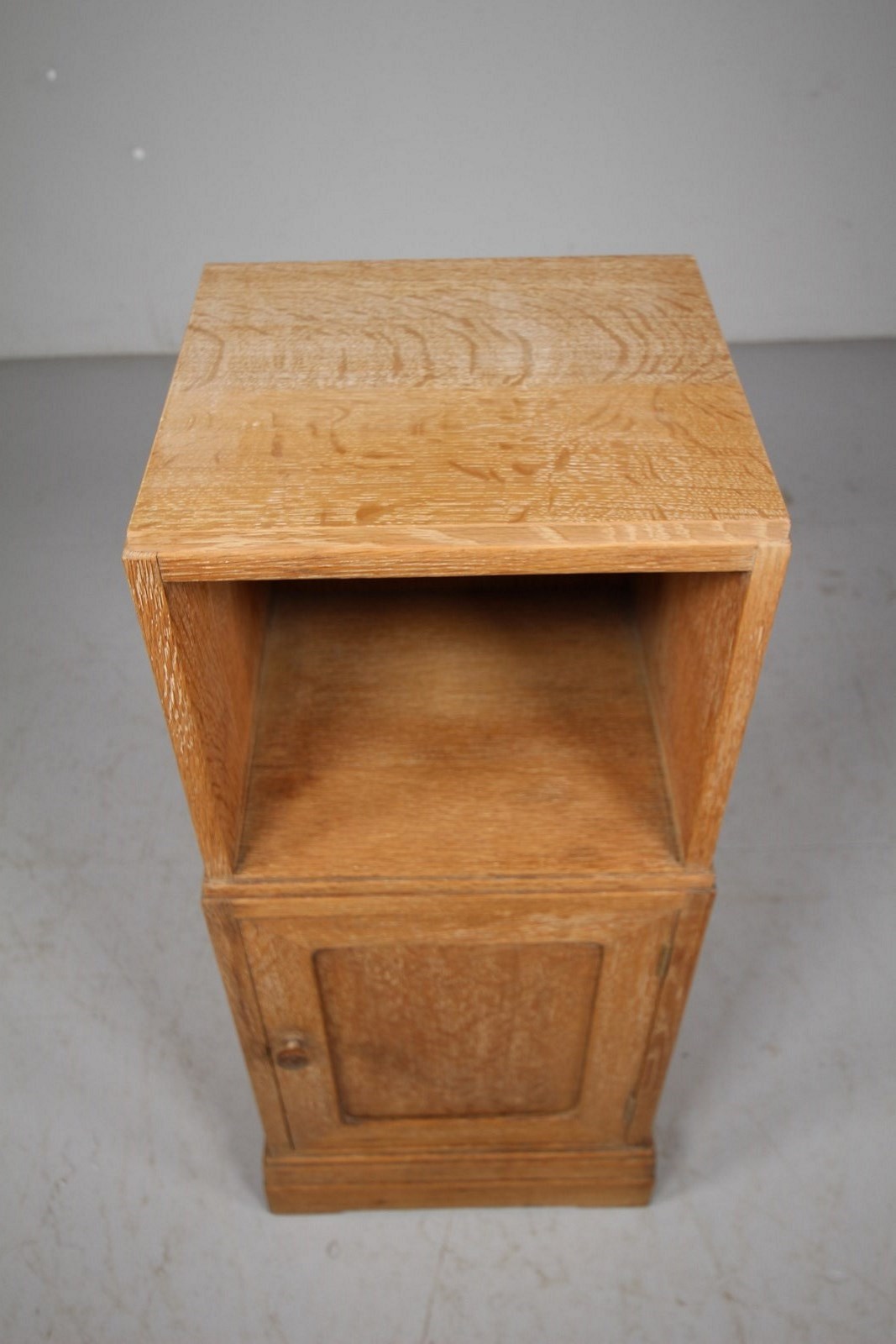 A lovely early 1920’s solid oak bedside cabinet by Heals of London. In the original finish and having an open shelf space to the top, over a single well panelled door that has the original oak wooden knob handle. Inside is an open storage area, a stepped Heals bedside design that finishes on a square stepped plinth. In excellent condition.