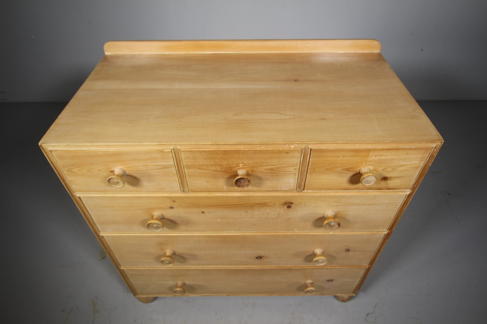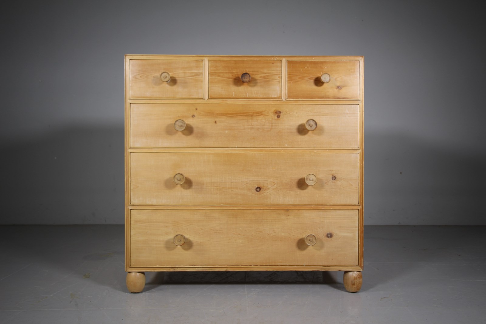 Heals of London didn’t make a large amount of chest of drawers in pine, but when they did, they were very high quality and wonderfully made. The pine used is a lovely pale variety and this Heals chest has a more unusual drawers arrangement, having three shorter square drawers along the top with three long and graduating drawers beneath. All six channel moulded drawers have finely cut dovetails, have the original knob handles and they all run well. To the top of this Heals pine chest is an original up stand and the chest stands on lovely oval original feet. In superb condition, all very clean with exposed dovetails to the chest sides. In the natural bare pine finish as intended when made, this Heals chest has never been painted. Circe: 1920.