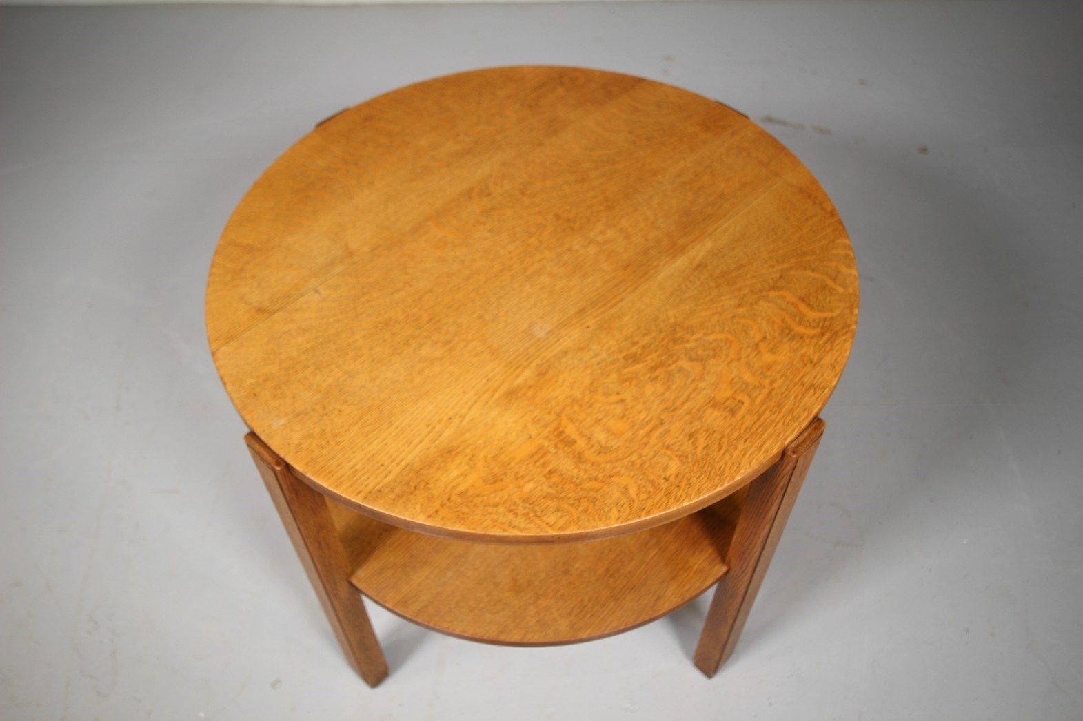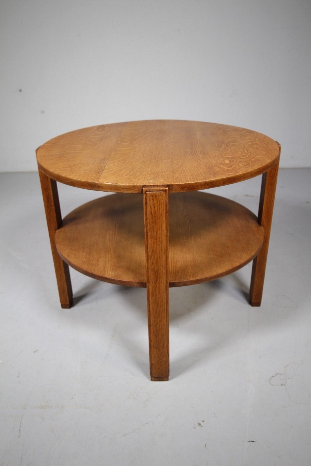 Perfect to use as a side coffee table, this Heals early thirties solid oak circular two tier table is in excellent, clean condition. Featuring four square legs that support the round table top and matching under shelf, all a very good colour and complete with the Heals makers label inset underneath.