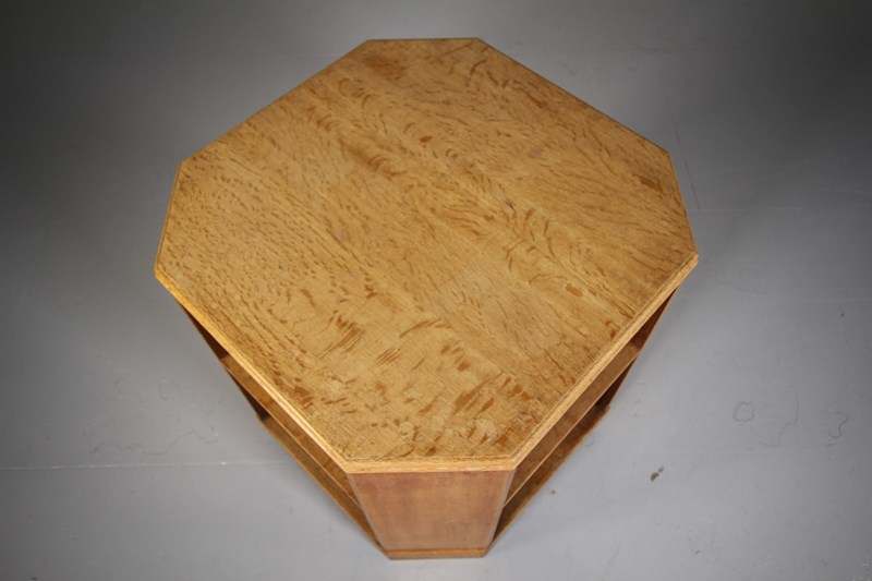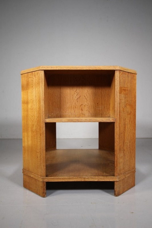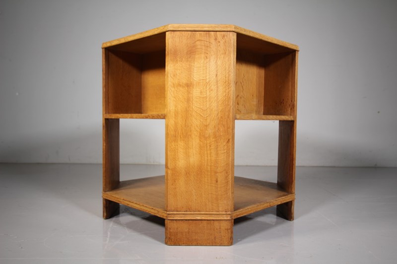A solid oak octagonal shaped side or coffee table by Heals around 1930, known as the Book Table, as it is shelved for book storage on the underside of the table top, there is also lower shelves for more storage. In excellent clean condition and made using well figured oak timbers. Perfect height to use by the side of an armchair or sofa.