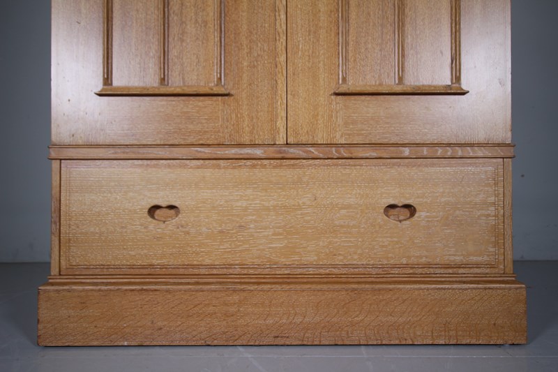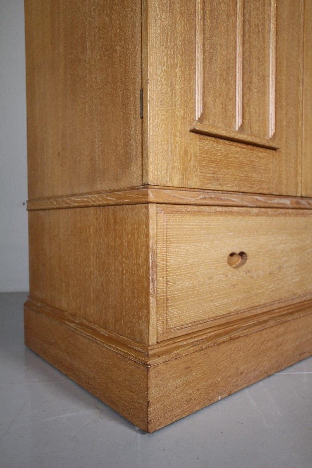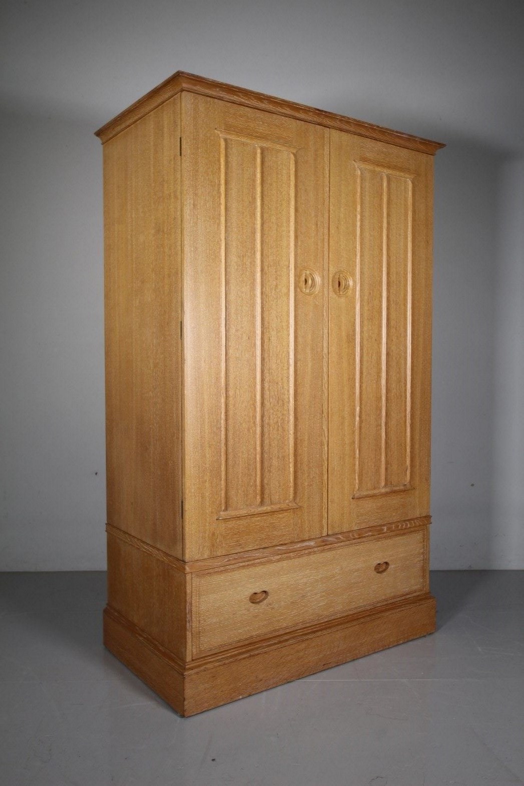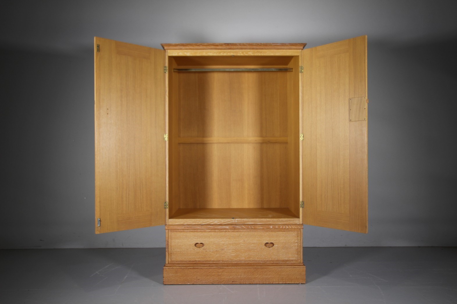 A superb quality, solid oak Heals double wardrobe that is a rare reissue from the early eighties, made by Heals in England in very small numbers at huge costs, then retailed by Heals of London Tottenham Court Road store, only a handful of designs were re-issued, this being one of them with the fabulous squashed heart recessed handles. In wonderful, original and clean condition, featuring a simple oak cornice and two long robe doors below with fabulous oak turn buckle handles and a single long drawer beneath with the Iconic squashed heart recess handles, all still in the original finish. Beautifully made and a deeper model to house modern day clothes hangers. This is a lovely piece of original Heals oak furniture for the bedroom that has had no expense spared on its production. Splits in two for movement.