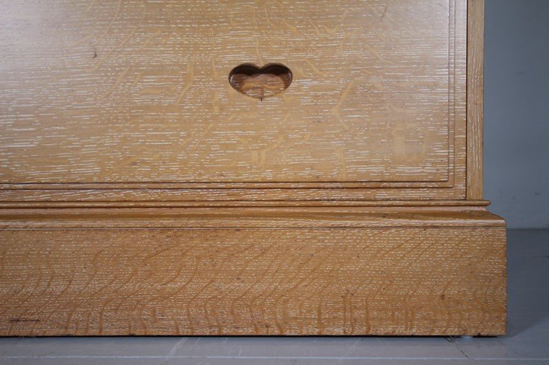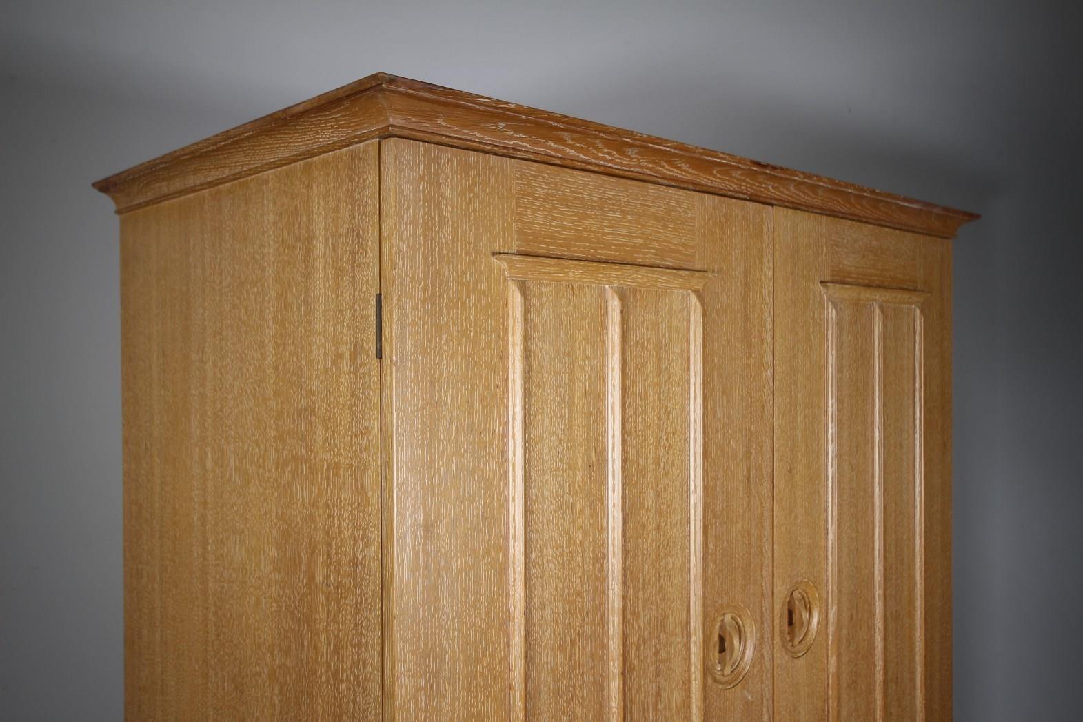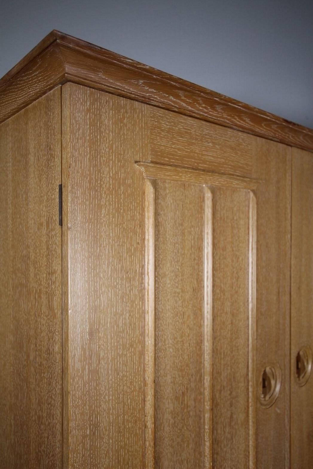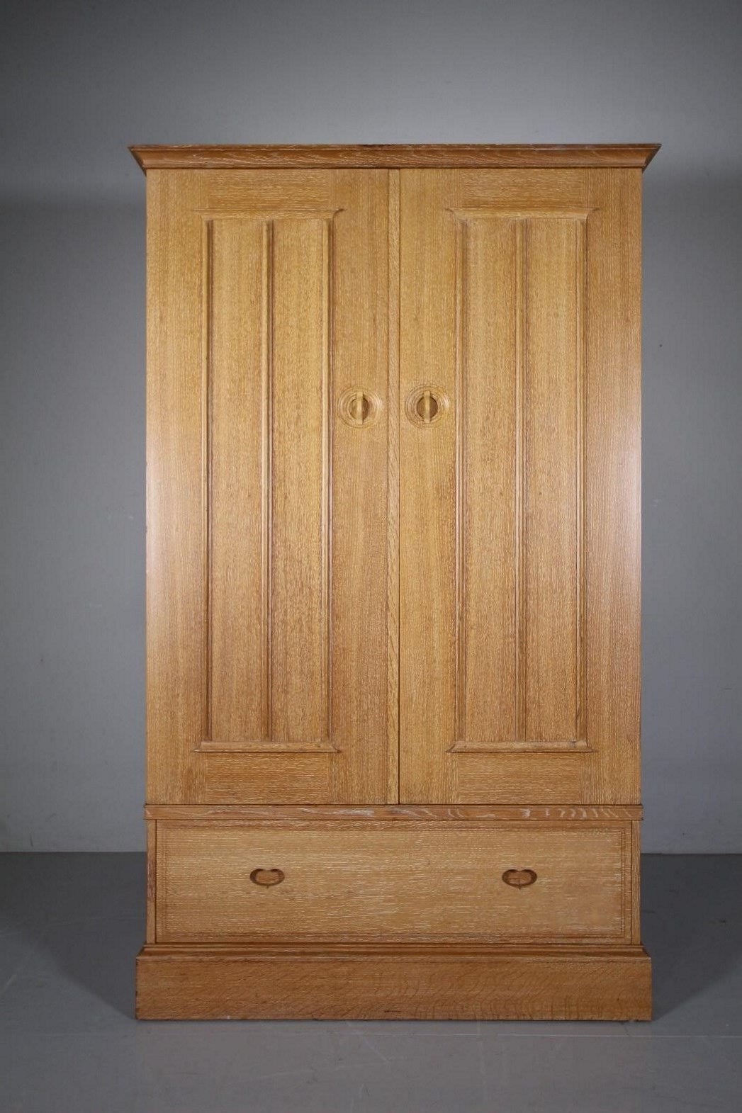 A superb quality, solid oak Heals double wardrobe that is a rare reissue from the early eighties, made by Heals in England in very small numbers at huge costs, then retailed by Heals of London Tottenham Court Road store, only a handful of designs were re-issued, this being one of them with the fabulous squashed heart recessed handles. In wonderful, original and clean condition, featuring a simple oak cornice and two long robe doors below with fabulous oak turn buckle handles and a single long drawer beneath with the Iconic squashed heart recess handles, all still in the original finish. Beautifully made and a deeper model to house modern day clothes hangers. This is a lovely piece of original Heals oak furniture for the bedroom that has had no expense spared on its production. Splits in two for movement.