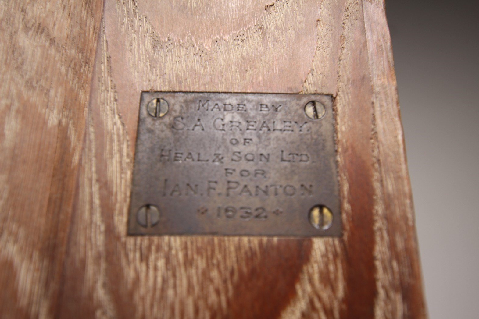 A special bespoke order of a Heals of London 1930’s oak corner cupboard that has the Heals makers label inset and also the special order details brass makers plaque inset into the back of the cupboard. To the Heals oak cupboard top is an original oak up stand with two raised panelled cupboard doors to the front, complete with the original ebonised oak handles. Stands well on square legs, in excellent condition and in the original finish / colour. Dated 1932 on the Heals makers plaque, along with made by S.A. Grealey of Heals and Sons for a Ian.F.Panton. Shelved inside. A rare Heals piece and with having the rare two makers labels.