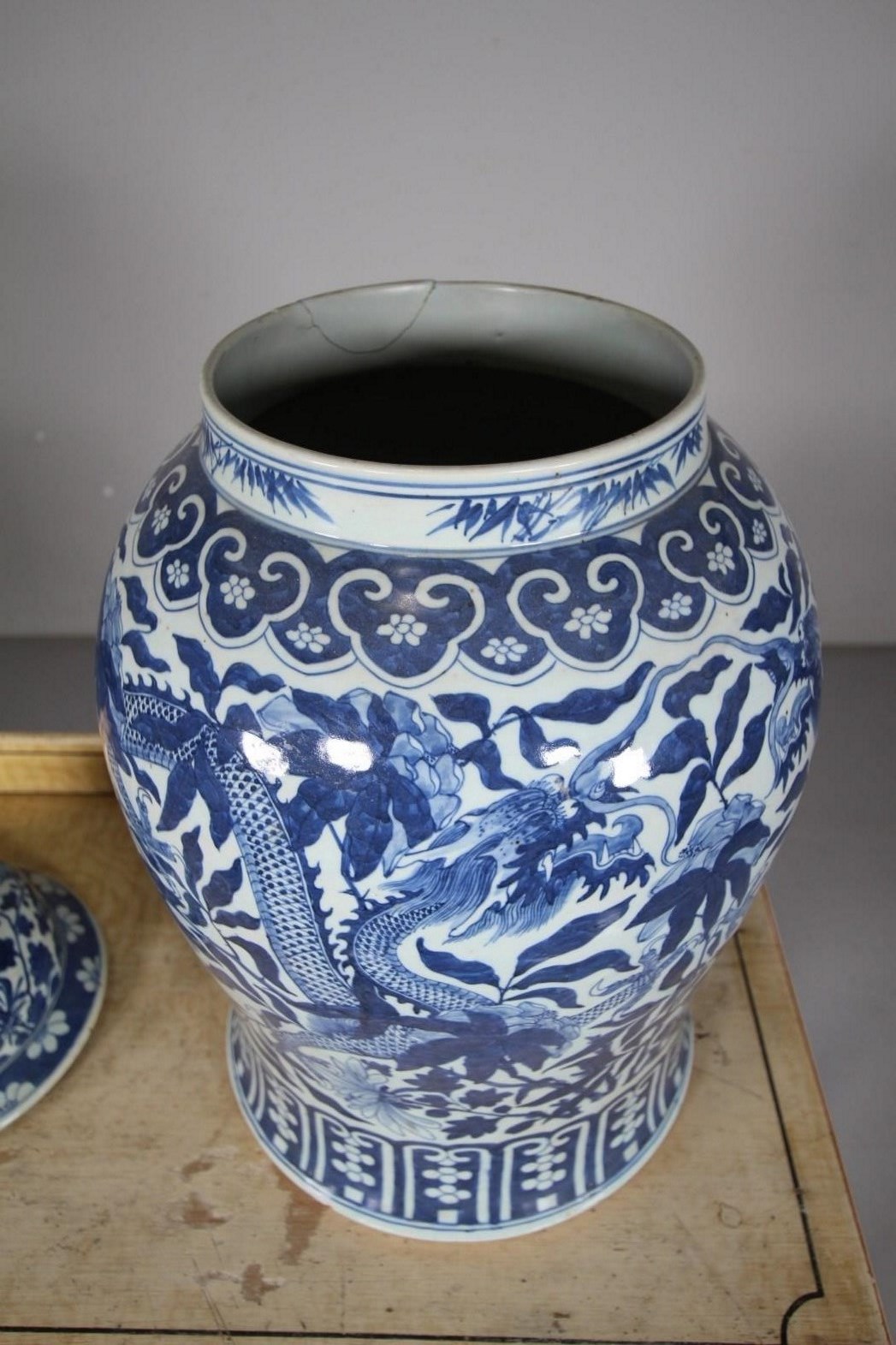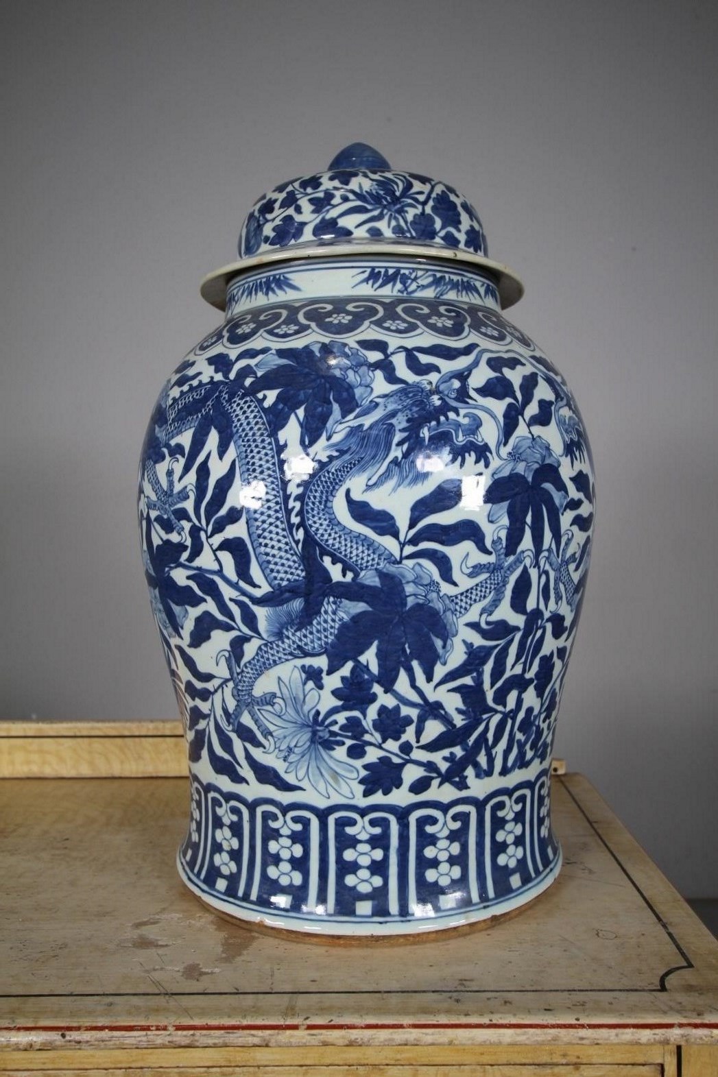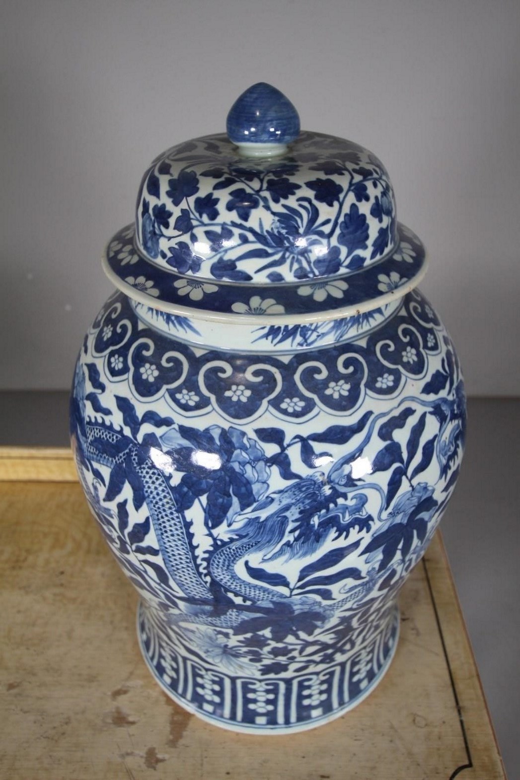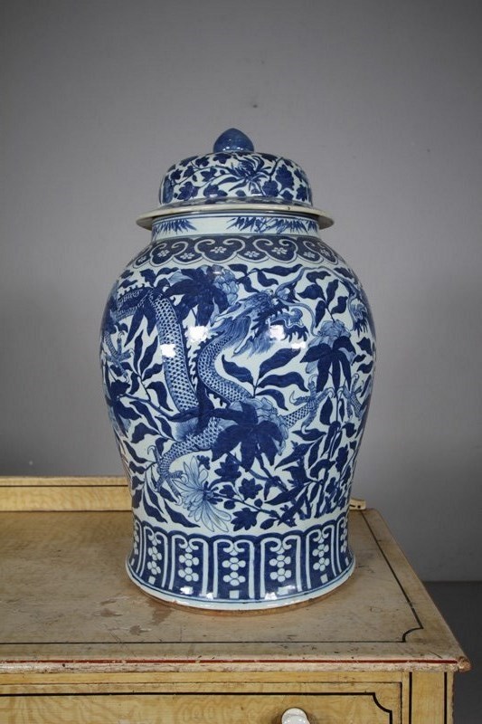 A beautiful large scale early 19th century Chinese blue and white shaped temple jar and original finial lid. The lovely decorative design features dragons and flowers in bright blue, in superb condition with only a small area of damage to the rim, but all complete. Chinese and dating to around 1820.