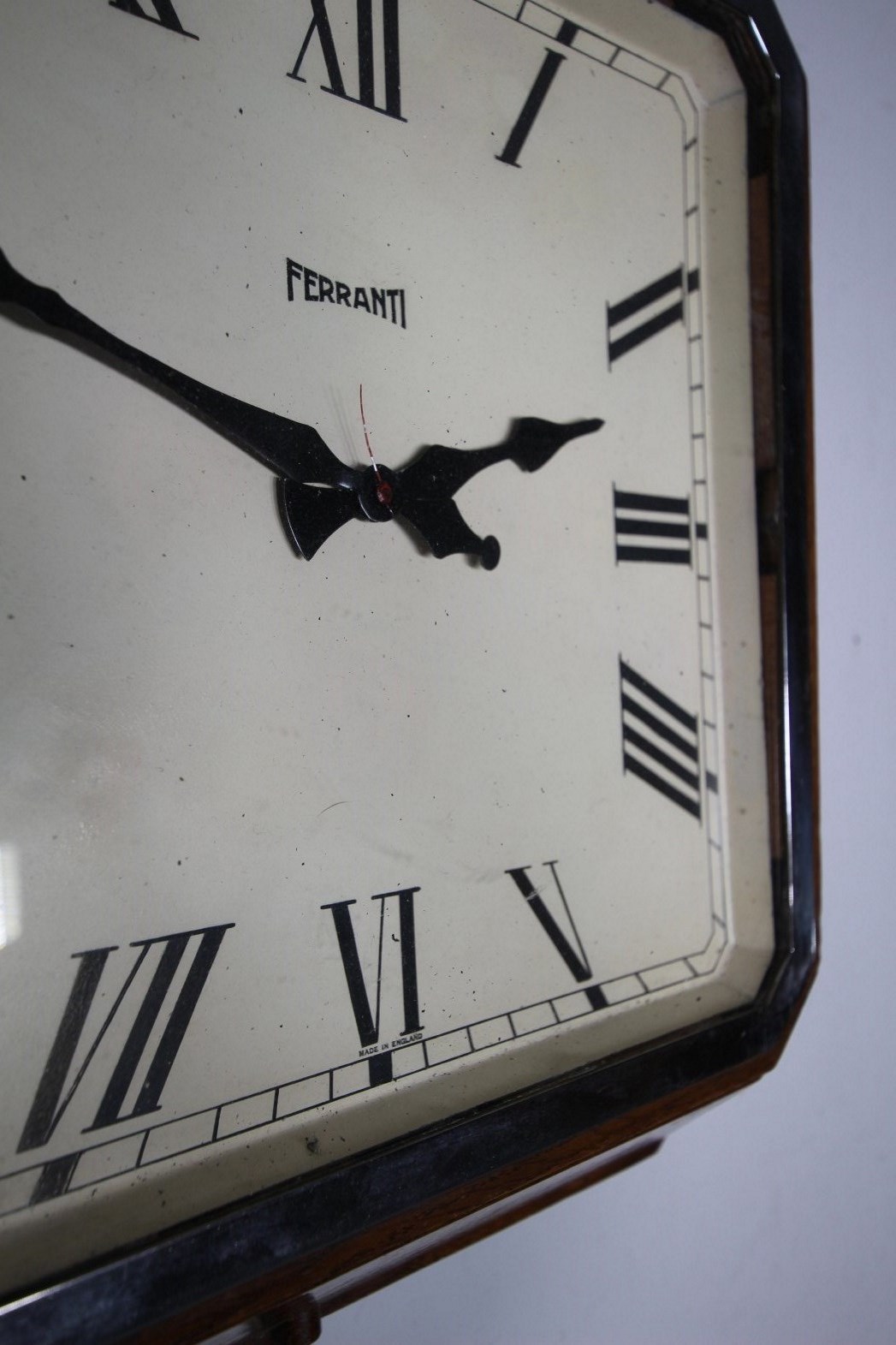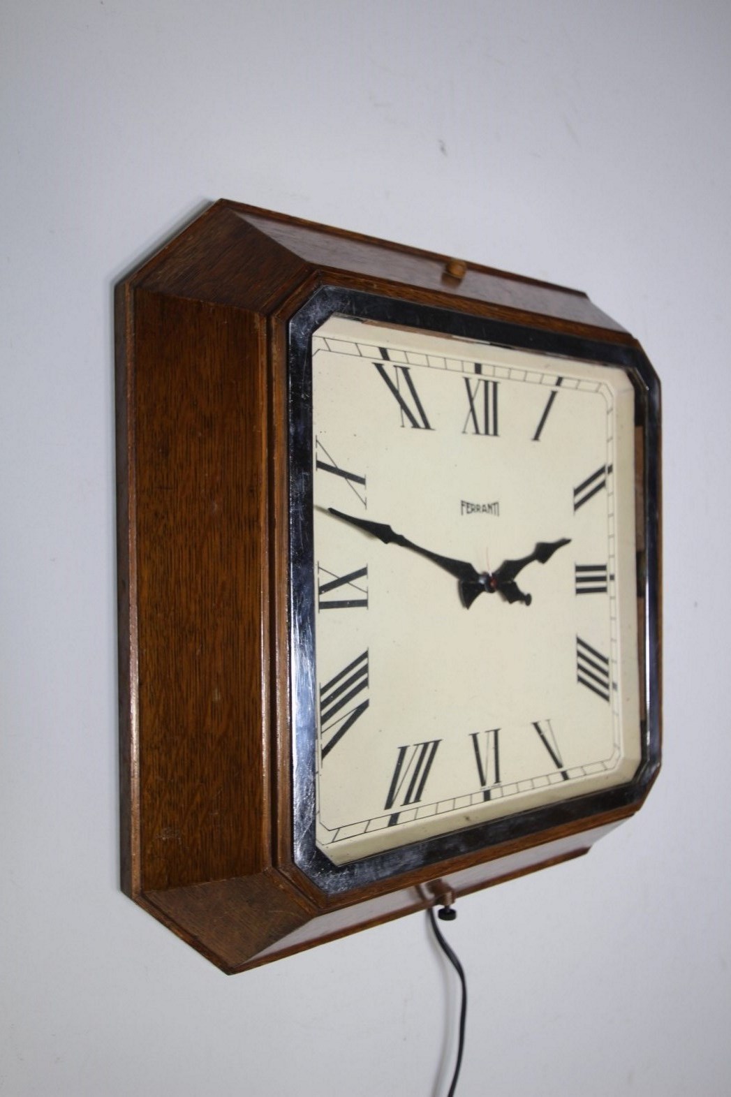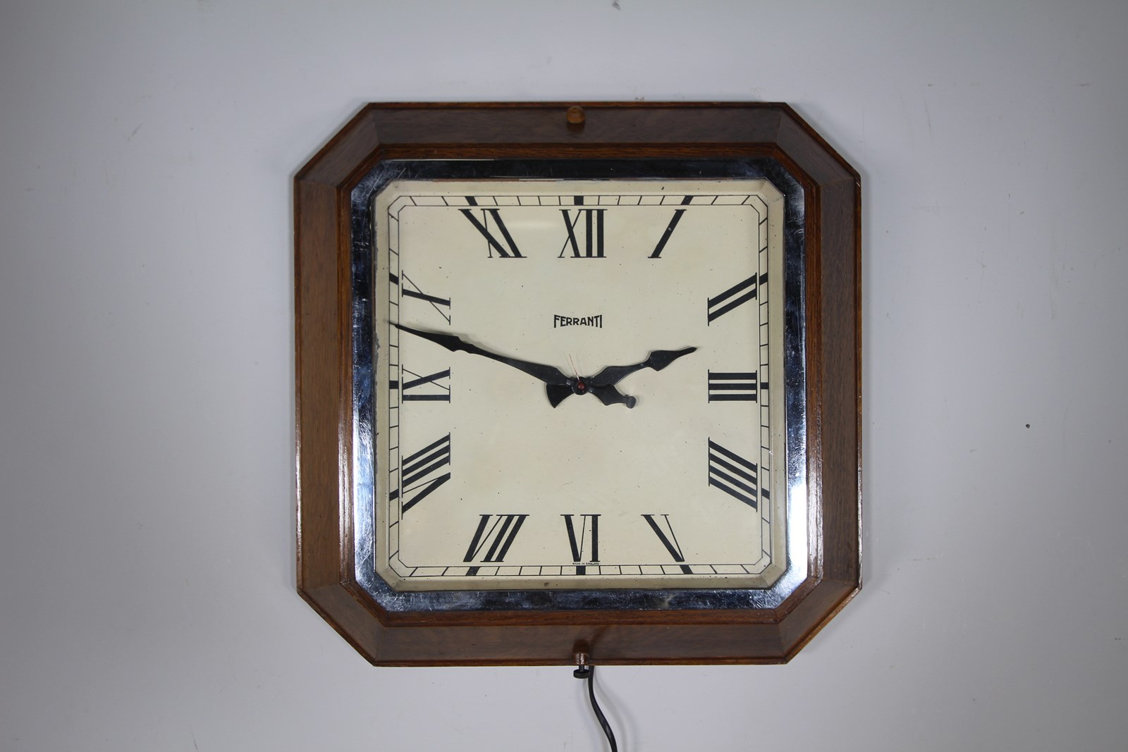 A good quality English early 20th century large wall clock that is octagonal in shape in a solid oak case with a chrome inner slip. Totally original with the lovely painted face and shaped hands. Made by Ferranti around 1930, in fully working condition and with the original electrical movement.