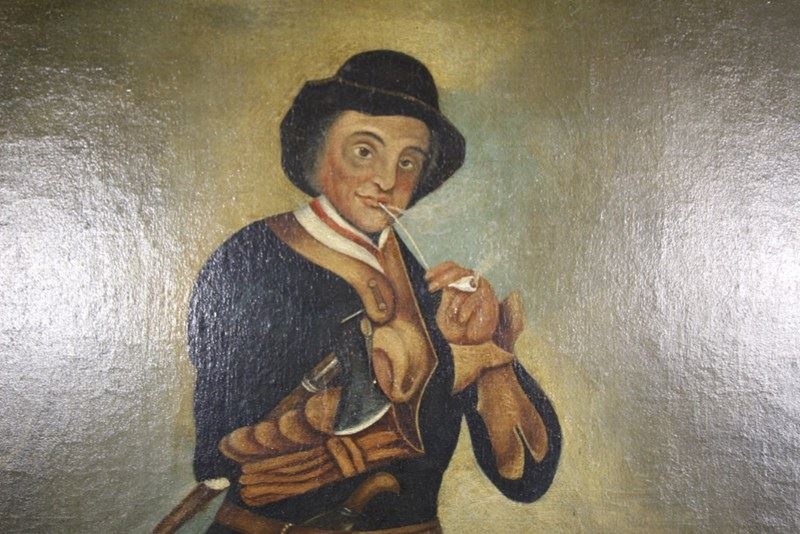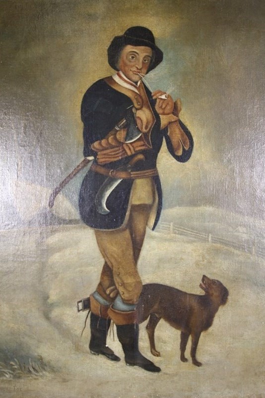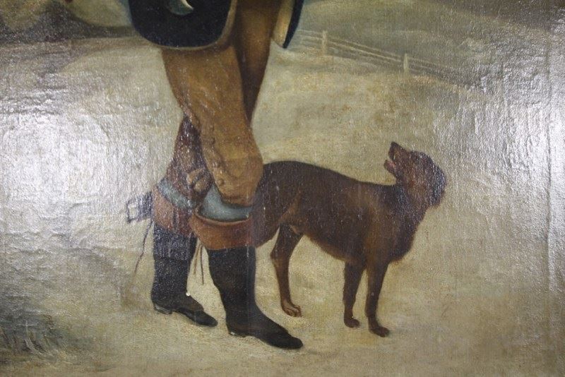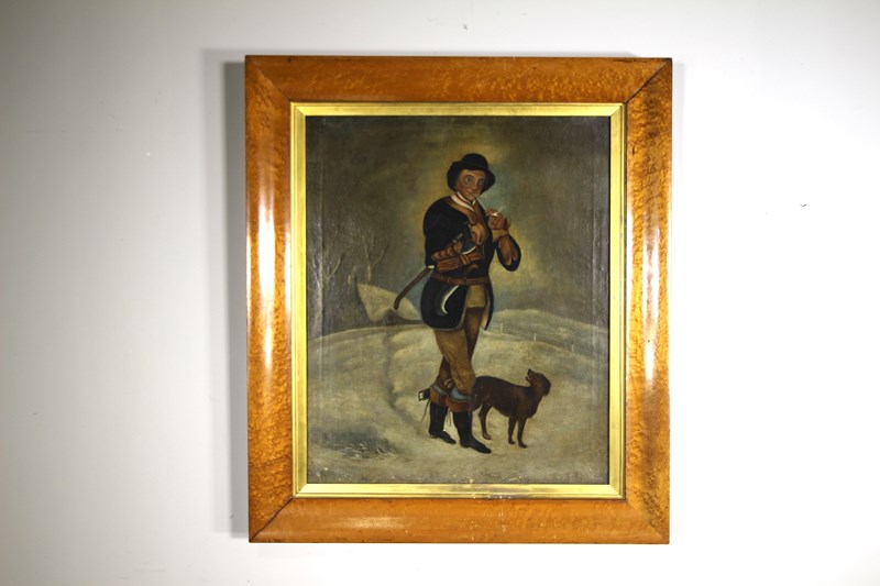 A lovely original English 19th century primitive oil painting on canvas of a Gentleman and his faithful dog in a snowy countryside setting. Very well painted and in excellent condition with no damage. Mounted in the original bird’s eye maple antique frame and inner gilt slip. The chap is wearing lovely period clothes, topped off with a hat and is smoking an old clay pipe. English, a good size and dating to around 1830.