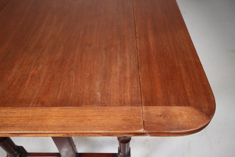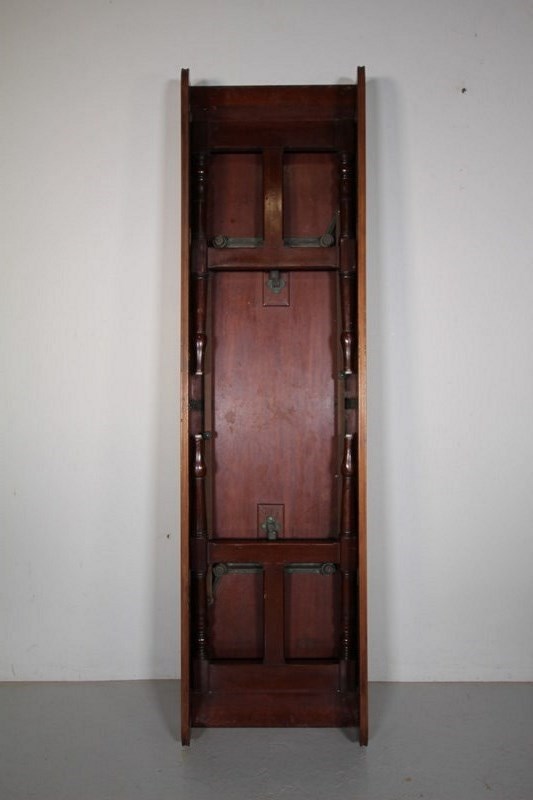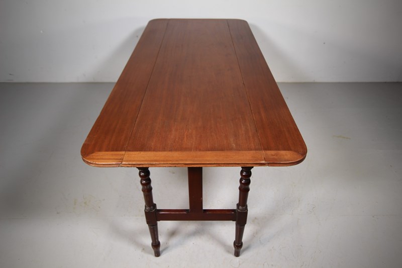A superb quality English large 19th century antique mahogany campaign dining table, a rare model that is beautifully made. Stamped by the maker underneath, L.N.W.I. A military antique dining table designed to completely fold up flat for travels on the campaign trail. In solid antique mahogany, the dining table has two side drop leaves to enlarge the dining top area, these are firmly held by substantial metal mechanisms. On the underside are brass and iron mechanisms with brass hinges that fold in the well turned table legs that have stretchered ends. In fabulous condition and a wonderful original rich colour and finish. When set up this antique campaign table is very sturdy, perfect for dining but would make a lovely antique desk too.