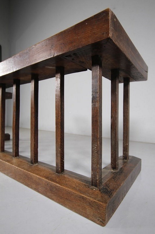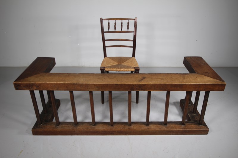 This is wonderful, large scale English antique club fender in solid English well chosen oak that is a superb colour. A heavy design with a thick oak seat to the top and a matching plinth with lovely square oak spindles. Inside the fender are protective metal strips, all original. Whilst dating from around 1870, this antique large scale club fender would suit more contemporary homes as well as Arts & Crafts interiors, due to the simple style. In excellent, complete condition.