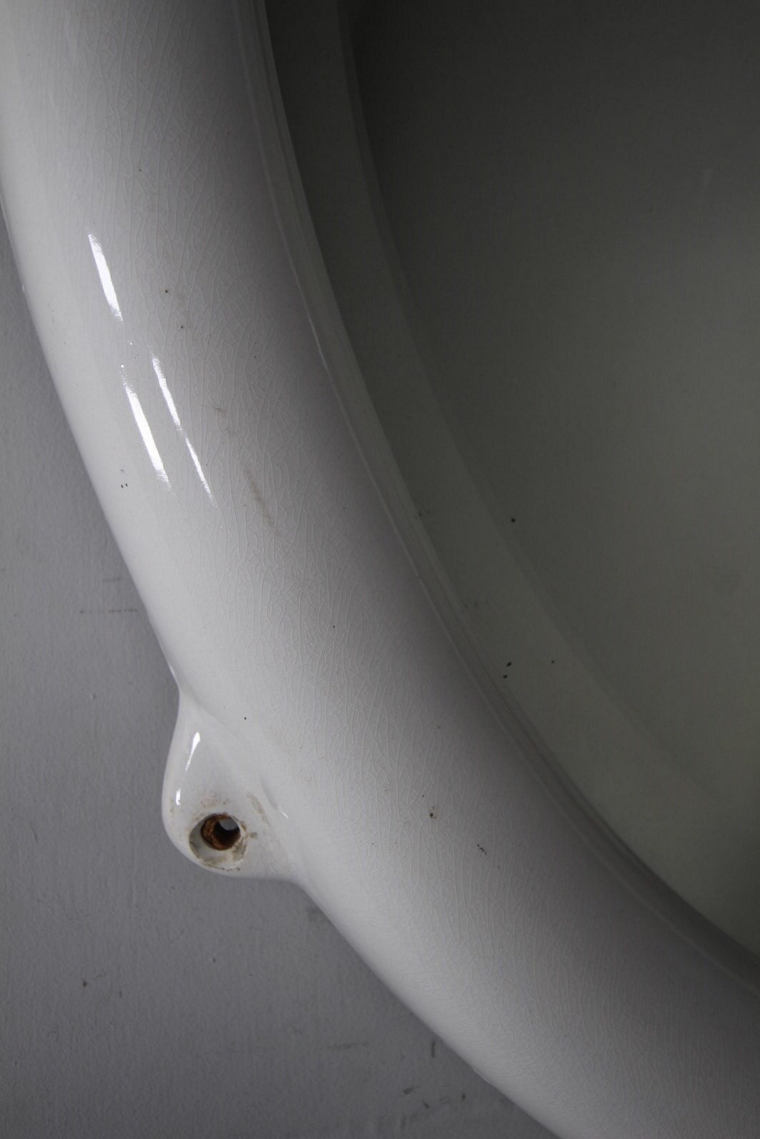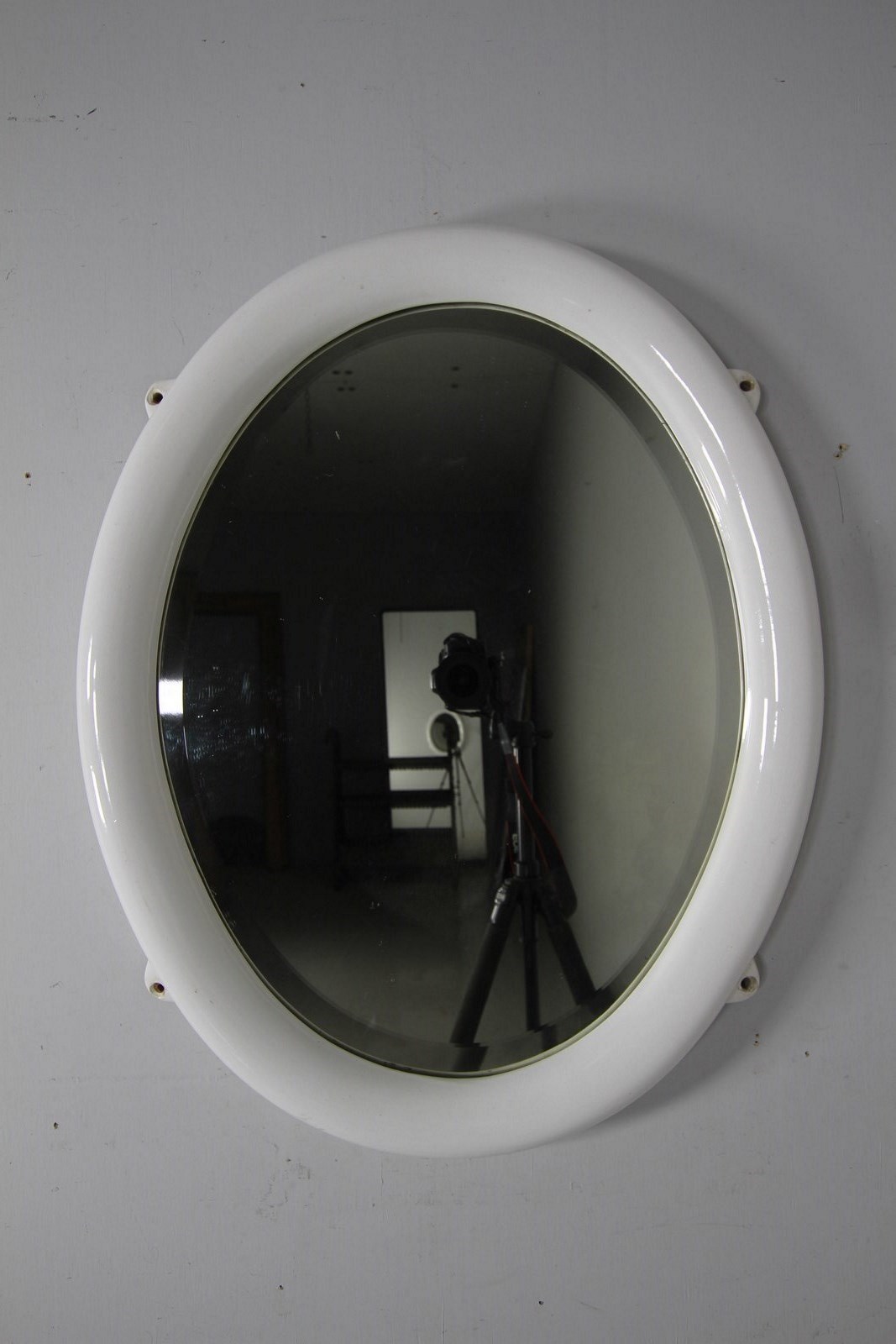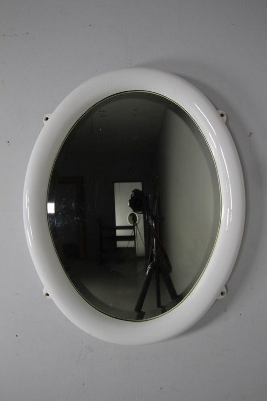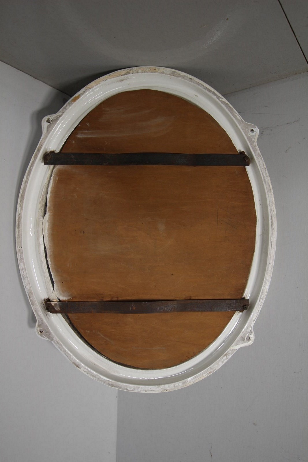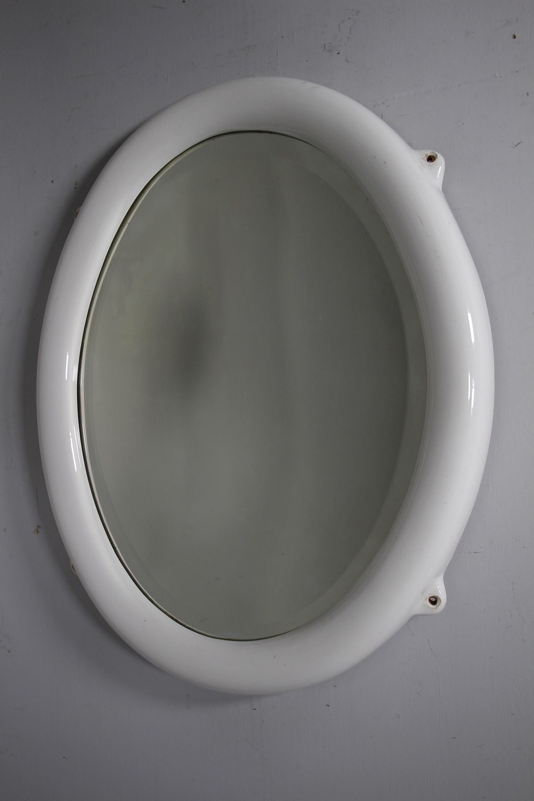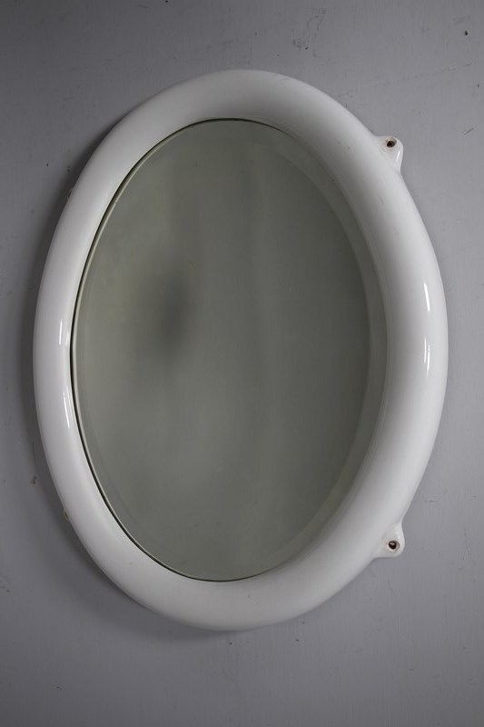 Quite rare to find now, original English antique large oval shaped wall mirror in creamware porcelain with four matching lugs for wall mounting. In excellent condition, dated 1920 and having the original clean bevelled mirror plate and original back. No damage at all, lovely and clean, can be hung both portrait and landscape ways. Often this style of early 20th century mirror was used in bathrooms so not affected by moisture.