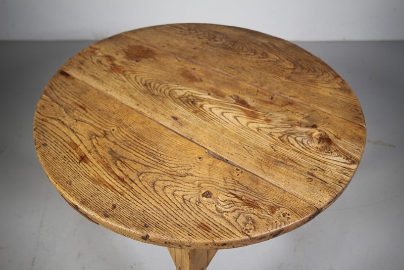 A lovely, chunky Georgian antique large sized cricket table made around 1770 in various countryside woods. The large circular table top is in thick elm whilst the three legged cricket table base is in pine and sycamore. In excellent original condition, good colour, a perfect dining height and all very solid.