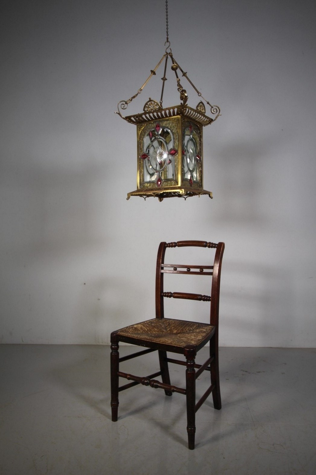A beautiful English high quality antique hallway hanging lantern, very well made in cast brass with an ornate fretwork top and bottom along with clear cut glass panes and diamond shaped cranberry glass panes. Leaded to the centres are unusual oval convex and cut glass panes. In superb condition, all very complete and intact and complete with the original four ornate hanging chains. English and dating to around 1860-70. to the top of the chain hook, the height is 75cm. The actual lantern is 45cm high.