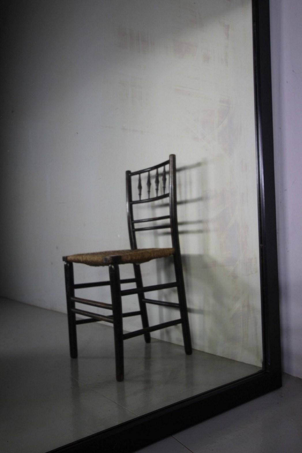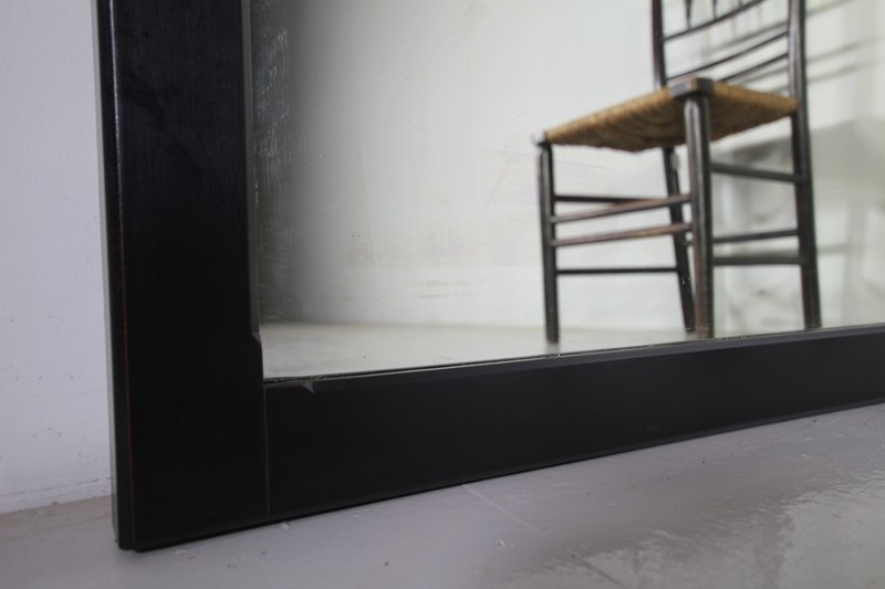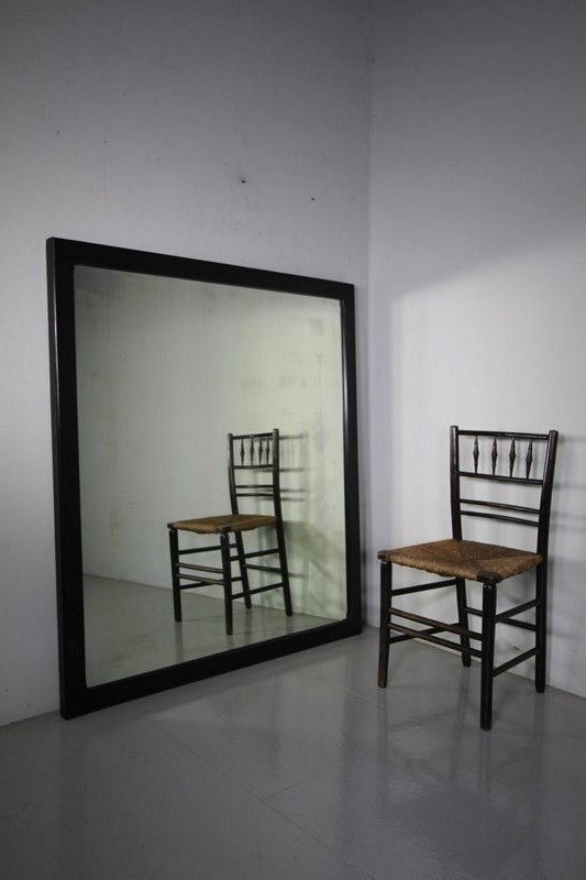 A good quality large antique Outfitters shop fitting mirror that has a wonderful original mirror plate with a lovely ebonised pine frame that is in superb condition, a large size and complete with the original pine backboards which are also in very good order. Dates to around 1870.