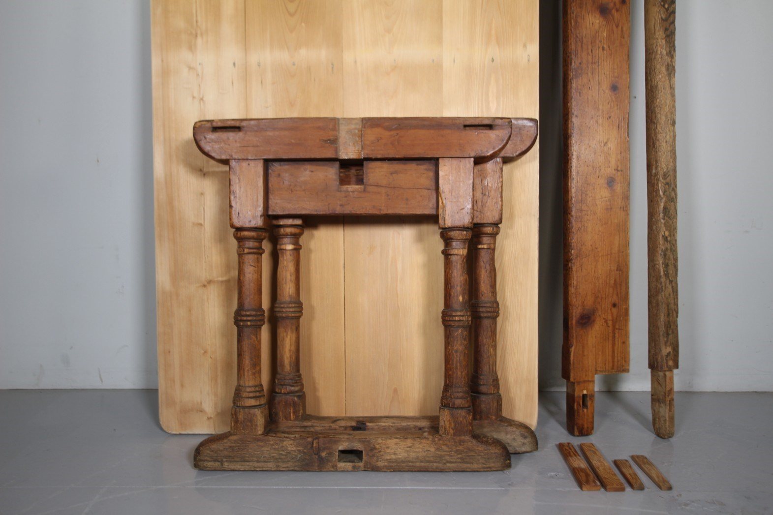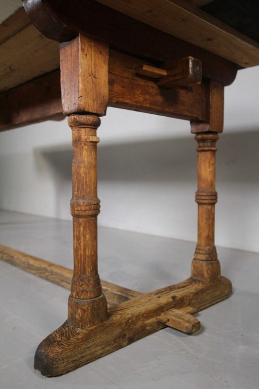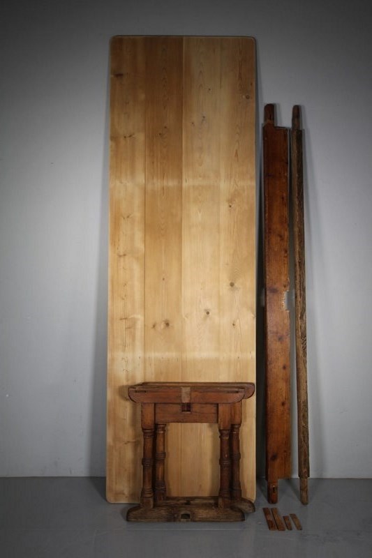 A large scale English antique pine dining table, a clever design, as it is made to come apart to allow access into an awkward area or up stairs. It is very sturdy and stable when all together, its very simple to put together with just four original pine wedges. A great size for a family kitchen or maybe even as a work desk. The antique pine table base is in the original finish and has four well turned legs that finish on sledge style feet which are connected by a central stretcher. The large scrubbed pine table top is all lovely and clean. English and dating to around 1860-70.