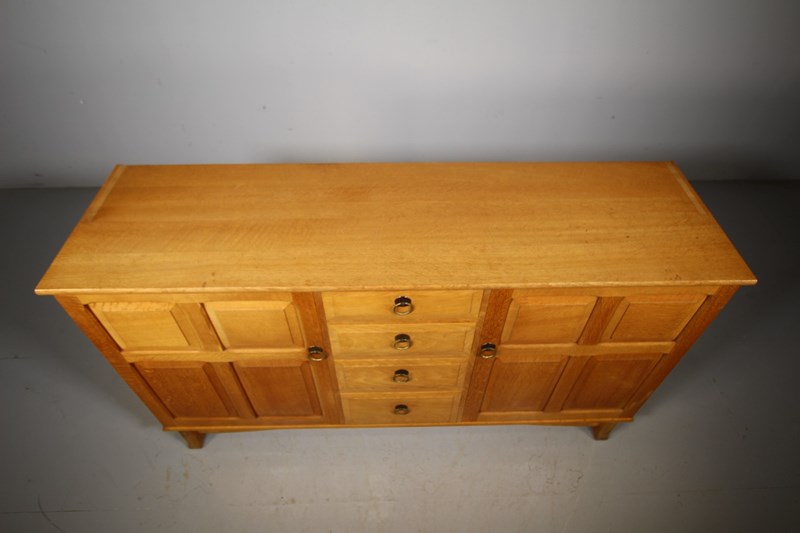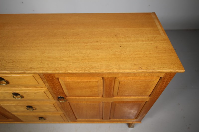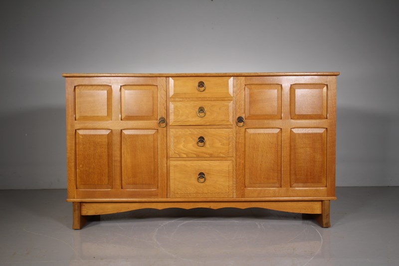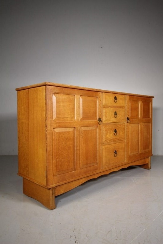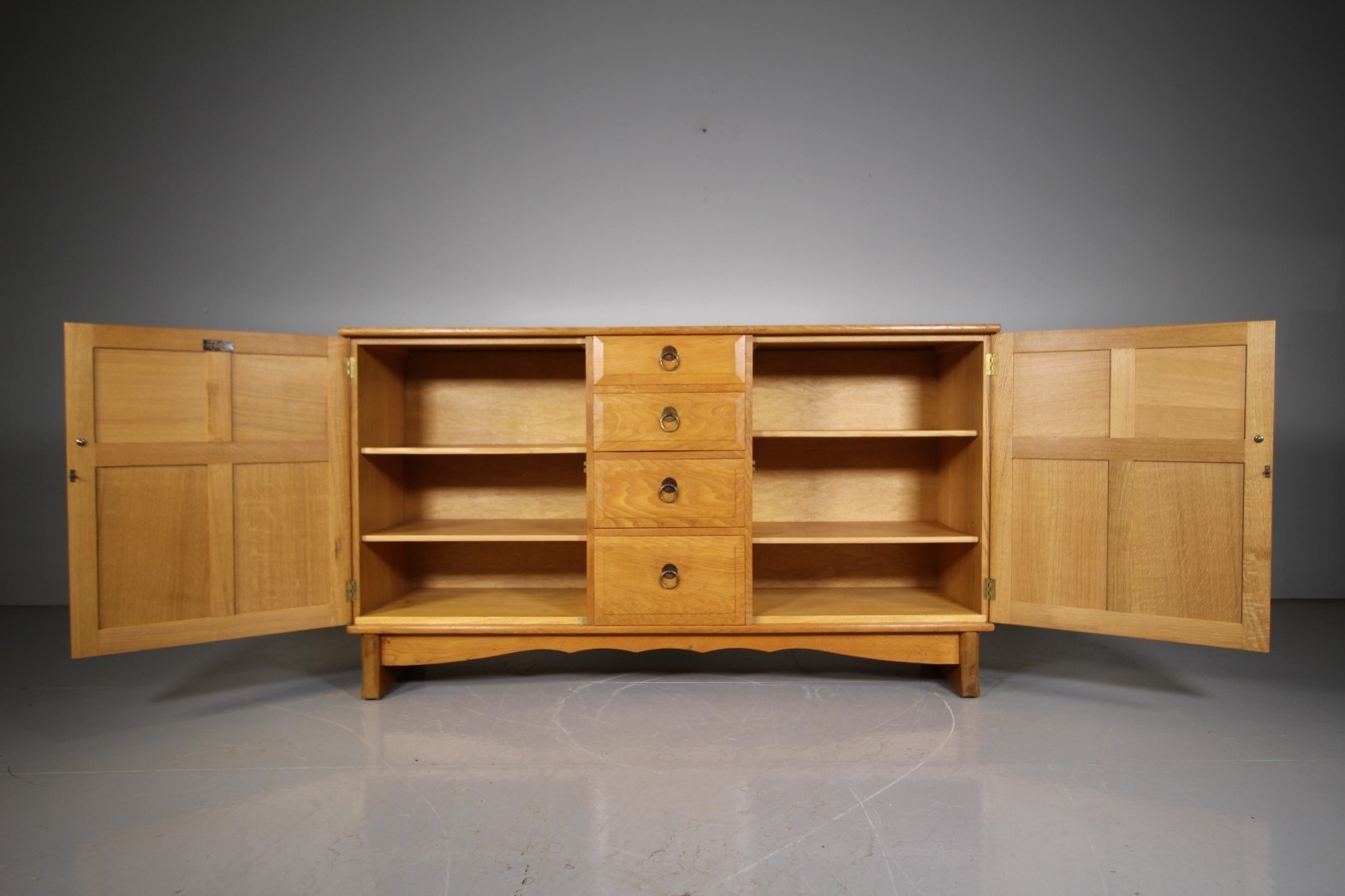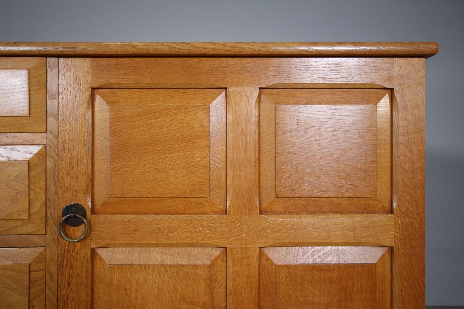 This is the best example we have ever had of a solid English oak dresser base or sideboard, made for Heals of London in the early thirties by Reynolds of Ludlow in the Cotswold School manner. It is a great size, the larger version and is in excellent condition and still in the original finish. The four central drawers all run well and have the original brass handles, flanking the drawers are a pair of raised panelled cupboard doors, inside are adjustable storage shelves. This Heals of London oak dresser stands on large sledge feet with a shaped apron between them. A superb model in solid oak.