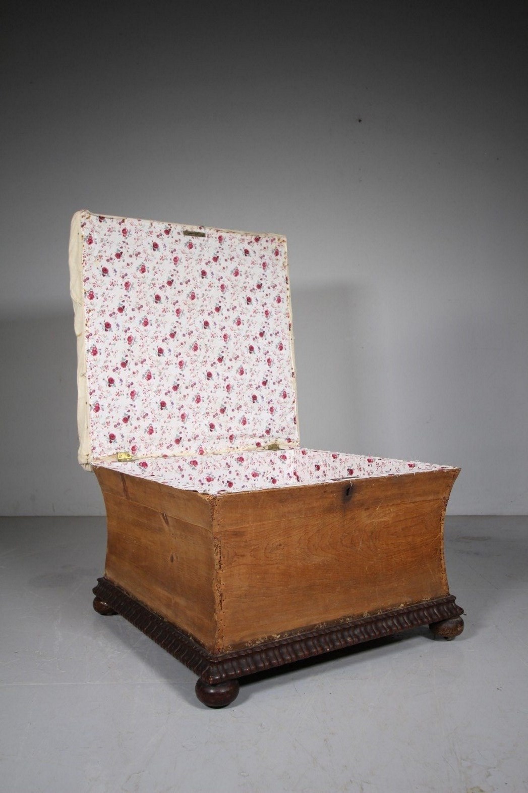 This is a beautiful sarcophagus shaped English antique country house ottoman which is a good size, square in shape with a hinged traditionally upholstered top seat, perfect to hide clutter within and being a great height to use as a large foot stool. Stands on original bun feet with quality inset brass castors and has a lovely moulded plinth in mahogany which is a great colour. Ready to re-upholster in a top finishing fabric. English and dating to 1815.
