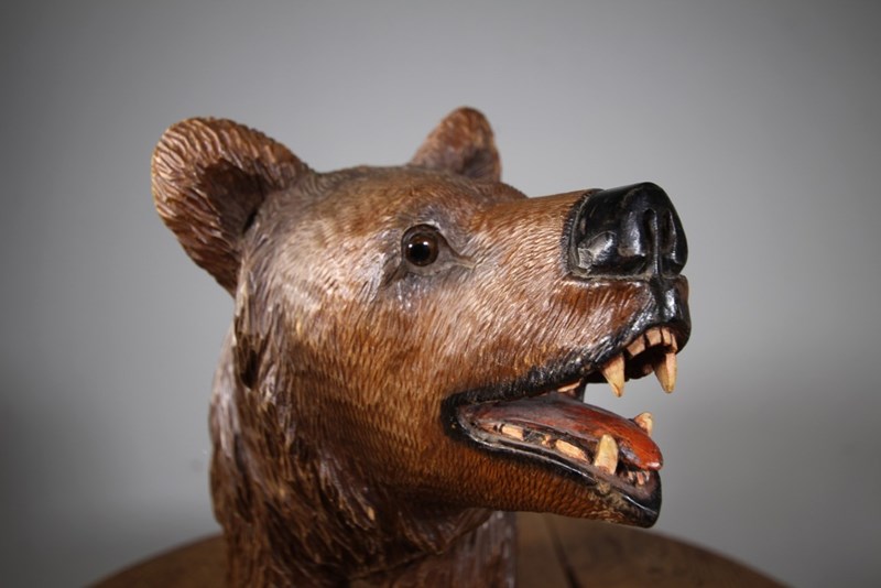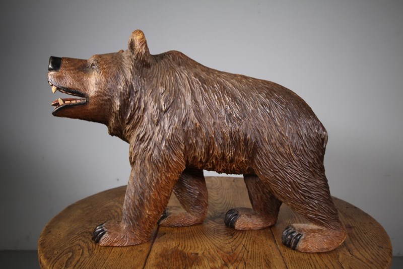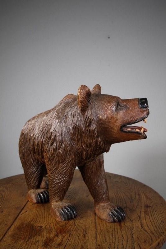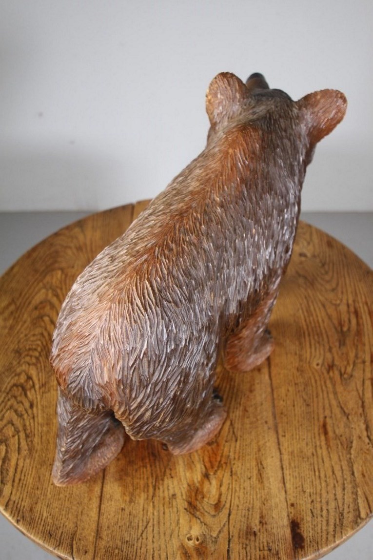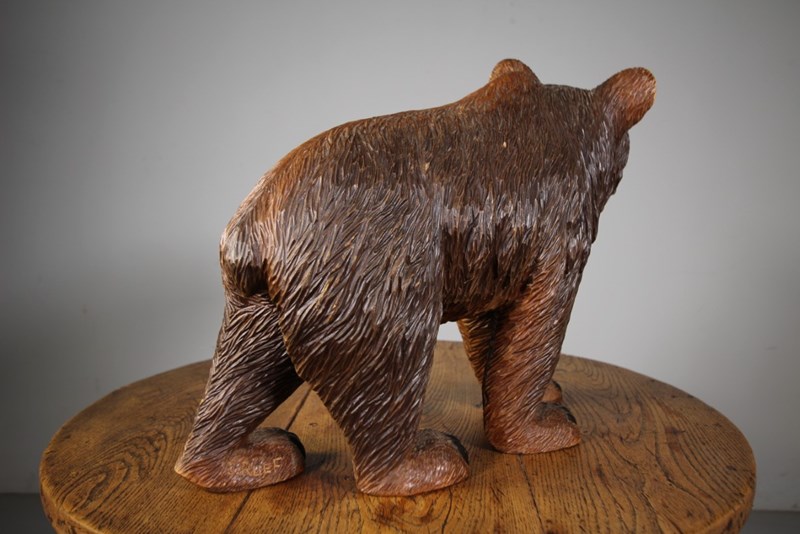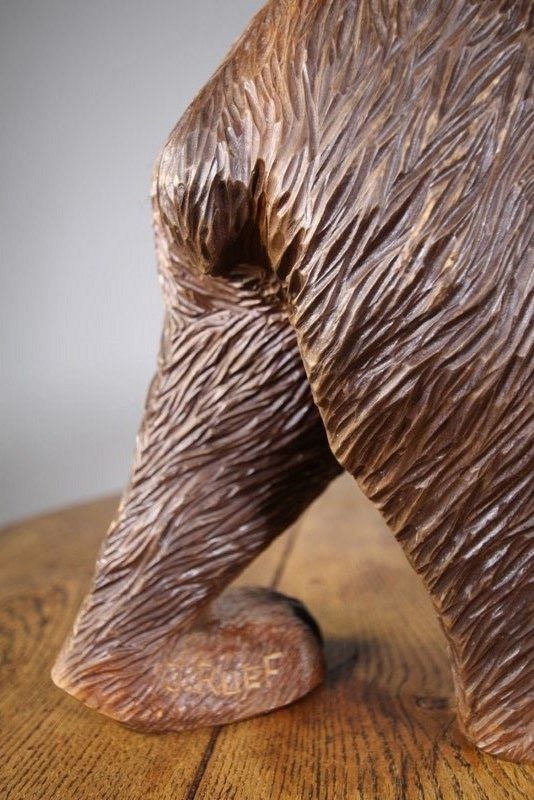 A finely carved Black Forest large antique stroller bear by the well known Swiss The Reuf Brothers around 1900. Great scale and in amazing original condition with glass eyes and in the original finish. This wonderful antique bear carving is signed by J.Reuf. The Reuf Brothers were famous Swiss Black Forest wood carvers from Brienz, they carved bears, owls and eagles. This is is a rare signed and beautiful example.