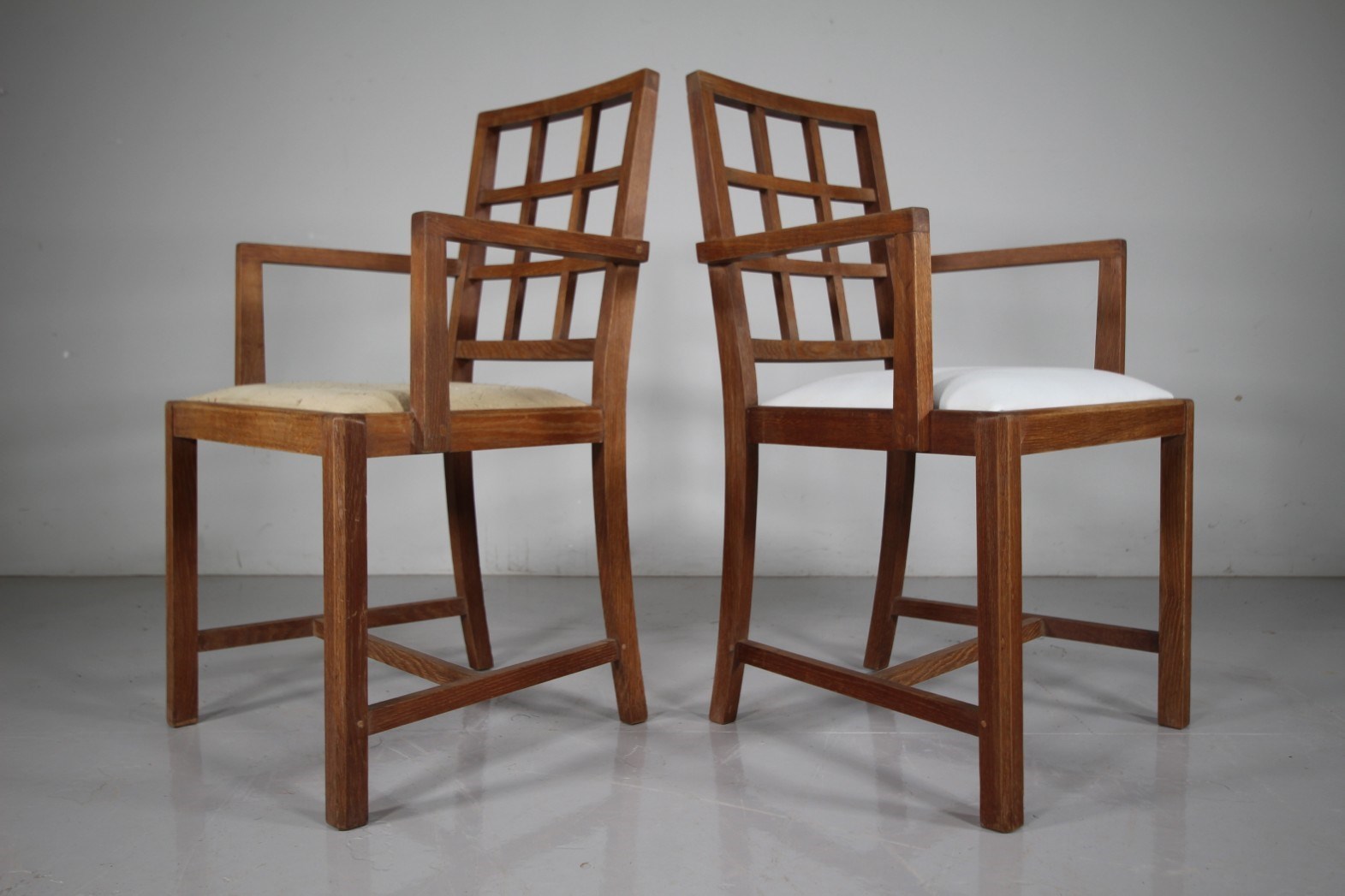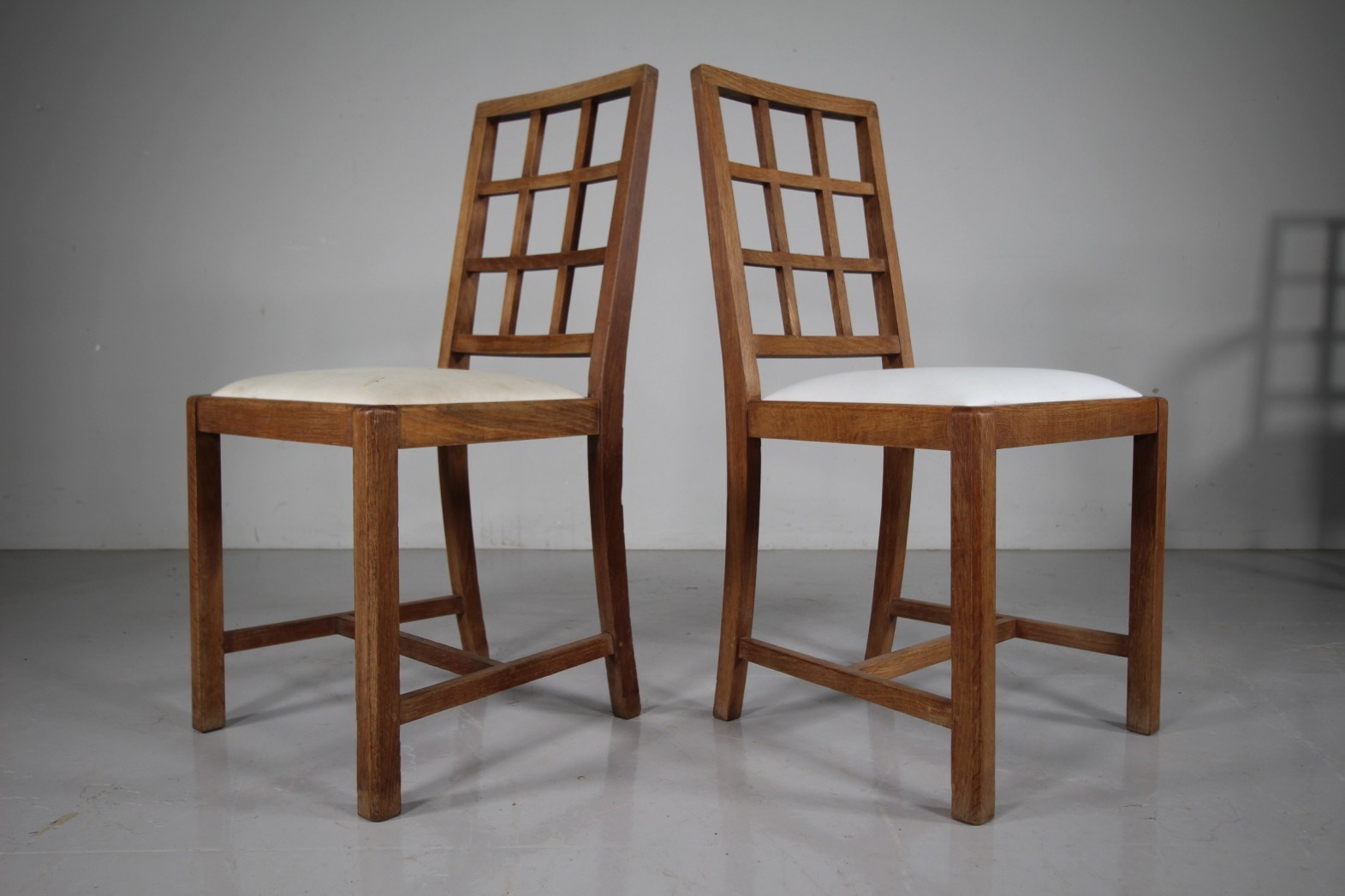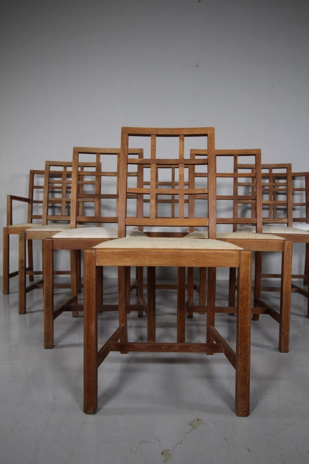 Long Set of Eight Heals 1920’s Oak Dining Chairs – Lattice Back