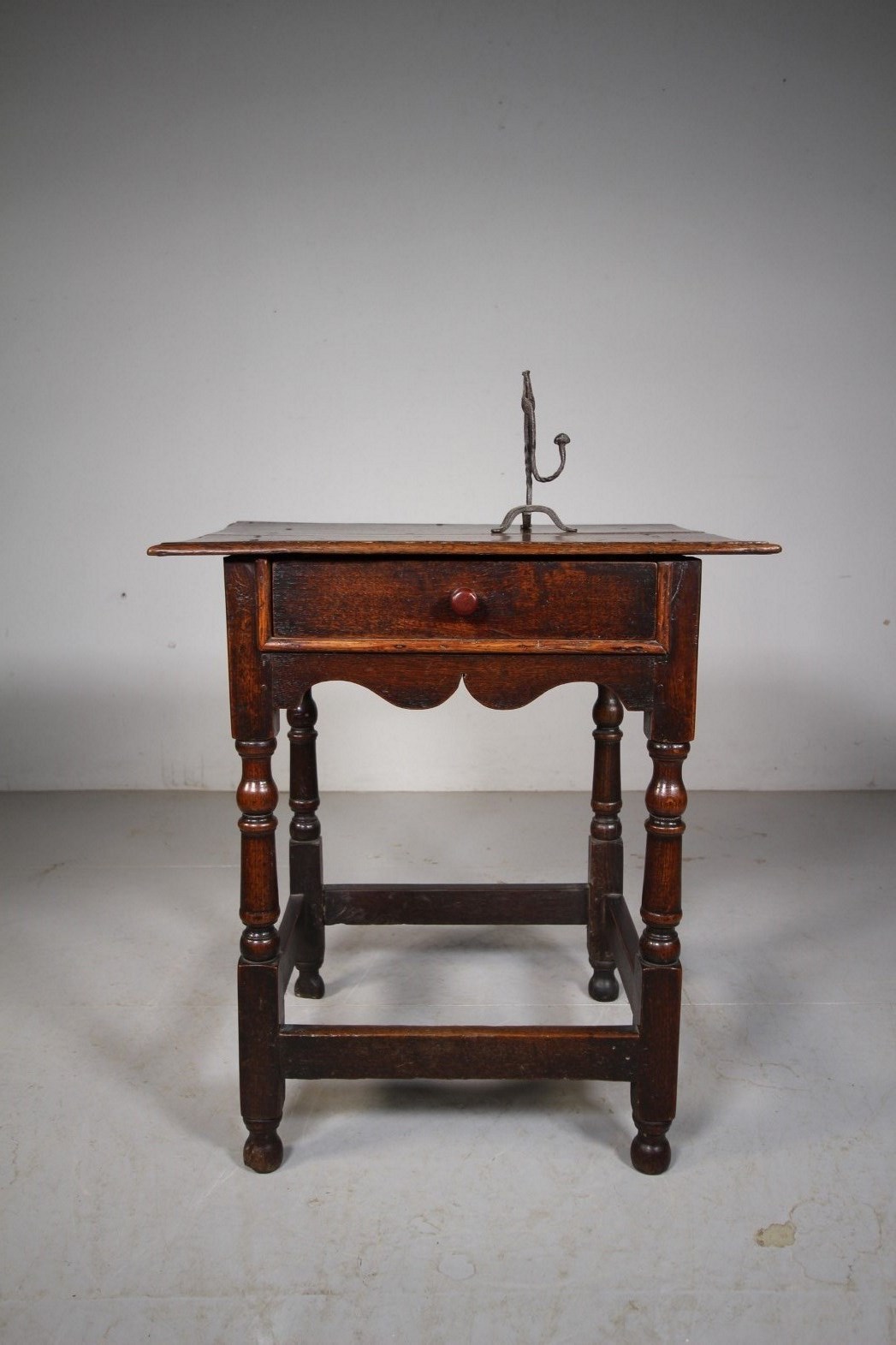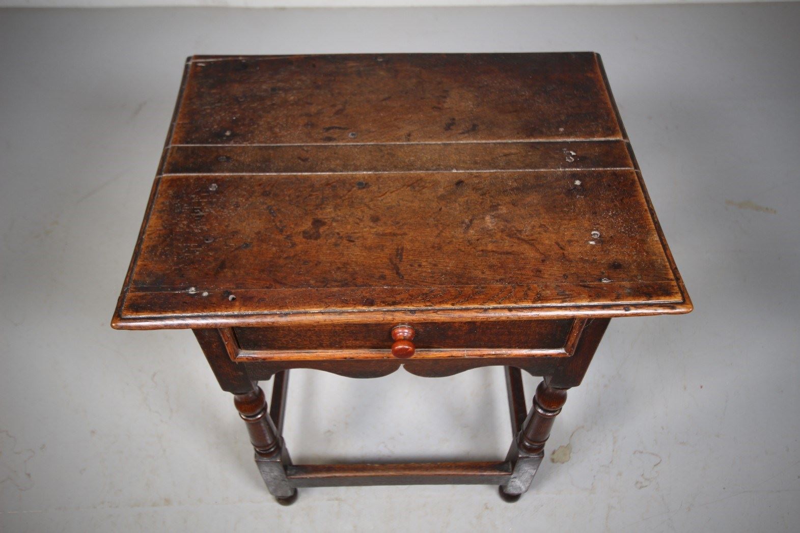 A very original, Georgian period oak antique side table that is a wonderful original colour and has a superb surface. It is a lovely size, much narrower than most and featuring very shapely sides and front friezes. In excellent, honest condition, stands on well turned legs that finish on original feet, the legs are joined by square stretchers. To the front is a single drawer which is moulded around the edge. A beautiful piece of English 18th century period oak furniture that hasn’t been messed around with, dates to 1760.