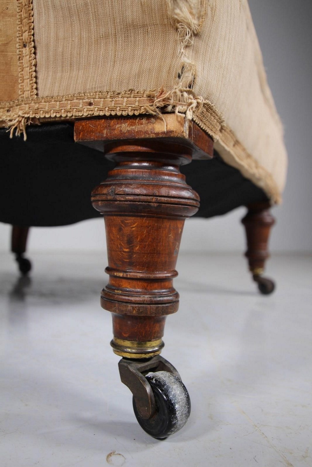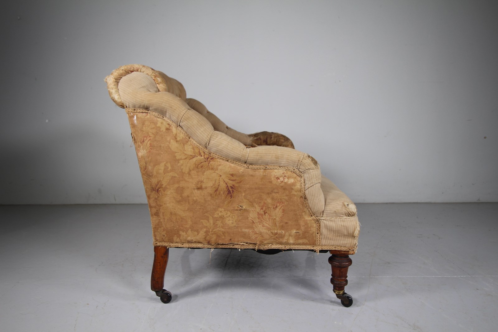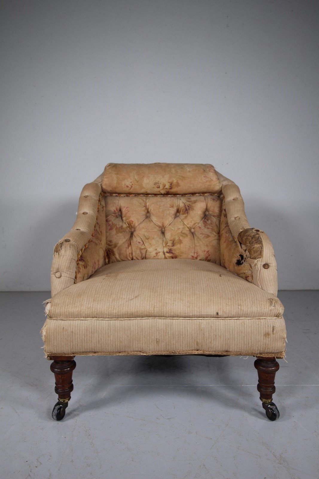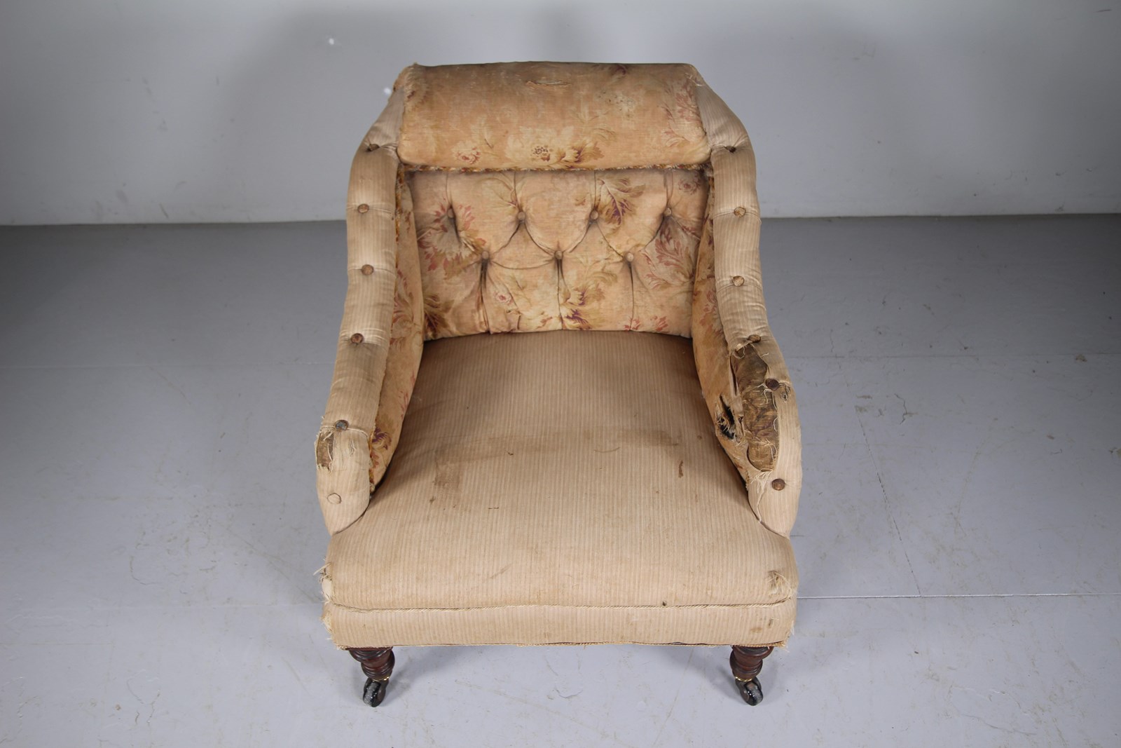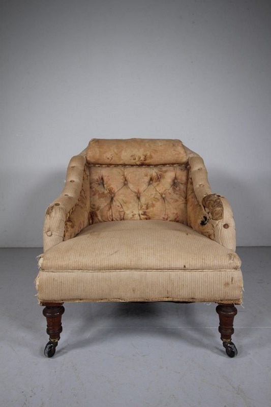 A traditionally upholstered English antique armchair that is a more interesting shape, all the innards are very intact and the chair stands on well turned front legs with slightly splayed back legs, they all finish on the original castors. A deep ample and comfortable model that dates to around 1830-40. Ready for a new top finishing fabric.