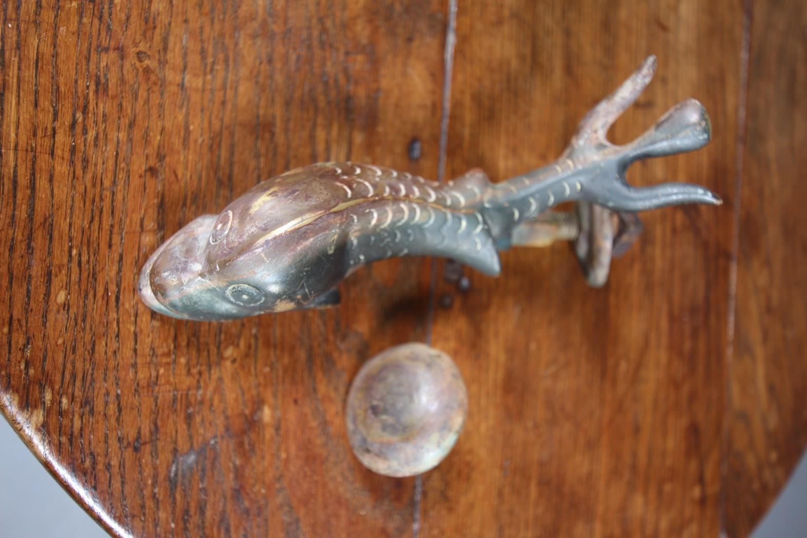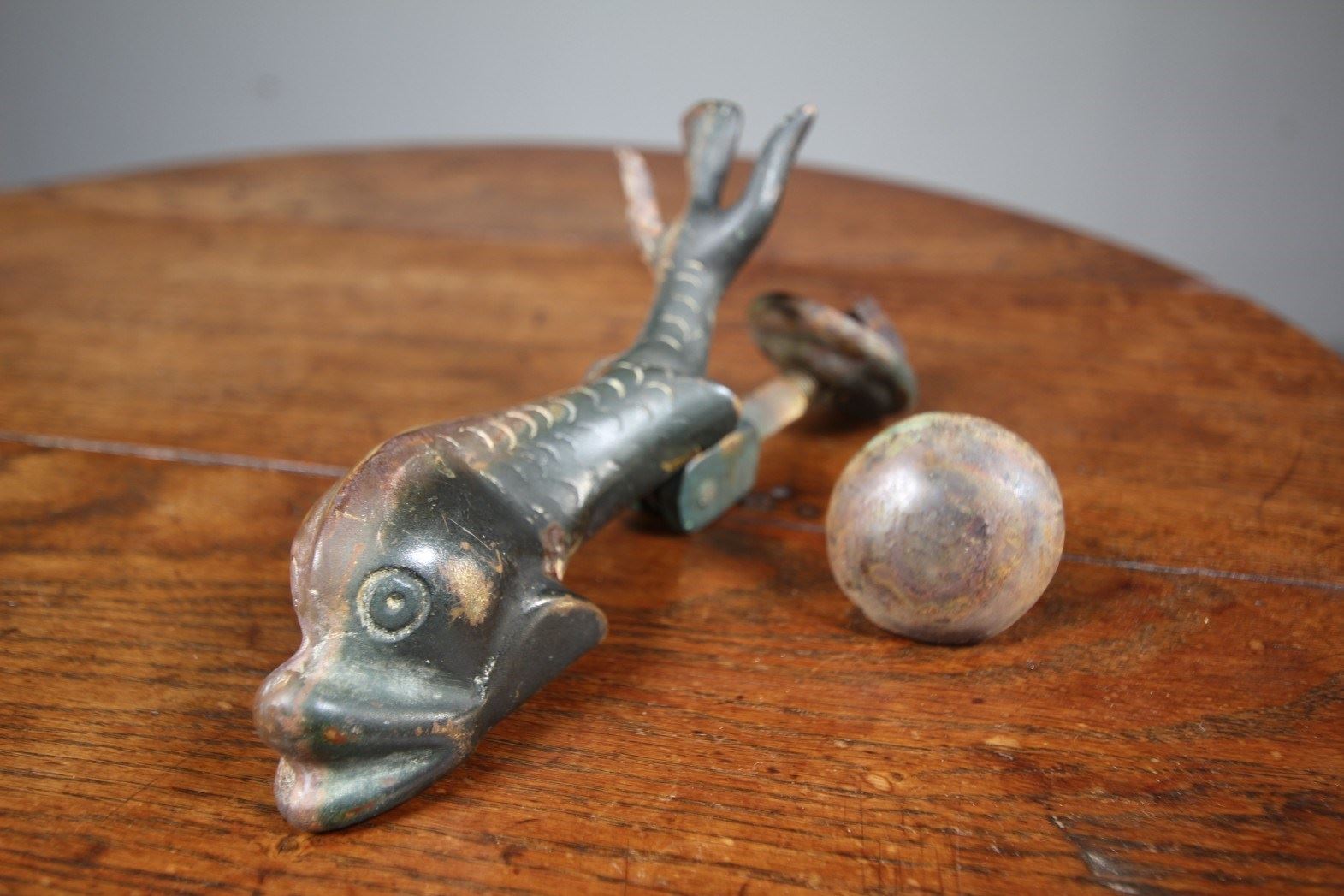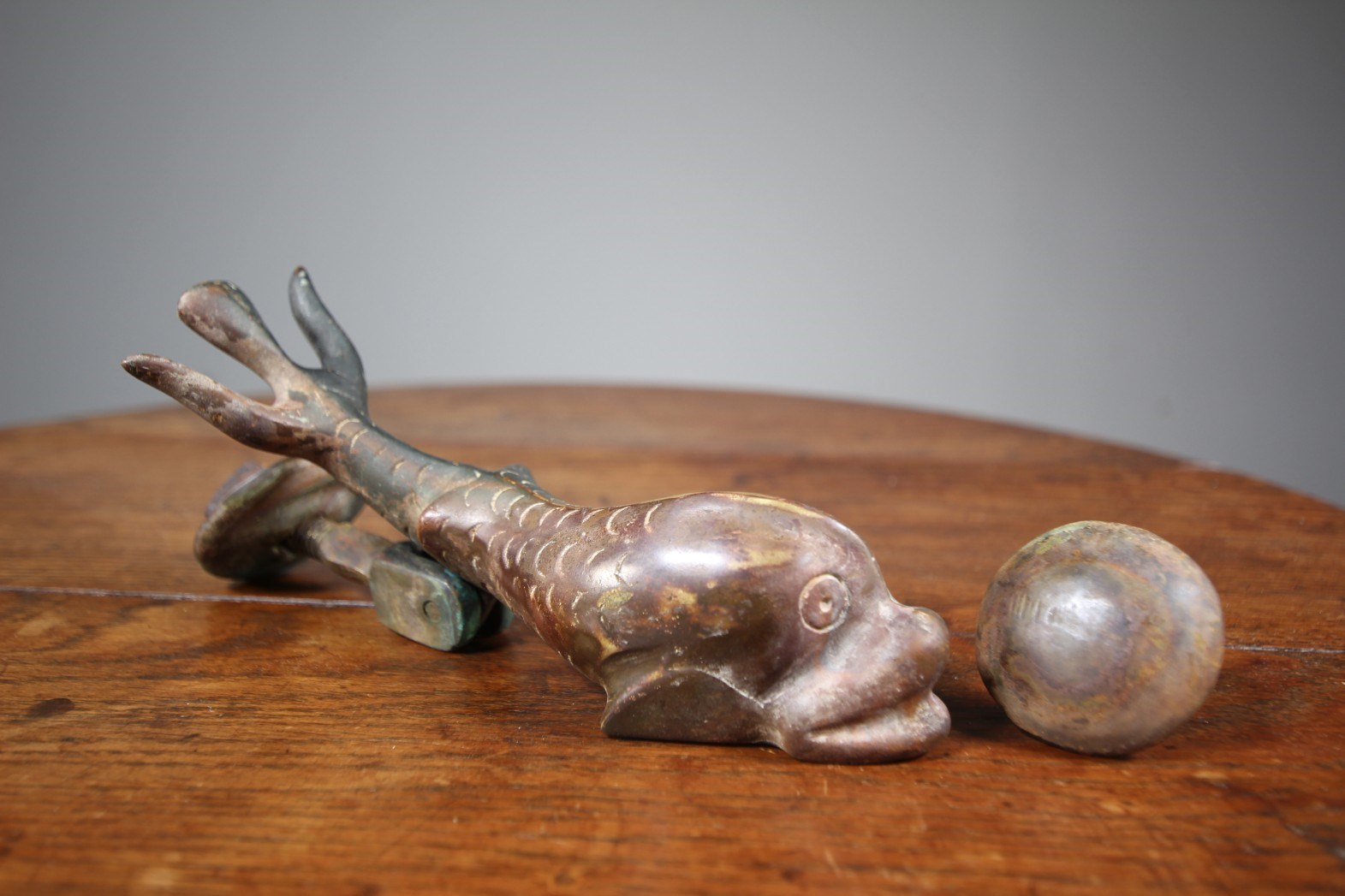 A solid Bronze English early 19th century antique bronze door knocker in the form of a shapely Dolphin complete with the striker and threaded bolt and nut to attach to a door. In excellent condition and a very lovely colour. Dates to 1815.