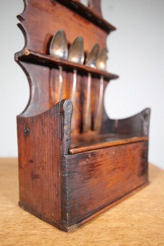 This is a beautifully shaped, English 19th century spoon rack which is an unusual, smaller size, very well made in pine and still in the orignal finish. This country kitchen antique piece combines a spoon rack and also a candle box with the lid that slides forwards. In excellent original codnition, comes with some early antique copper spoons.