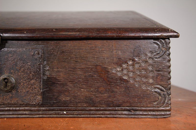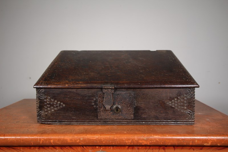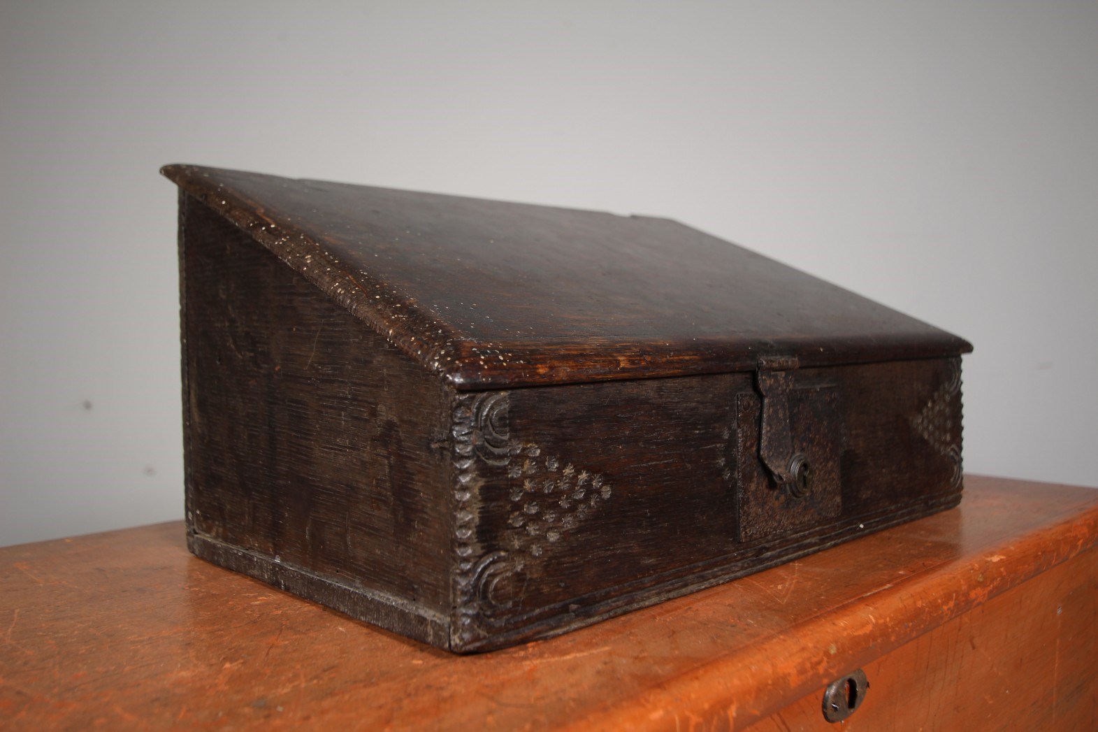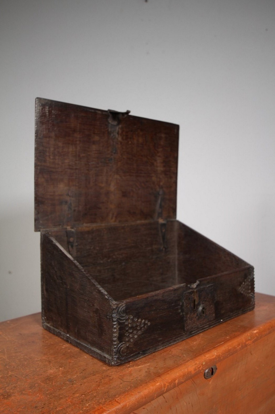 This is a beautiful, much smaller than usual, totally original 18th century period oak antique box with a slopy lid and original punch and chip decorations to the front. Lovely original iron work and all a very good original colour. Excellent, honest condition. Perfect for stationary, keepsakes and jewellery. Dates to around 1760.