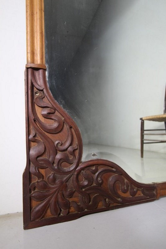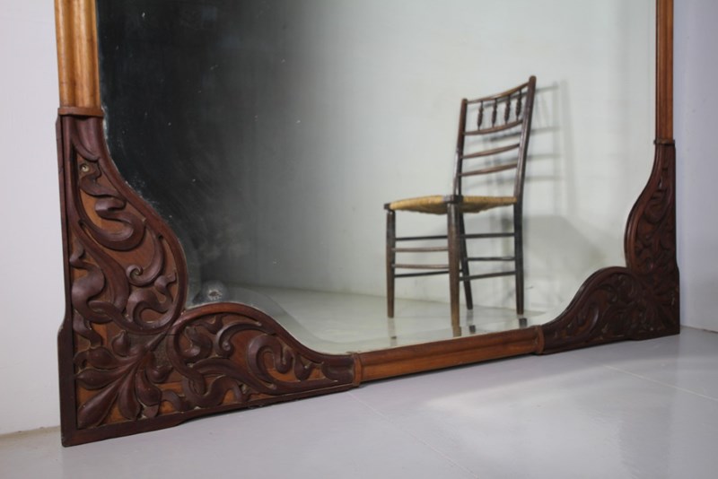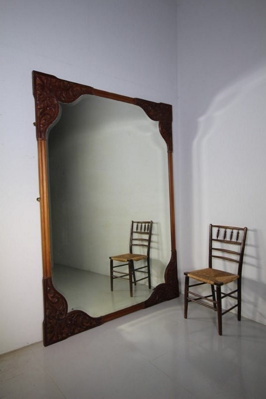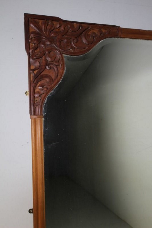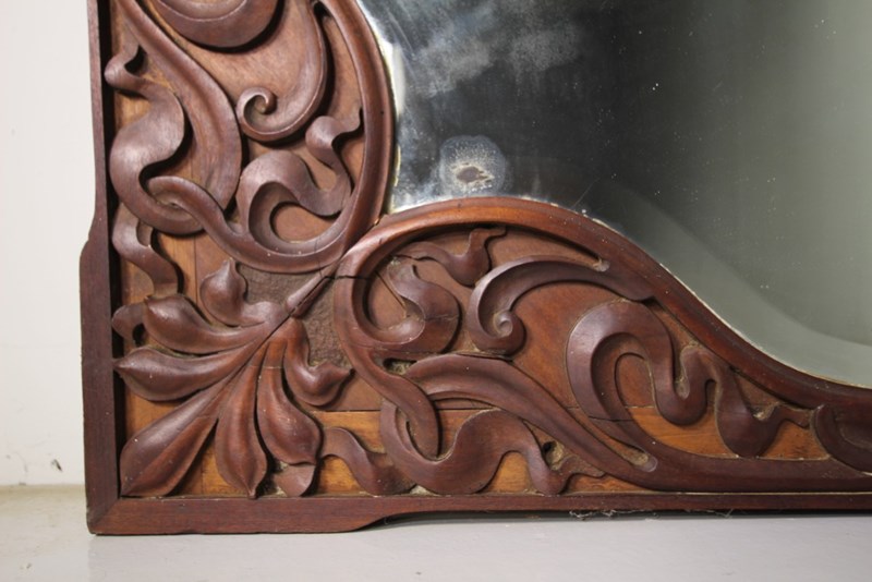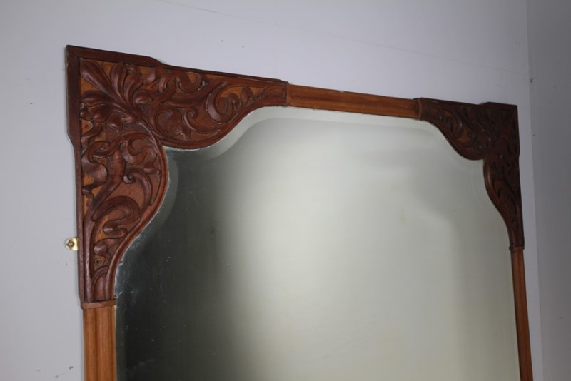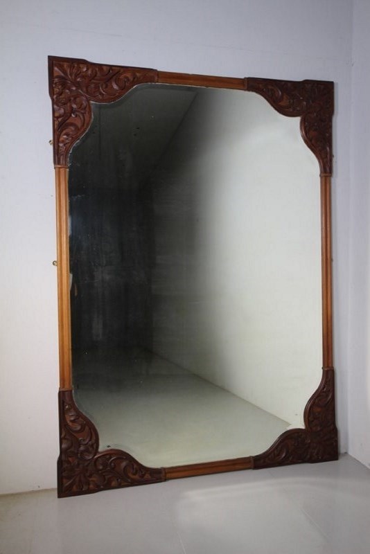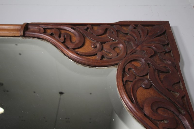 This is a wonderful, large scale English antique wall mirror in the Moorish manner with hand carved foliage to the shapely corners and moulded connecting surrounds. Been in the same family home for over 70 years. Rare to find an English antique wall mirror of this size and with a wonderful, shaped and bevelled thick mirror plate. Due to the symmetrical design, this large English Arts & Crafts antique mirror can be hung both portrait and landscape ways. In excellent condition, the hand carved frame is all very intact and the original mirror plate is also in very good condition. Has a later solid wooden back. A rare and fabulous Moorish antique mirror of very large scale.
