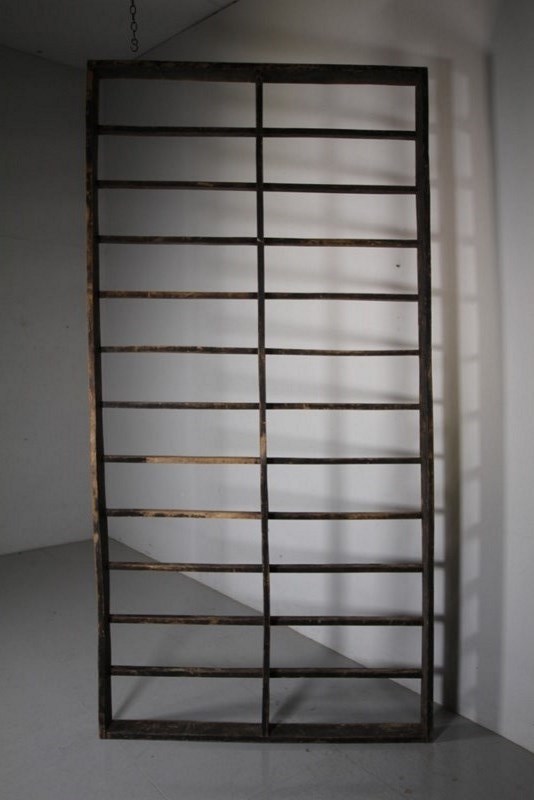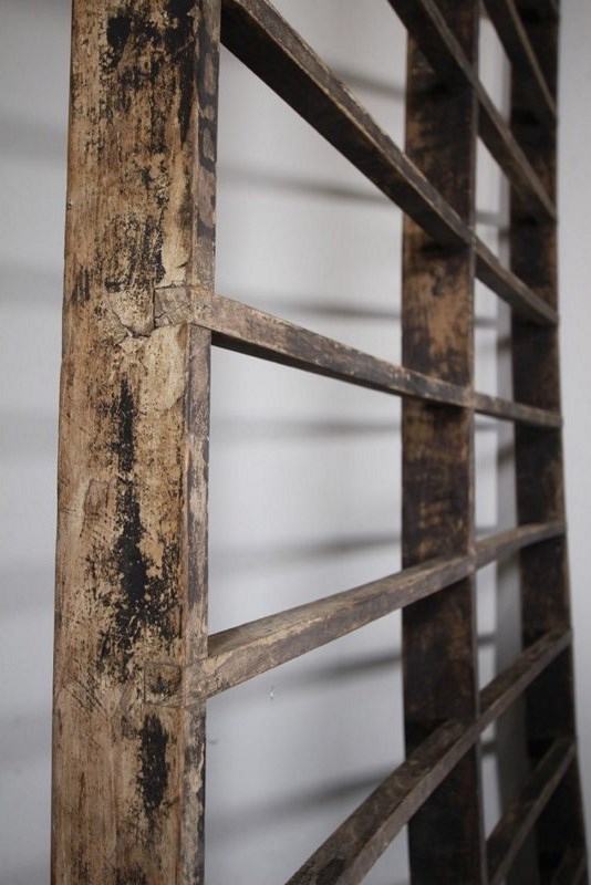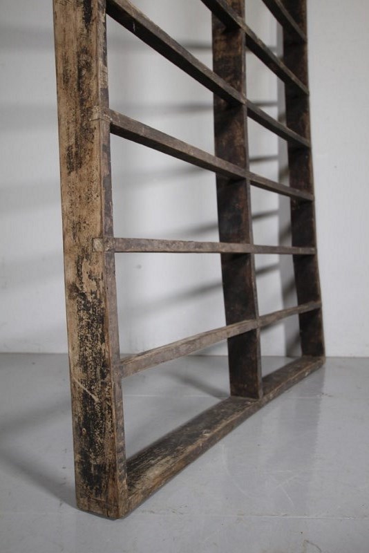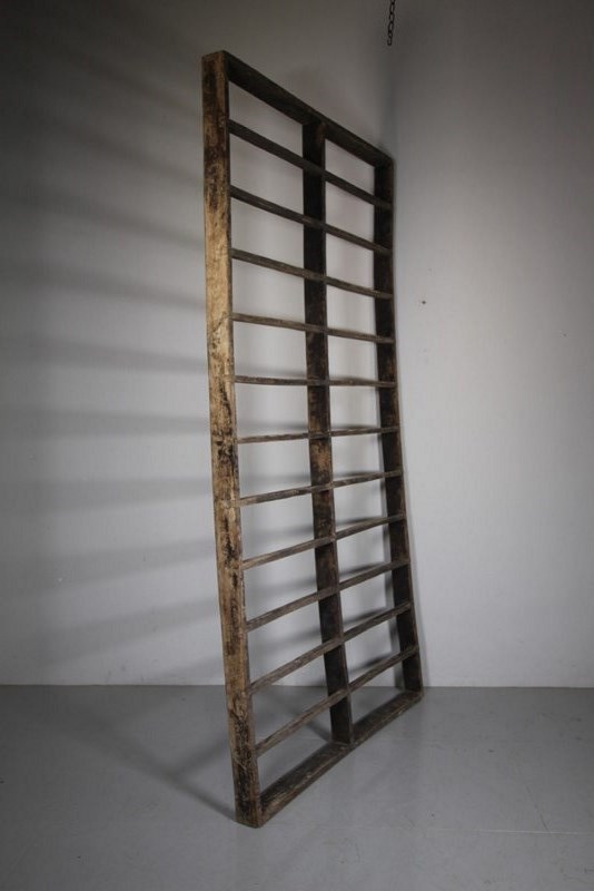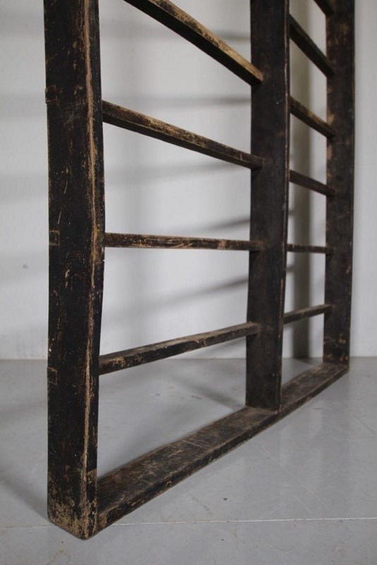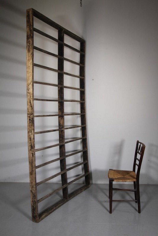 Very well made in solid Welsh elm woods, this huge 18th century antique rack was originally made to dry oat cakes, due to the size, probably for a large country estate. Beautifully made and very strong. Would have been hung parallel to the floor like a hanging kitchen utensil and pan rack, which it could be used for now in a large country kitchen. It does look amazing just leant up against a wall too, for linens and towels. Welsh and dating to around 1750.