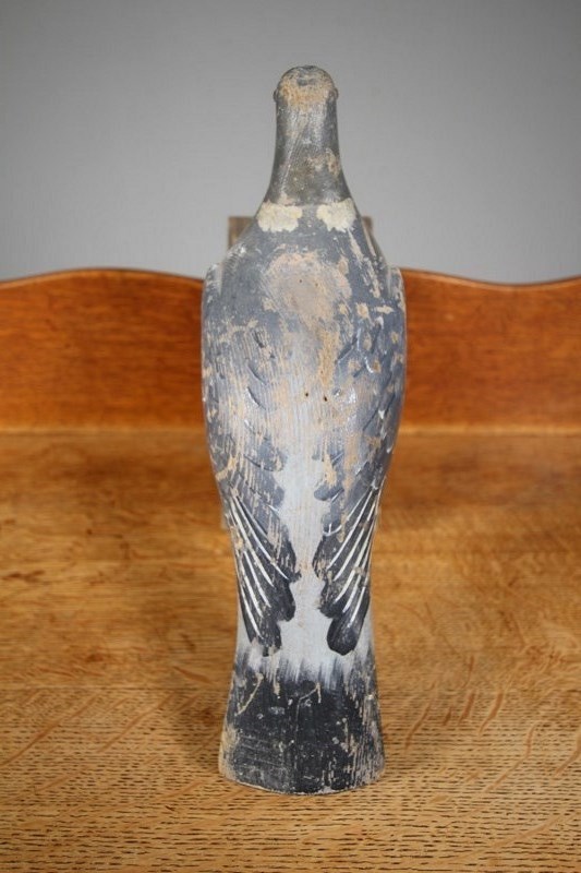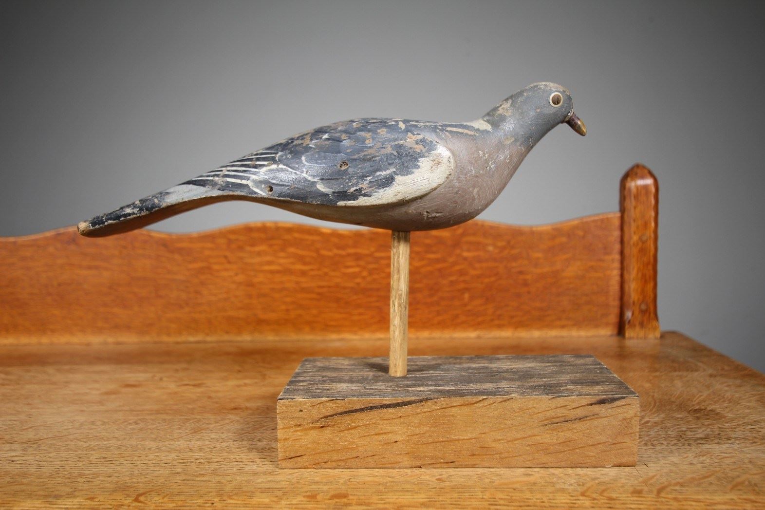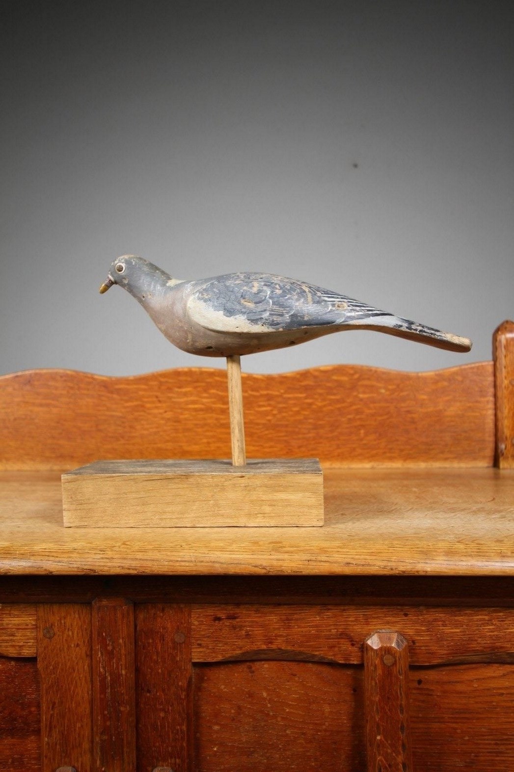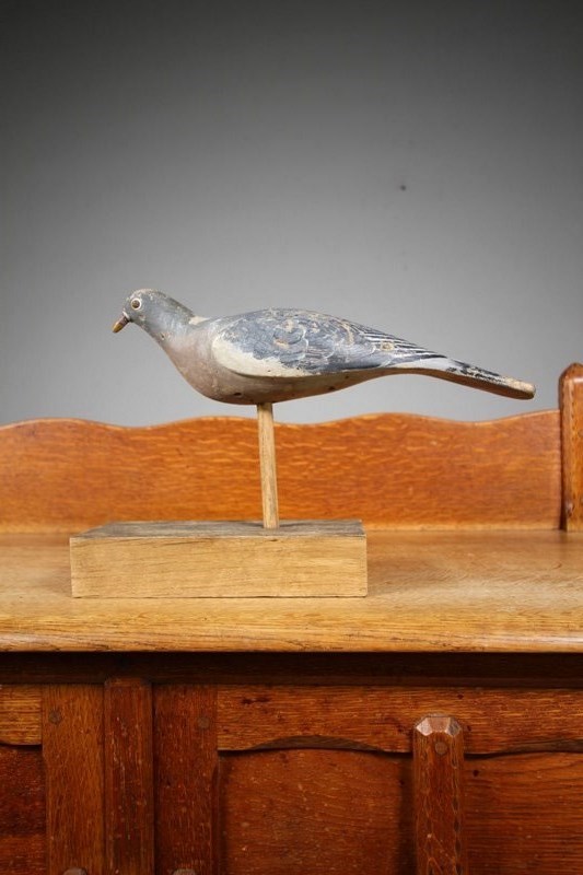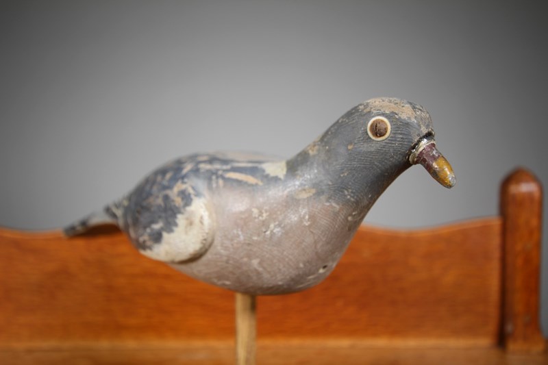 A lovely shaped English antique decoy wooden pigeon that is still in the original paint finish, also complete with the original eyes and metal beak. In very good condition and mounted on an oak timber block. Dates to around 1880.