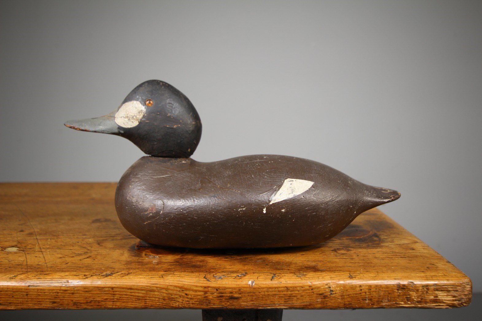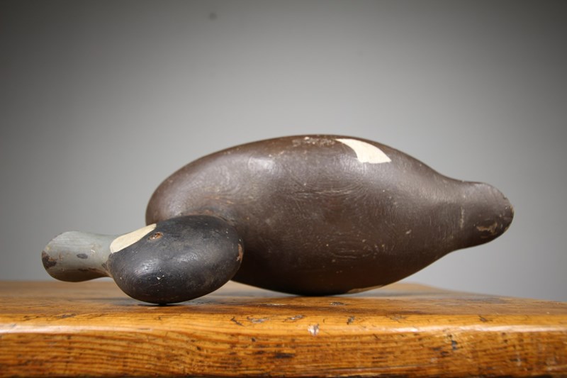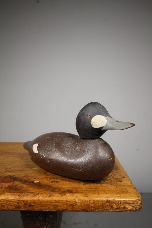 A lovely, totally original English antique decoy duck that dates to around 1900 and is still in the original paint and with its original glass eyes. Not one of the many fakes out there at the moment!Underneath has the original lead weight with leather attachment. A good example that is well shaped in pine and in the original paint finish.
