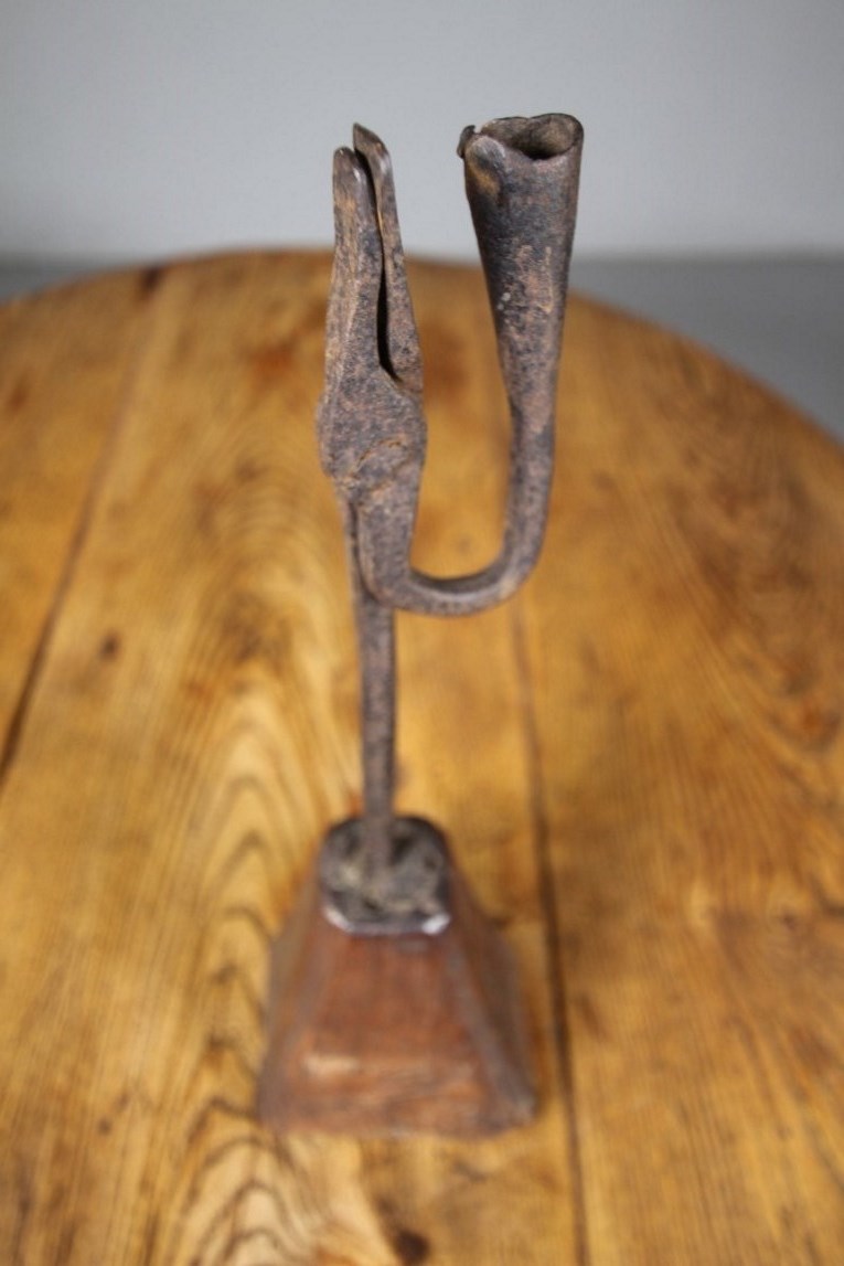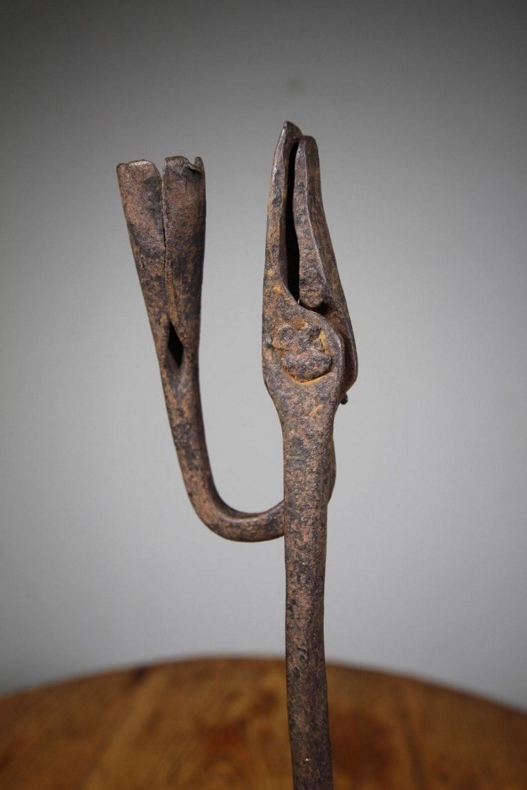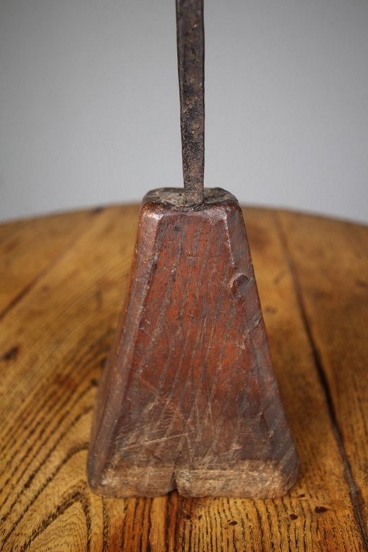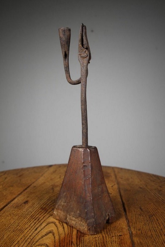 Original English Georgian Antique Rushlight A very original mid 18th century antique rushlight or nip. An early primitive form of antique lighting for country homes and farmhouses. Totally original having a square iron stem, the rushlight nip holder has a candle holder too. Mounted on the original elm shaped base. Stands firmly, the nip opens as it should, all in very good condition. DimensionsHeight: 35cm (13.89")Width: 11cm (4.37")Depth: 8cm (3.17")