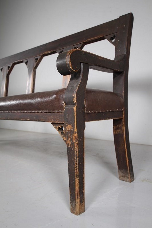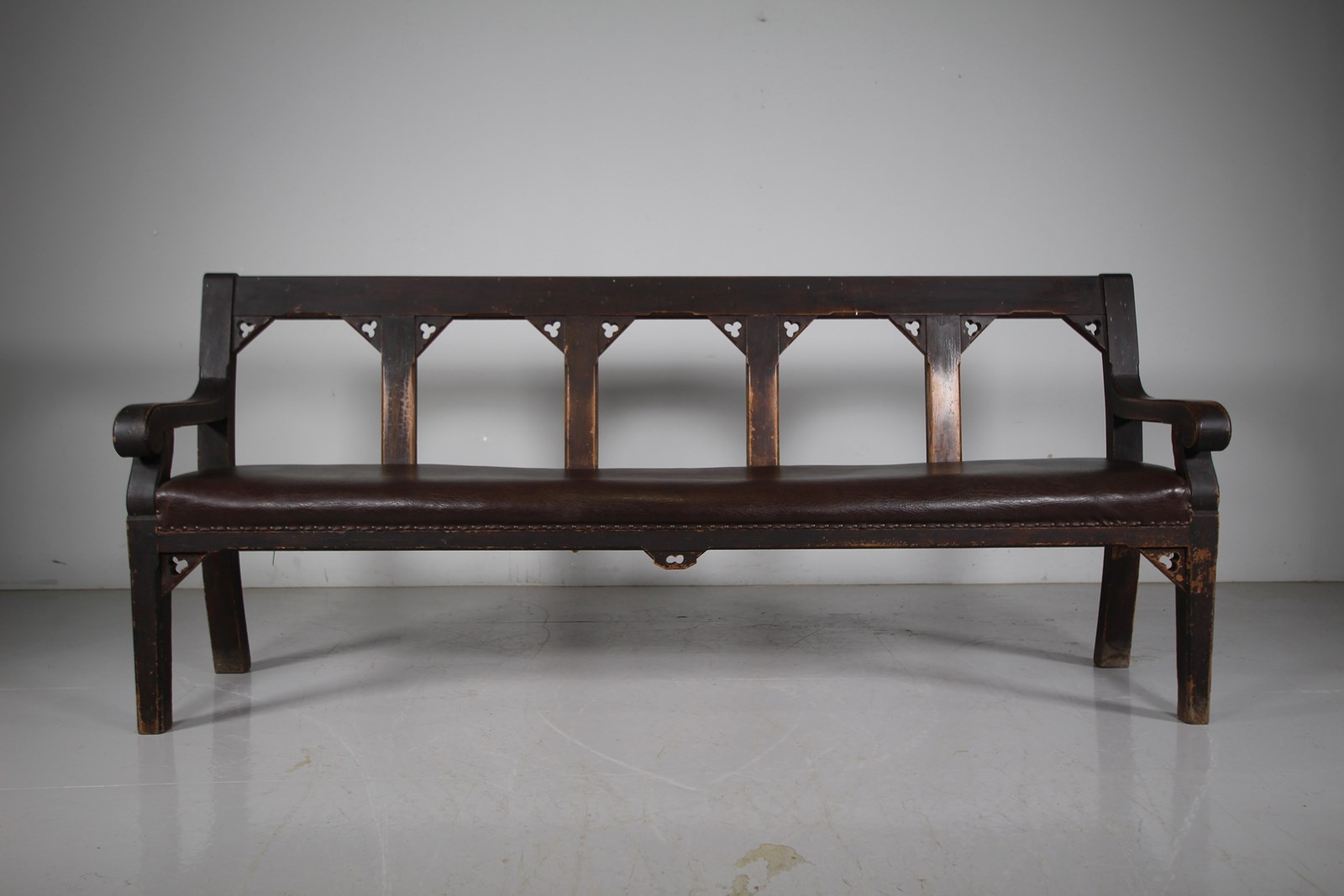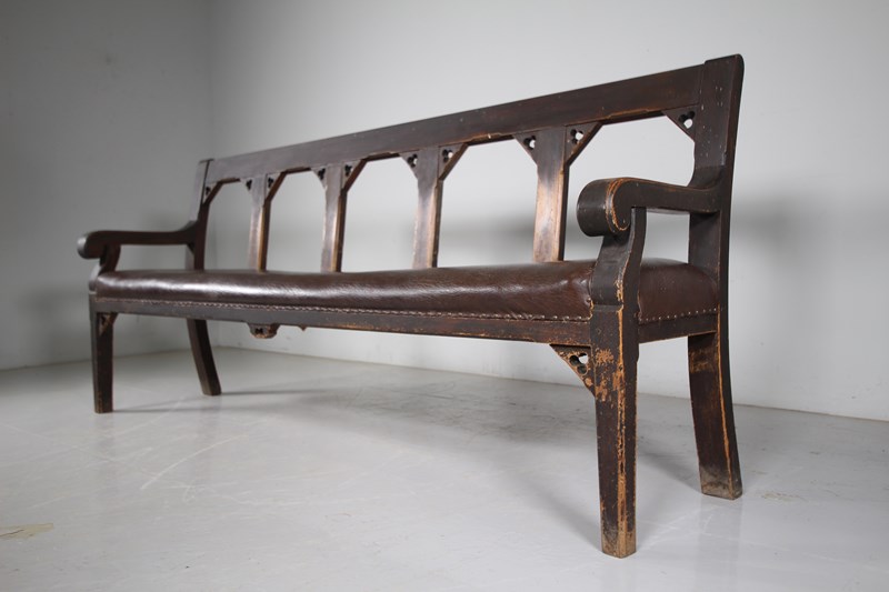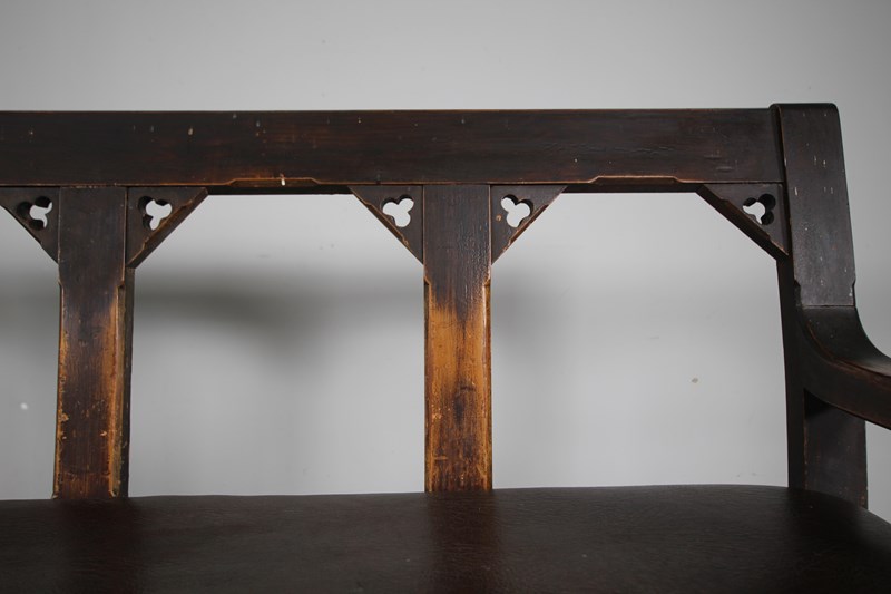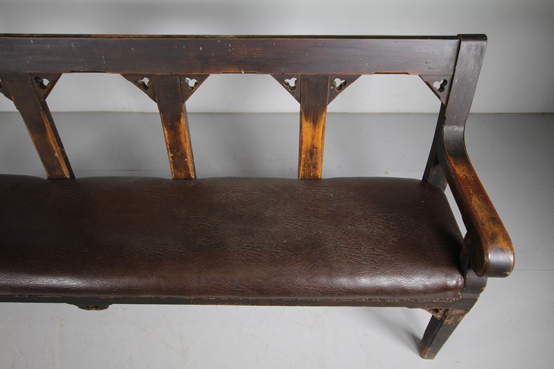 A wonderful English 19th century antique pine bench seat still in the original painted finish and with lovely Gothic corner brackets under the top rail and under the seat. All pegged construction with wide open arms and vertical back splats. The seat pad is upholstered in clean faux leather. In excellent, very solid condition, the seat height is 47cm. English and dating to around 1860.