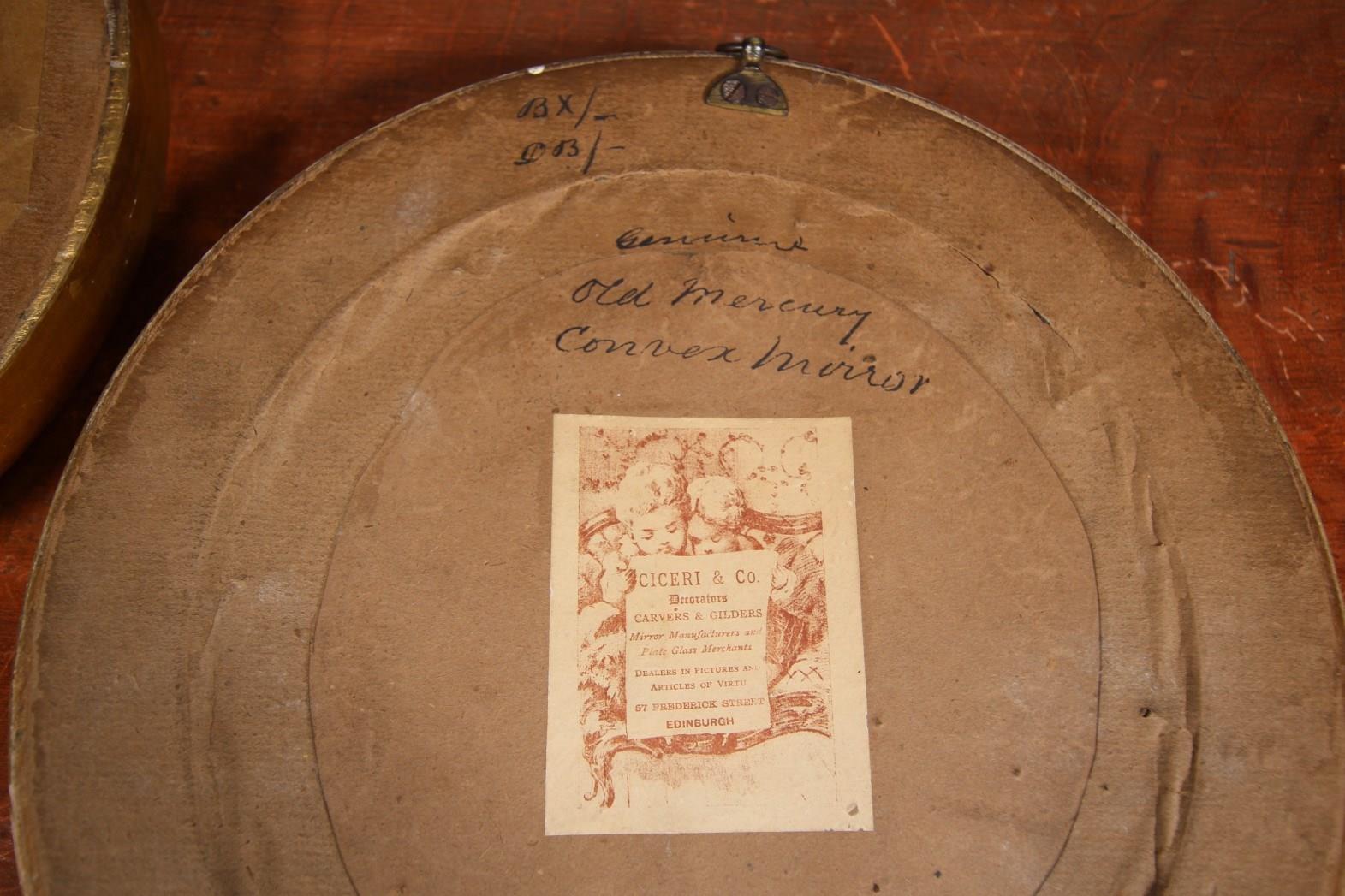 A lovely pair of late 19th century antique circular wall mirrors with original mercury convex mirror plates that are only slightly convex in shape. They are a true pair and in both in excellent condition. Very original and with the lovely paper makers / dealer paper labels on the backs, Ciceri & Co Edinburgh.