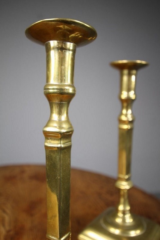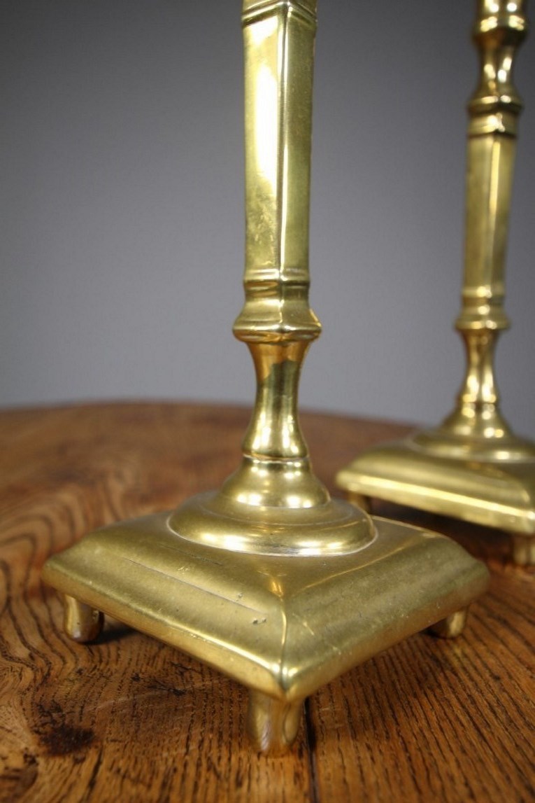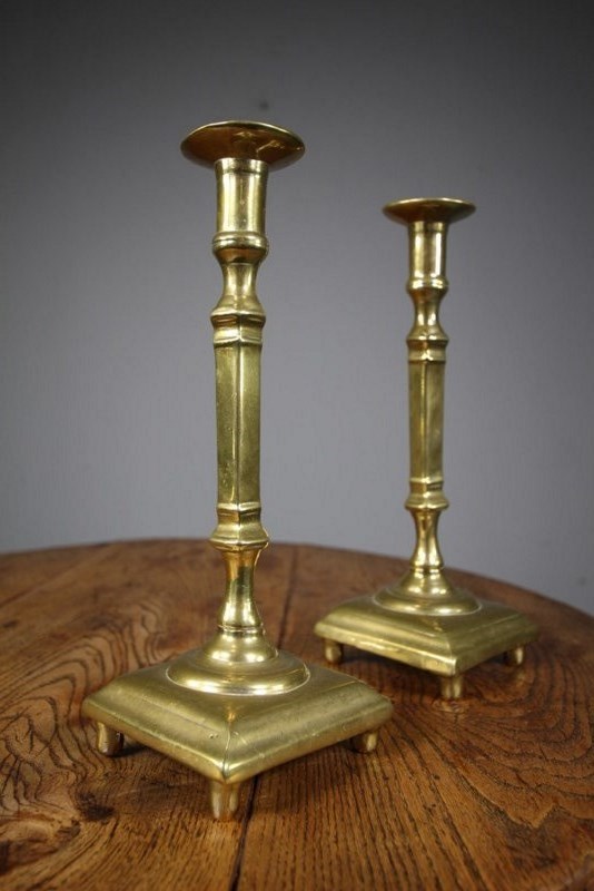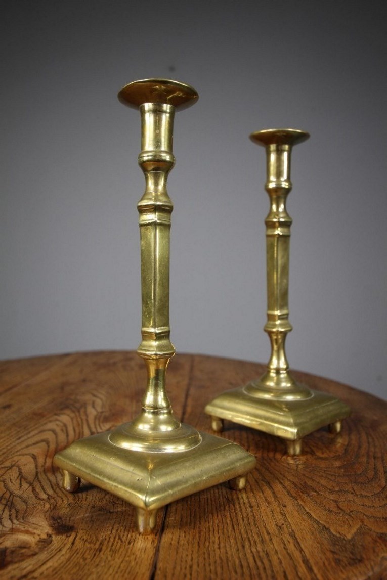 A lovely pair of 18th century cast brass antique candlesticks that stand on more unusual raised feet. They are both in very good condition with stepped square bases and turned stems that have a square central section. English and dating to around 1770.