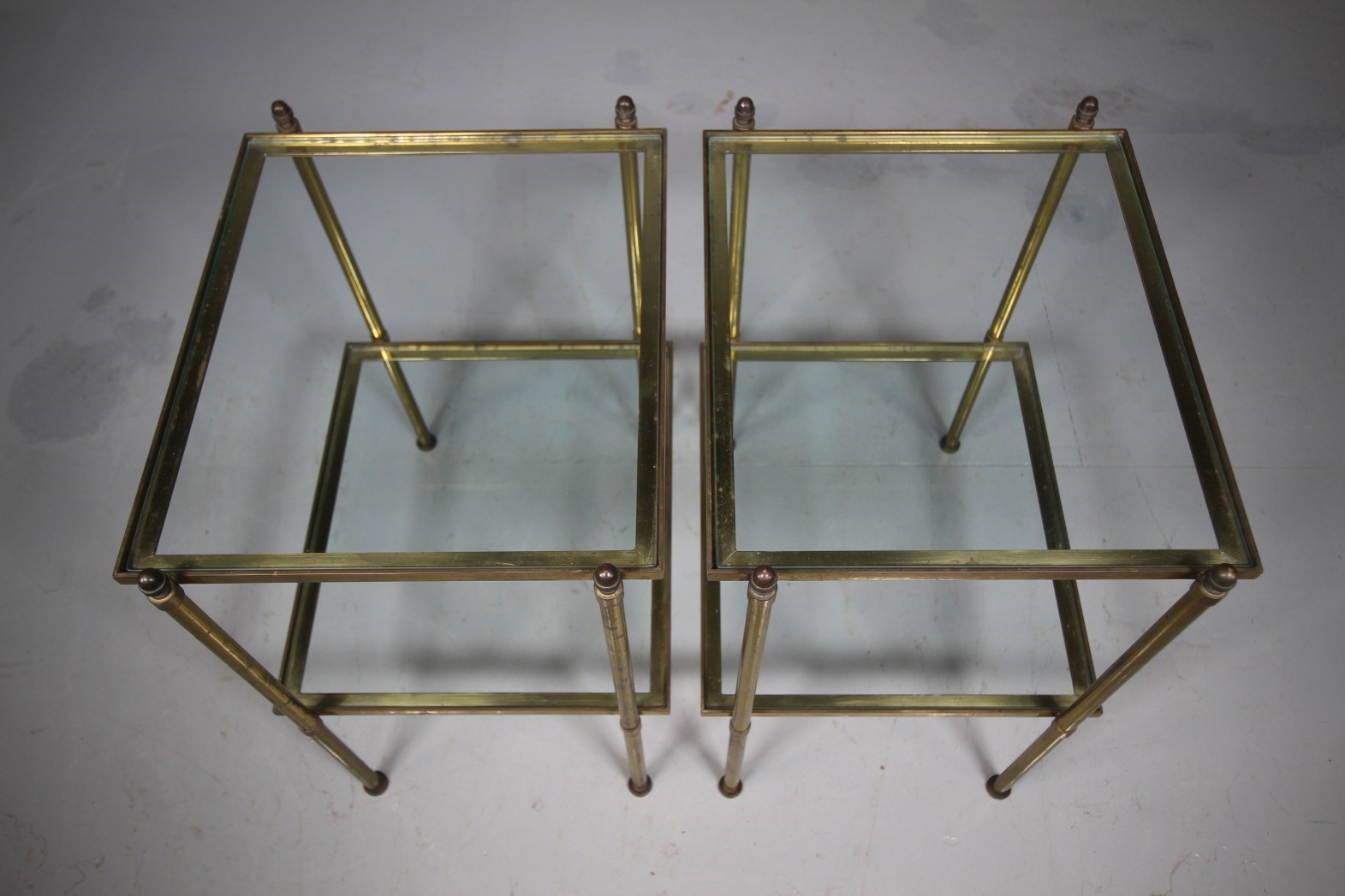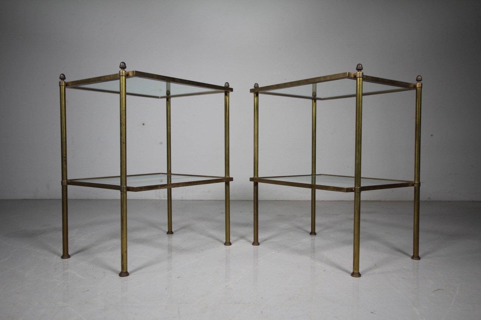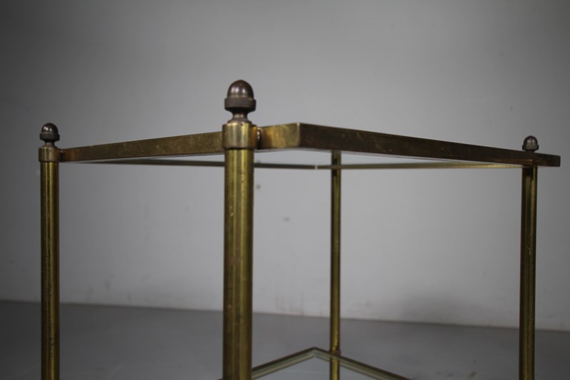 A decorative pair of English 1930’s etagere side table that are beautifully made in brass with lovely acorn finials to the top and standing on squat turned feet. Complete with the original clear glass drop in shelves. Perfect height to use as side lamps or drinks tables by armchairs and sofas.