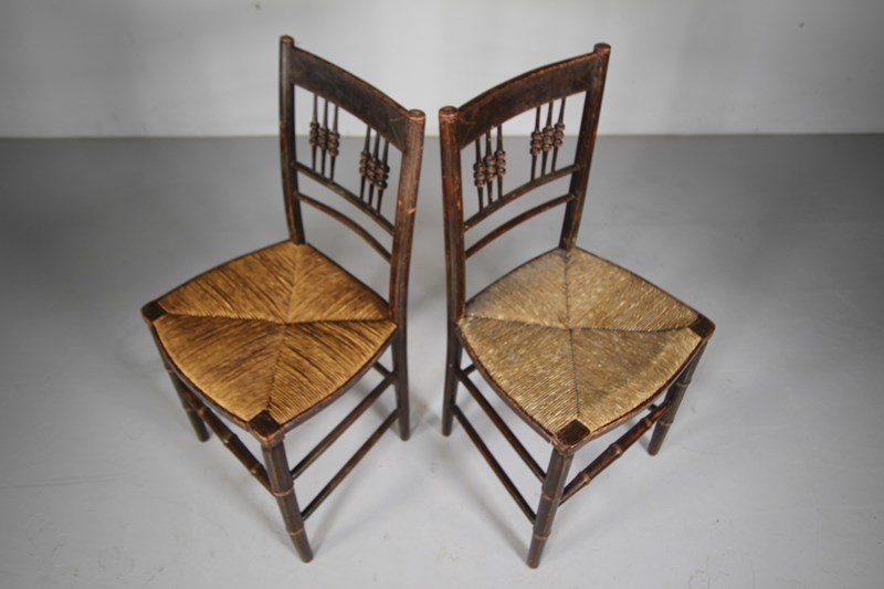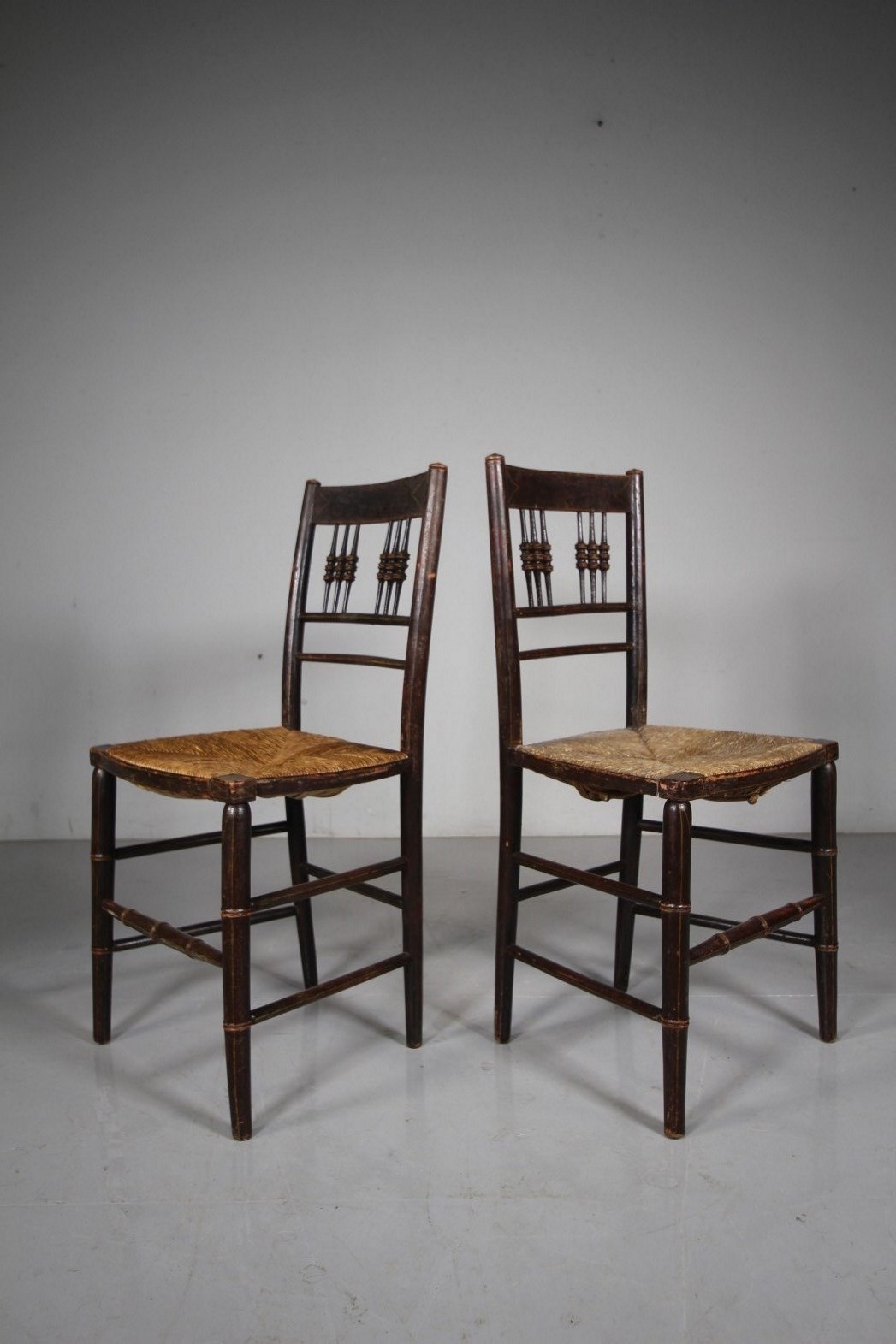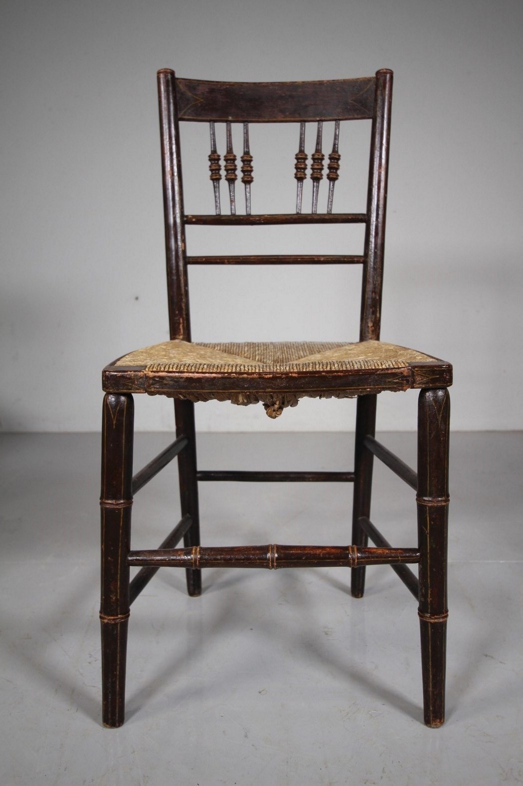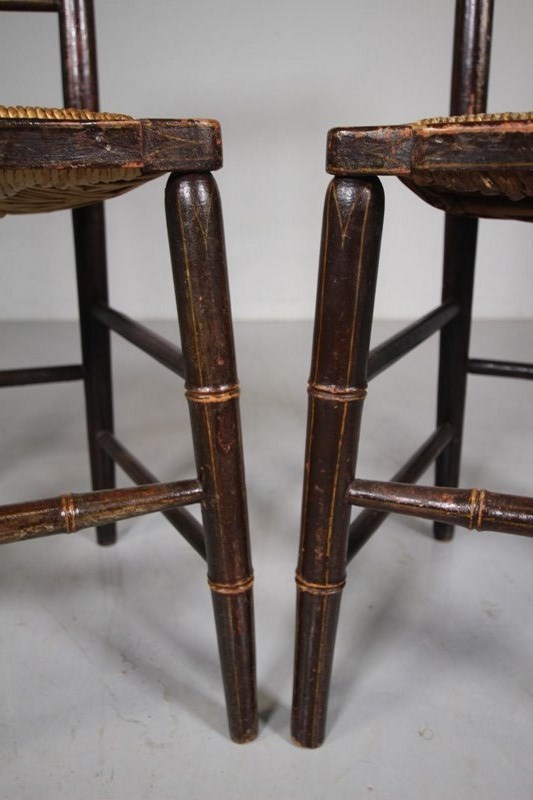 A lovely pair of English simulated bamboo antique dining or side chairs that are still in the original paint finish and having original line work decorations. They are both in superb strong and intact condition, each has the lovely traditional rush seats that are also in excellent condition. Great original survivors that feature spindle back rests with faux bamboo legs, stretchers and back spindles. English and dating to 1815.