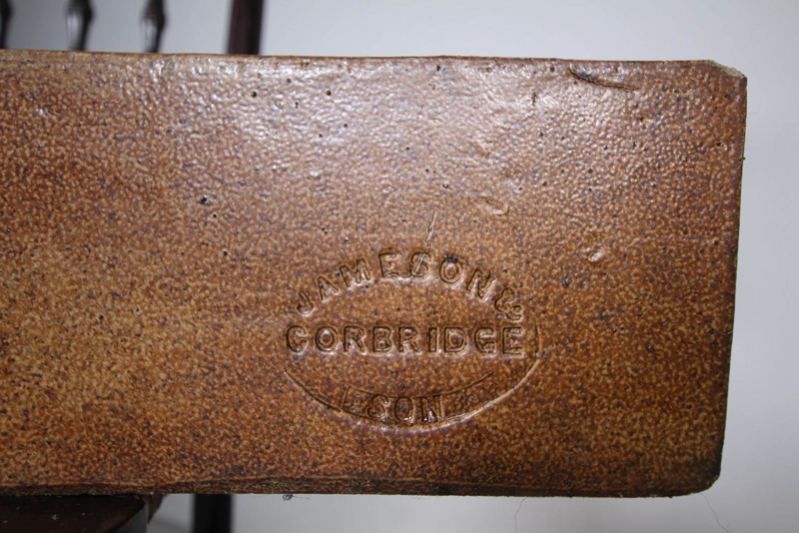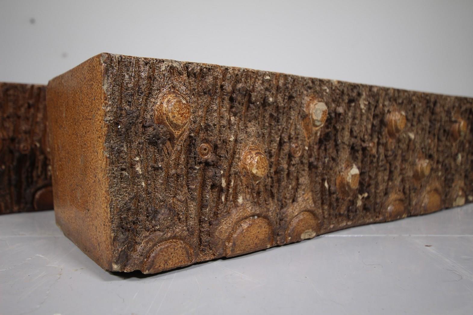 A rare and very decorative pair of English 19th century antique terracotta pottery window troughs in the lovely rustic style of faux bois. Stamped by the Corbridge maker, Jameson & Son. They are both in very good condition with no cracks, just a couple of small chips. We have two pairs available. They would look amazing planted up with Spring bulbs. A rare to find pair of English antique terracotta garden window troughs with a wonderful slip glaze finish.