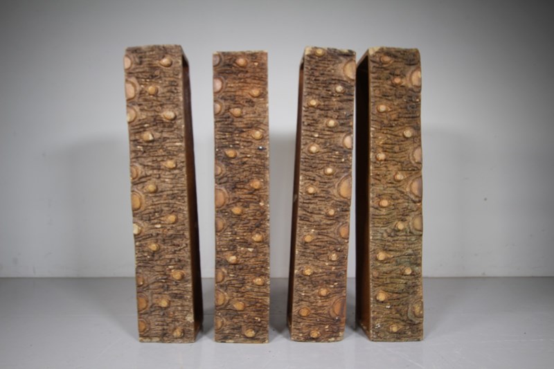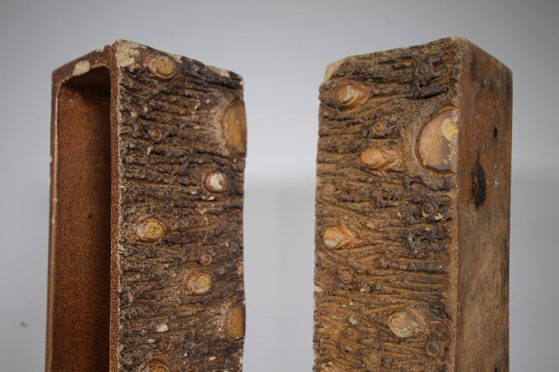 A rare and very decorative pair of English 19th century antique terracotta pottery window troughs in the lovely rustic style of faux bois. Stamped by the Corbridge maker, Jameson & Son. They are both in very good condition with no cracks, just a couple of small chips. We have two pairs available. They would look amazing planted up with Spring bulbs. A rare to find pair of English antique terracotta garden window troughs with a wonderful slip glaze finish.