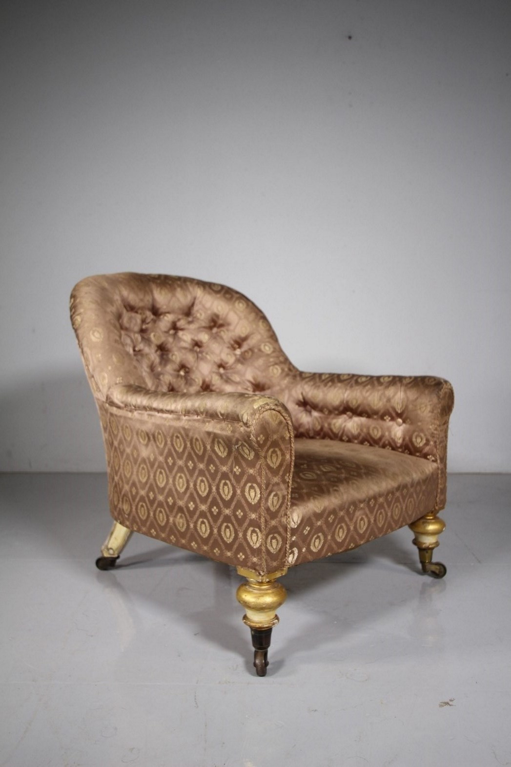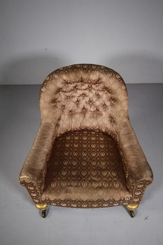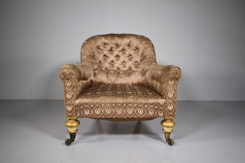 This is a beautiful, ample and comfortable English 19th century traditionally upholstered antique armchair, Gillows quality with the turned front legs and back legs, having decorative carvings and still in the original cream paint finish and with original gilt highlights. In superb, sound condition with no issues. English and dating to around 1870. A beautiful English country house piece of antique seating.