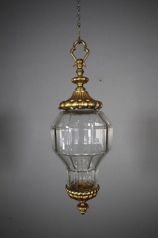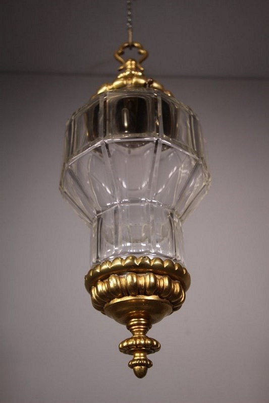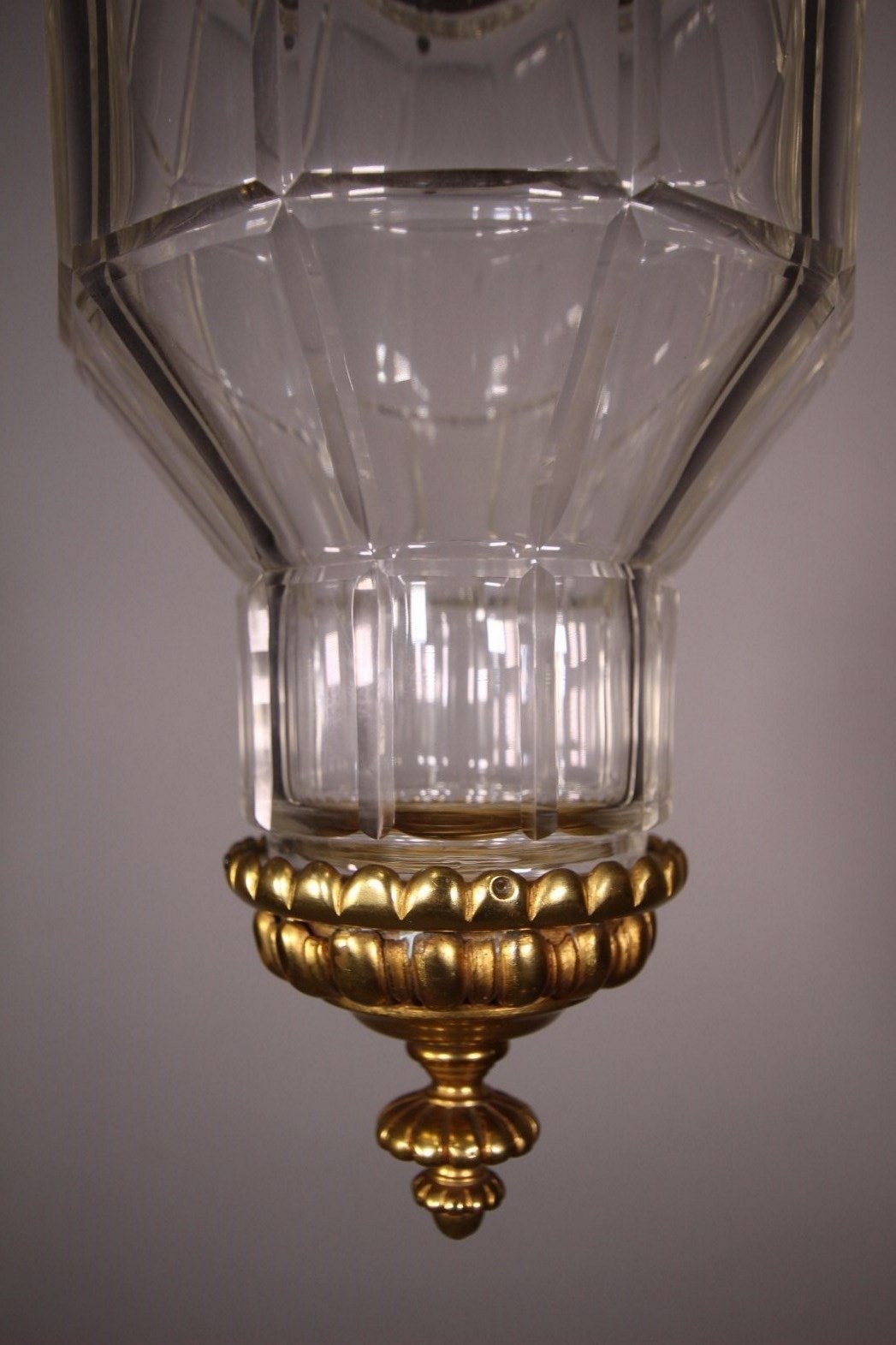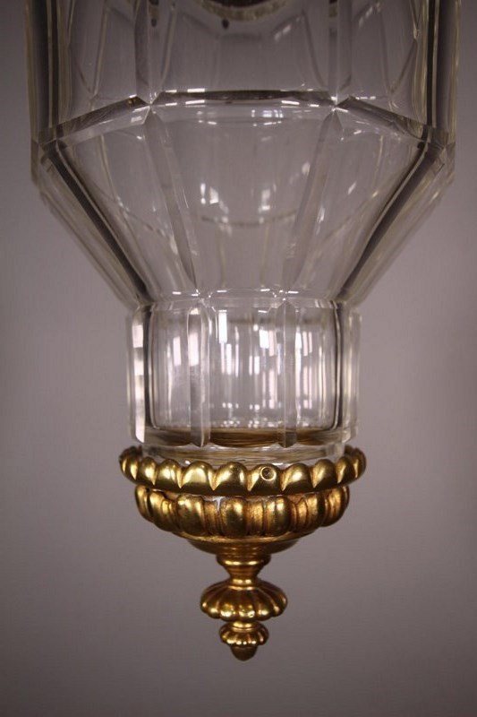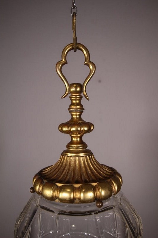 A high quality English antique cut glass hanging lantern that has a decorative ormolu top section with original hanging hook that has a hole to allow the wiring to pass through. To the base of this antique lantern is a lovely ormolu finial. All in excellent original and clean condition, dates to around 1850.