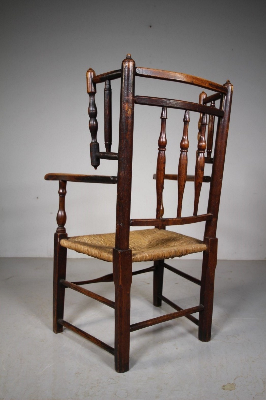 A very rare design of a country antique armchair that dates to 1800, listed and described in the wonderful Victor Chinnery’s book on traditional English furniture. Noted as being from the Cheshire area, this country antique armchair has spindle back and arm supports with an original rushed seat. Additionally the armchair has turn out wings, sometimes referred to as wool winders, but more probable for a drape to be hung around the person in the chair to keep out drafts, like a lambing chair. In superb, complete and very original condition and a beautiful colour. A rare model.
